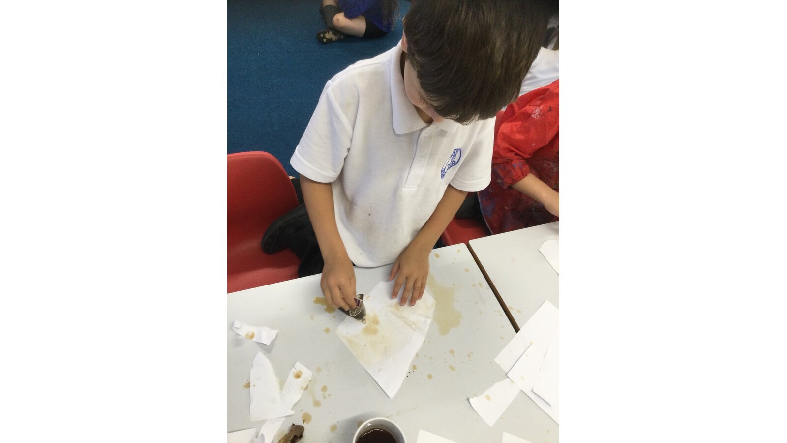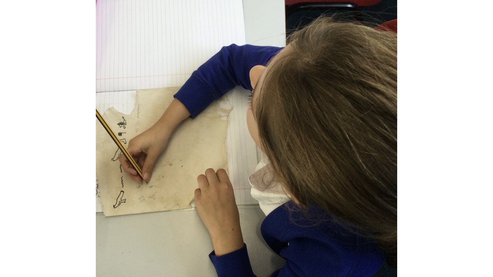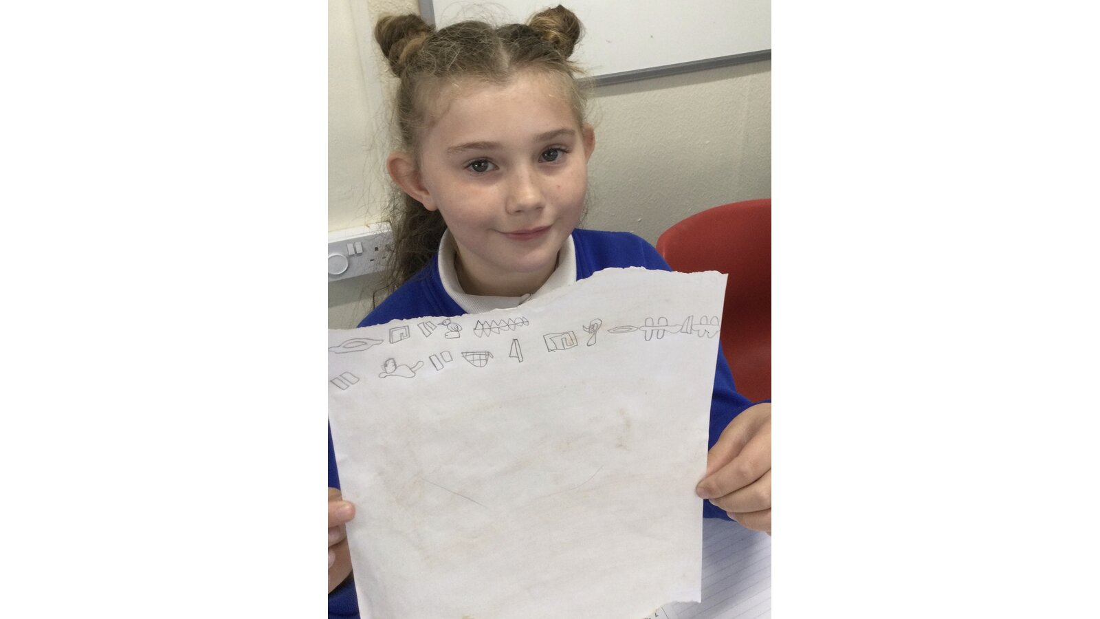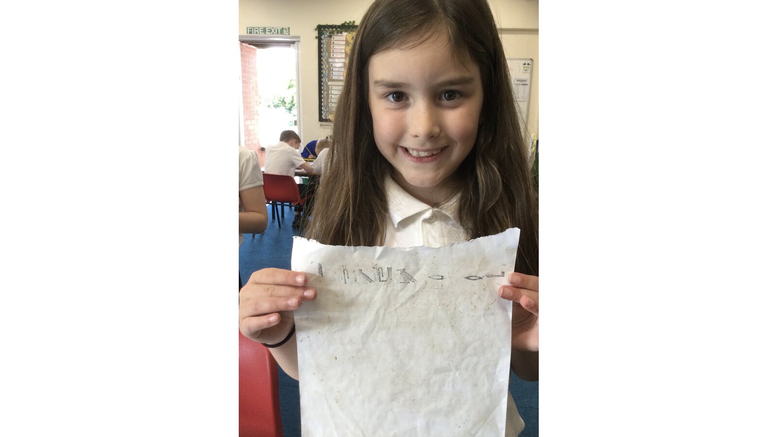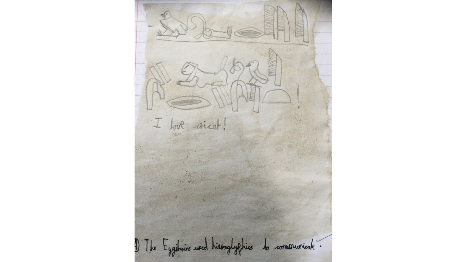 Today we stained paper with tea bags and scrunched the edges to make it look like papyrus paper. We then learnt about how Ancient Egyptians communicated around 4000 years ago and used hieroglyphics to write our names and a secret message on our paper.