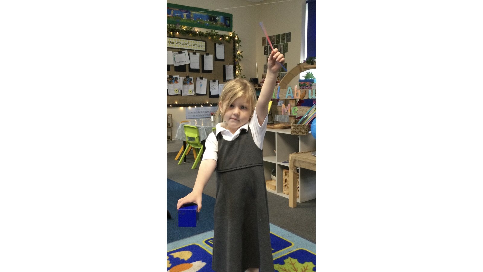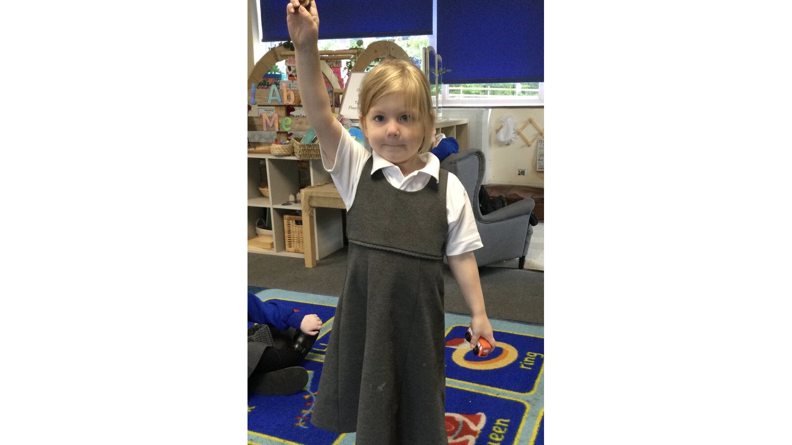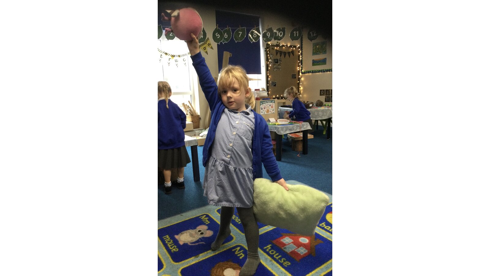 We used our bodies as a balance scale to compare the mass of two objects. If the object was the heaviest of the two items, the children knew to put their arm down and if the object was lighter, their arm went up.