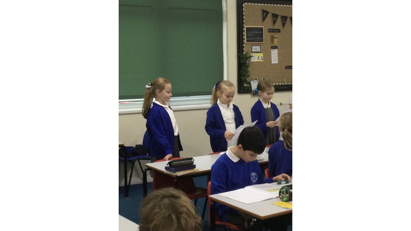 Today we read a selection of poems about war. We chose our favourite to perform to the class, following tips from the author Michael Rosen. He explained the importance of things such as facial expression, hand gestures, changing the tone of your voice and using plenty of expression to add to the excitement of hearing a poem.