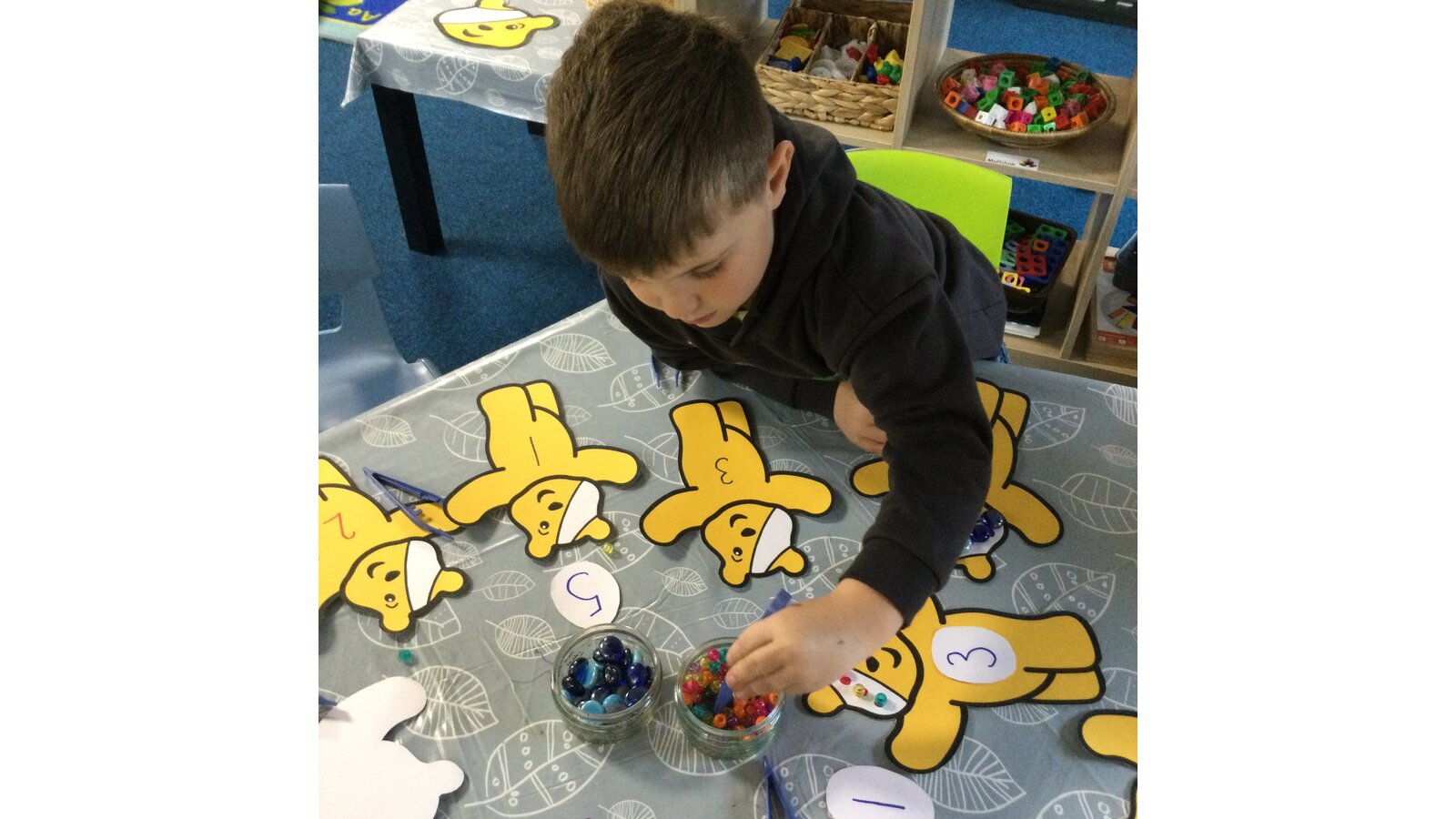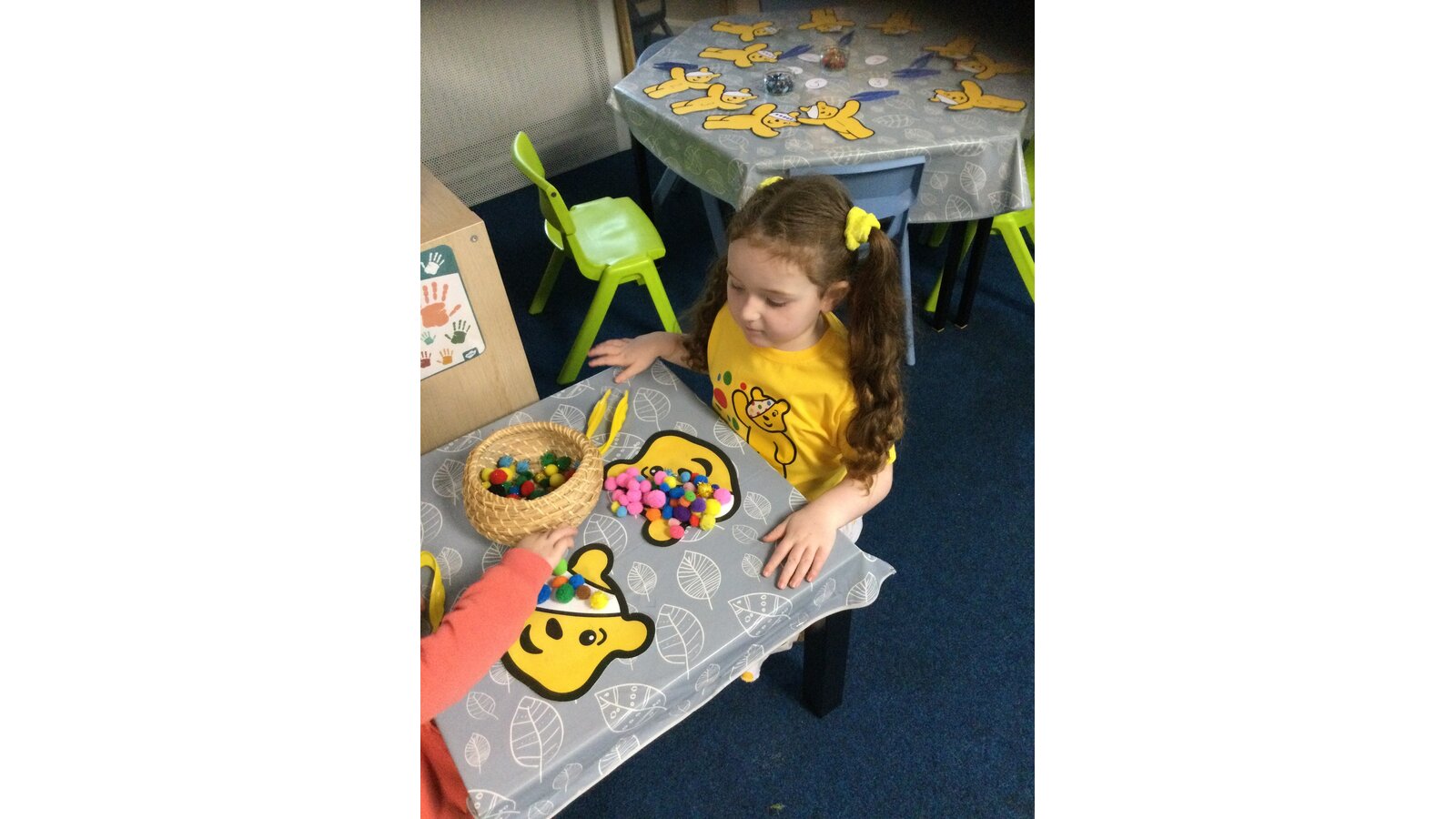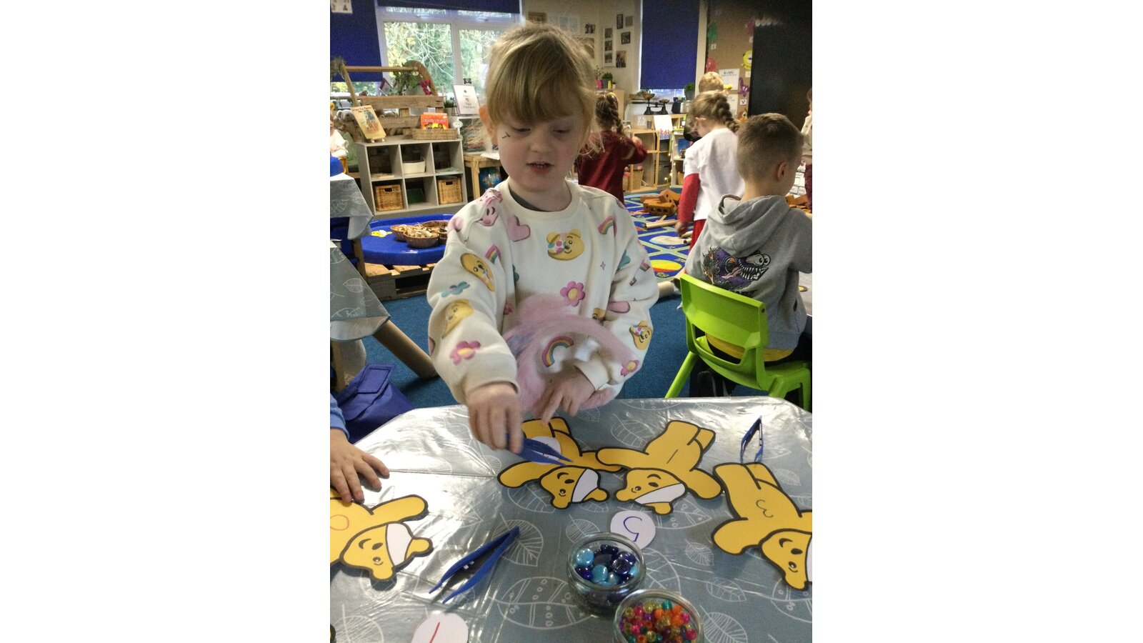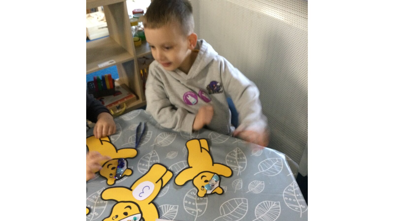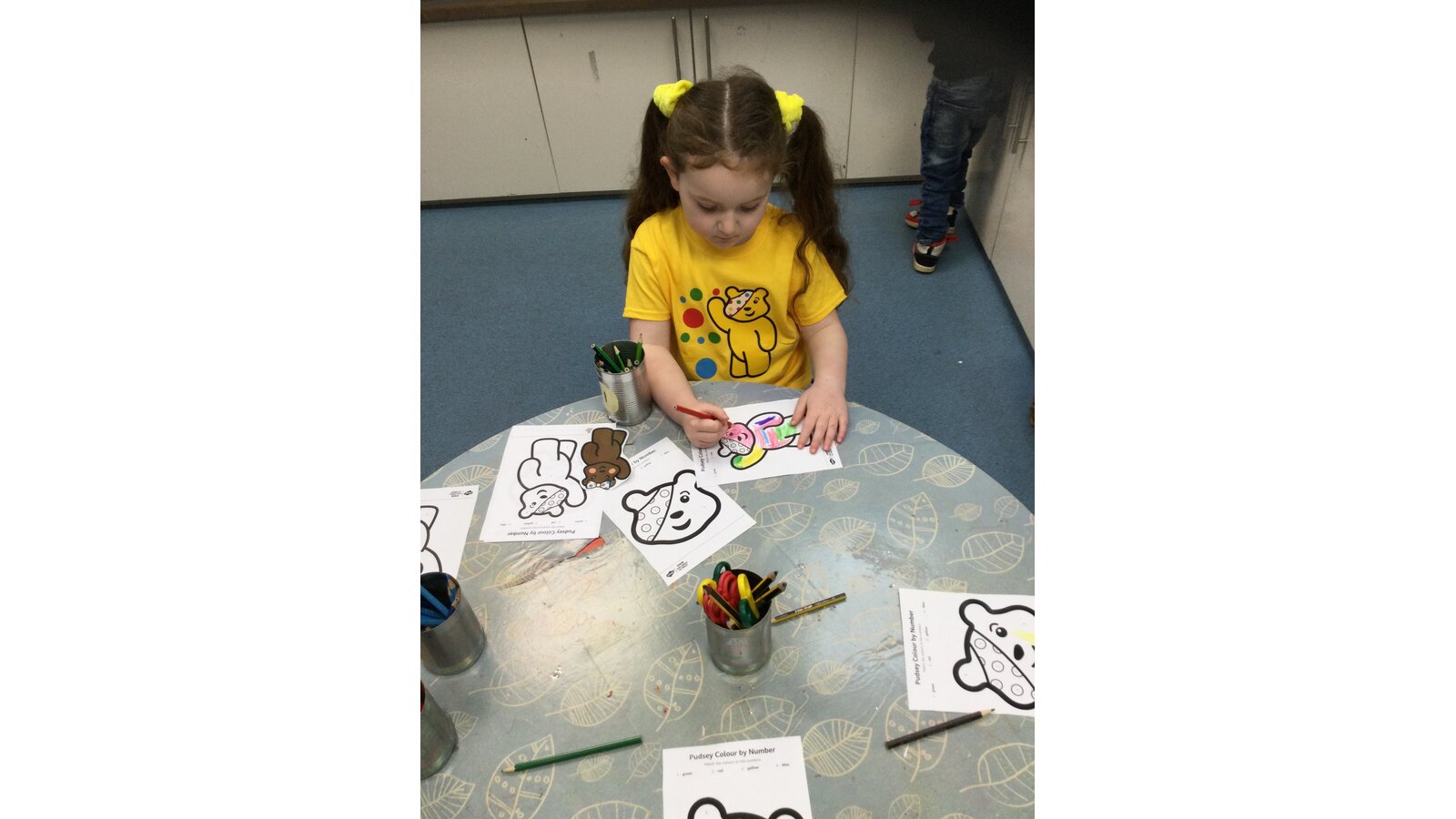The children have helped Pudsey find his missing spots from his bandana and write his list of things needed for school using their phonic skills. They have used their number recognition to make sure each Pudsey had the correct number of spots in the maths area and that each Pudsey was coloured in the correct colours at our creative table.