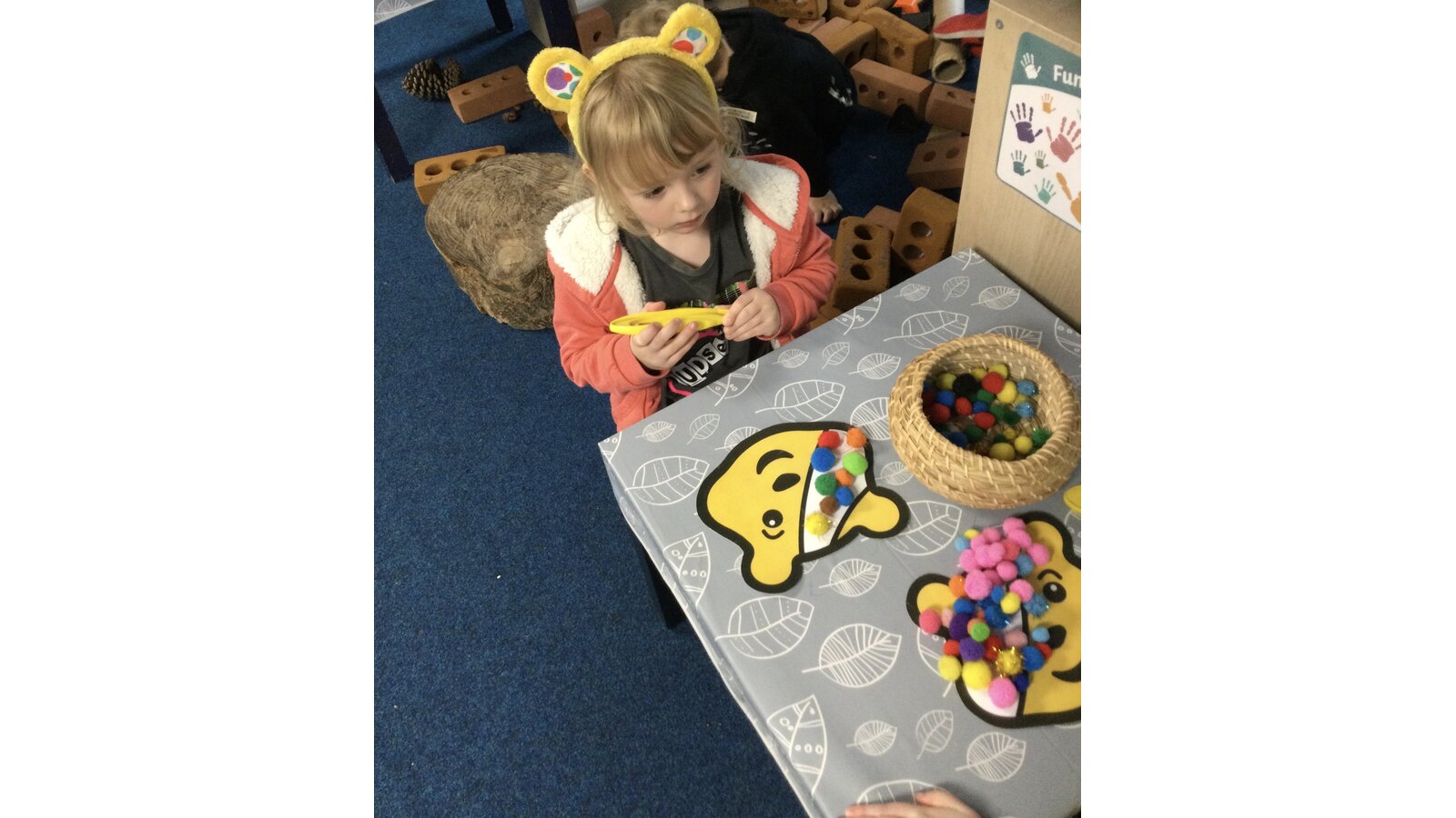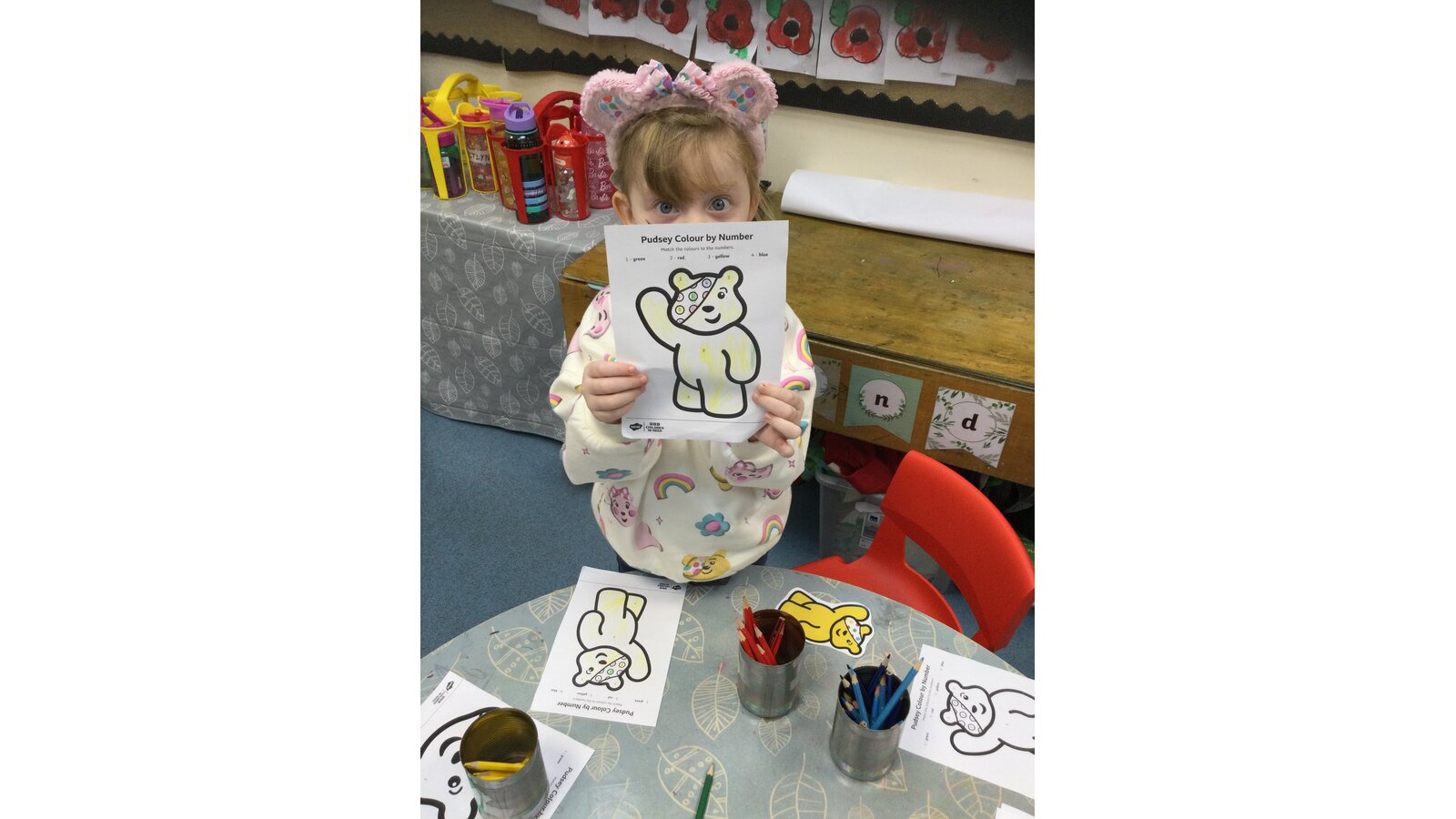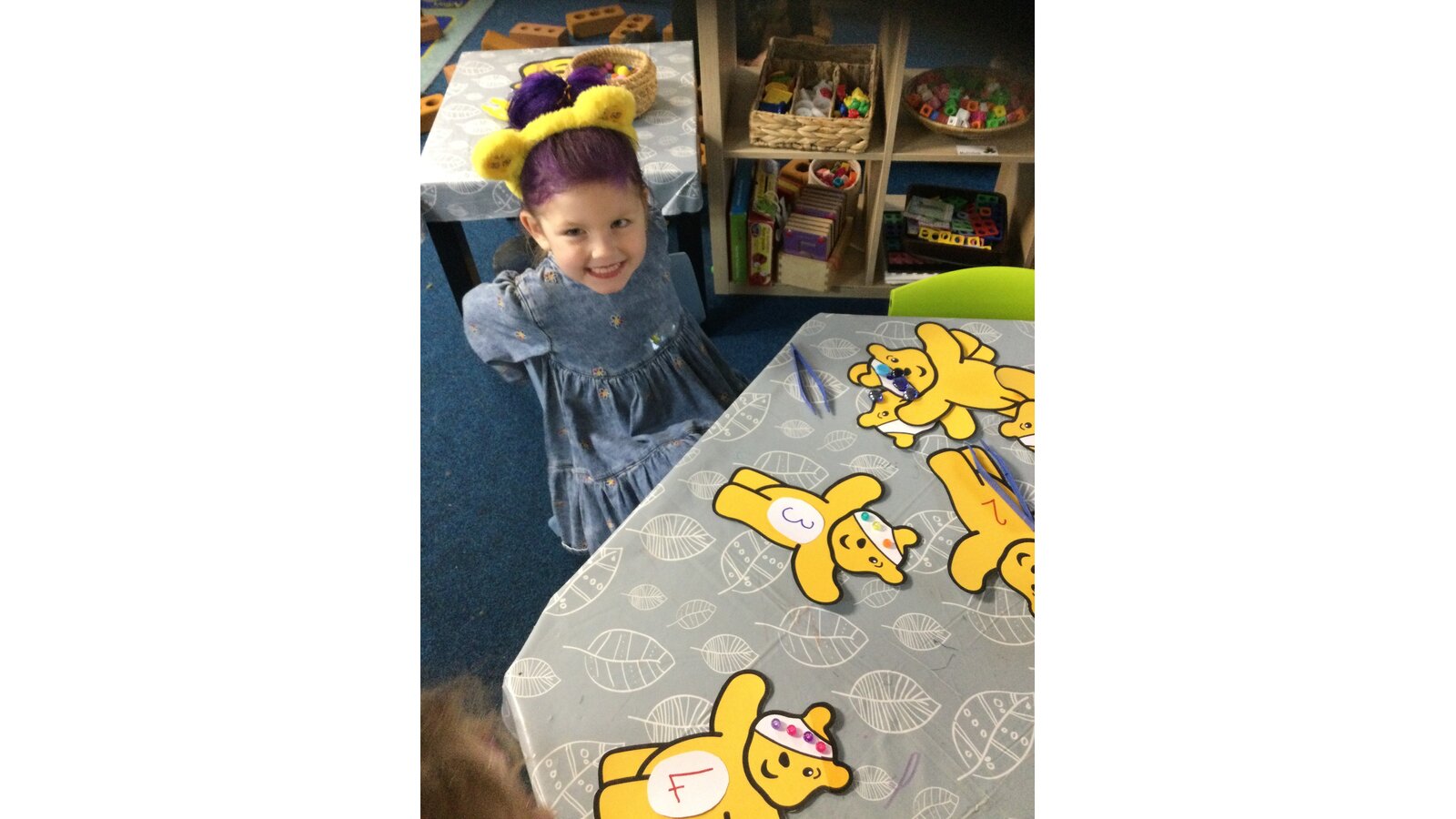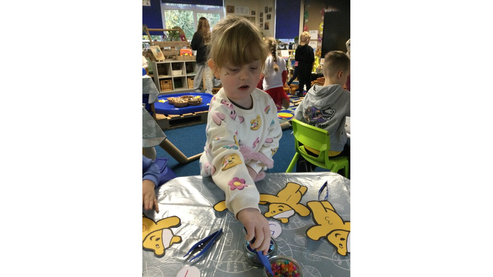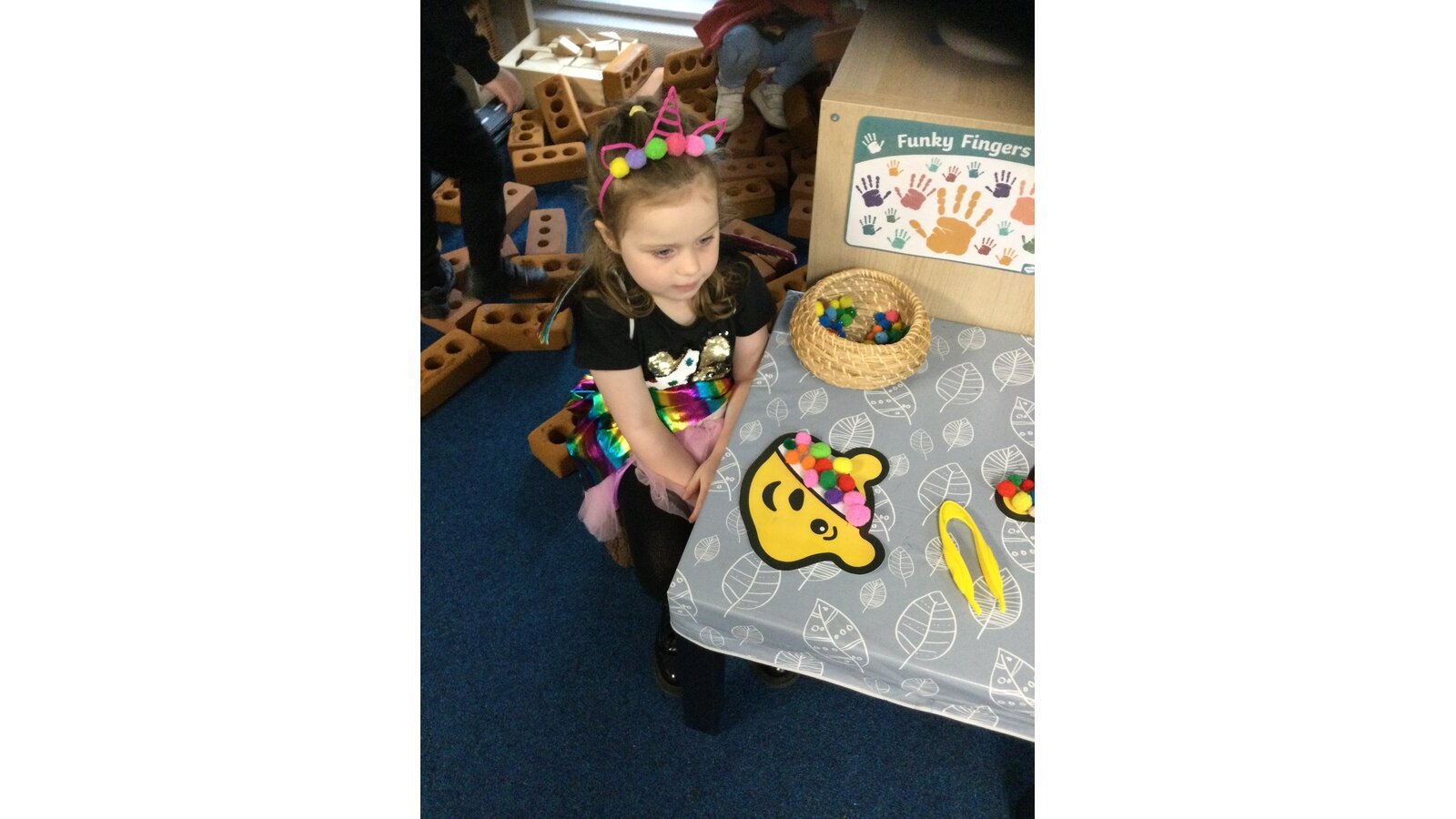 The children have helped Pudsey find his missing spots from his bandana and write his list of things needed for school using their phonic skills. They have used their number recognition to make sure each Pudsey had the correct number of spots in the maths area and that each Pudsey was coloured in the correct colours at our creative table.