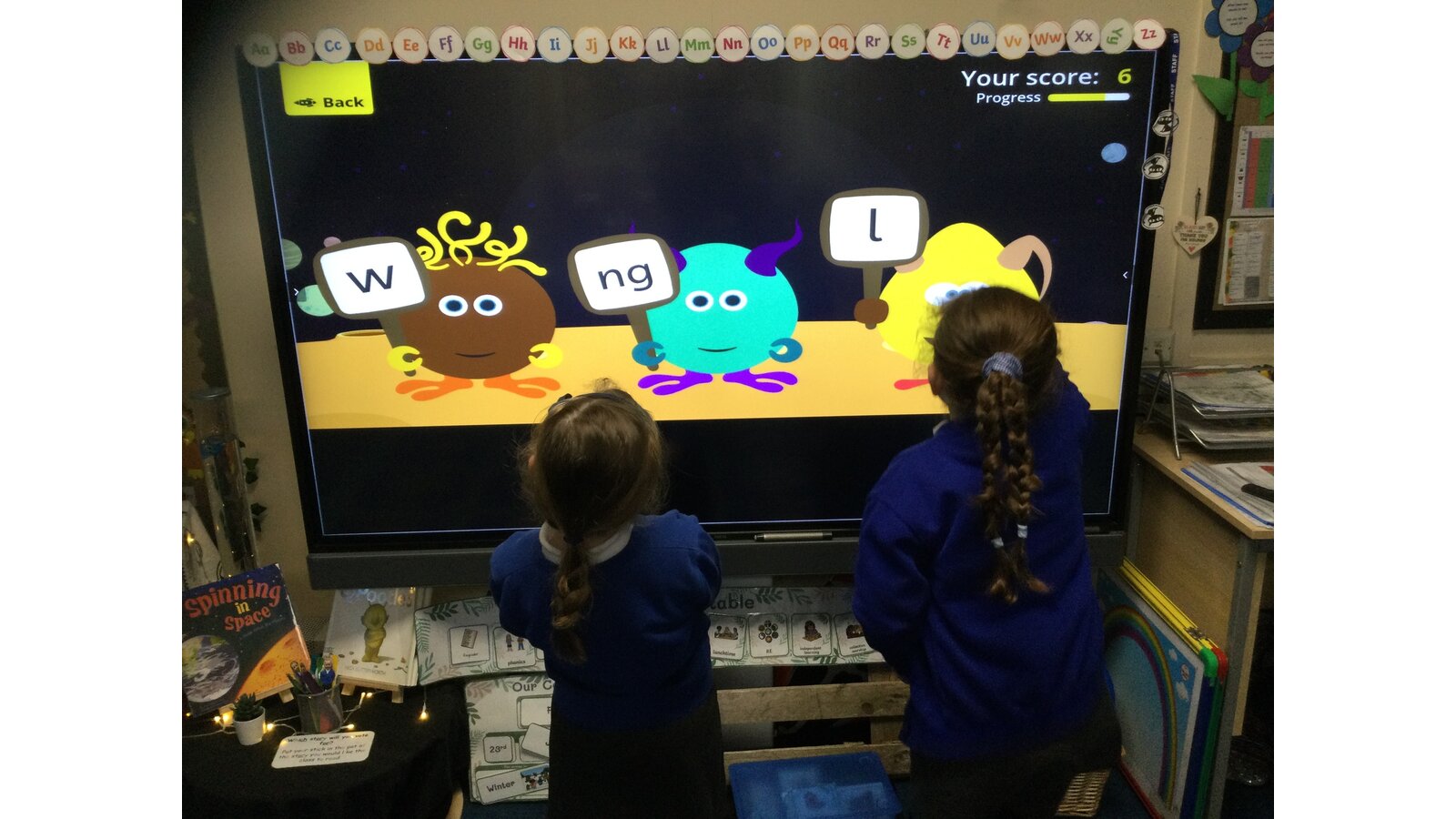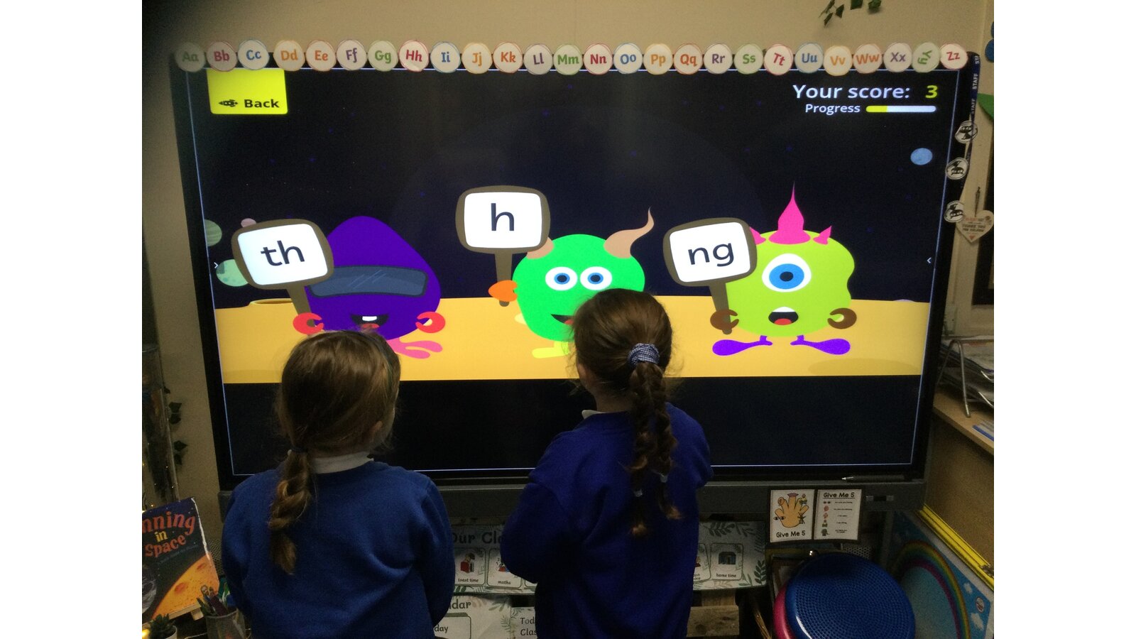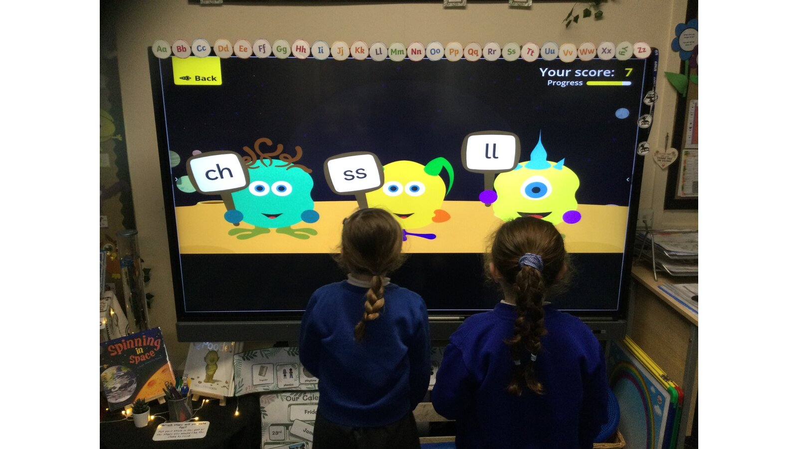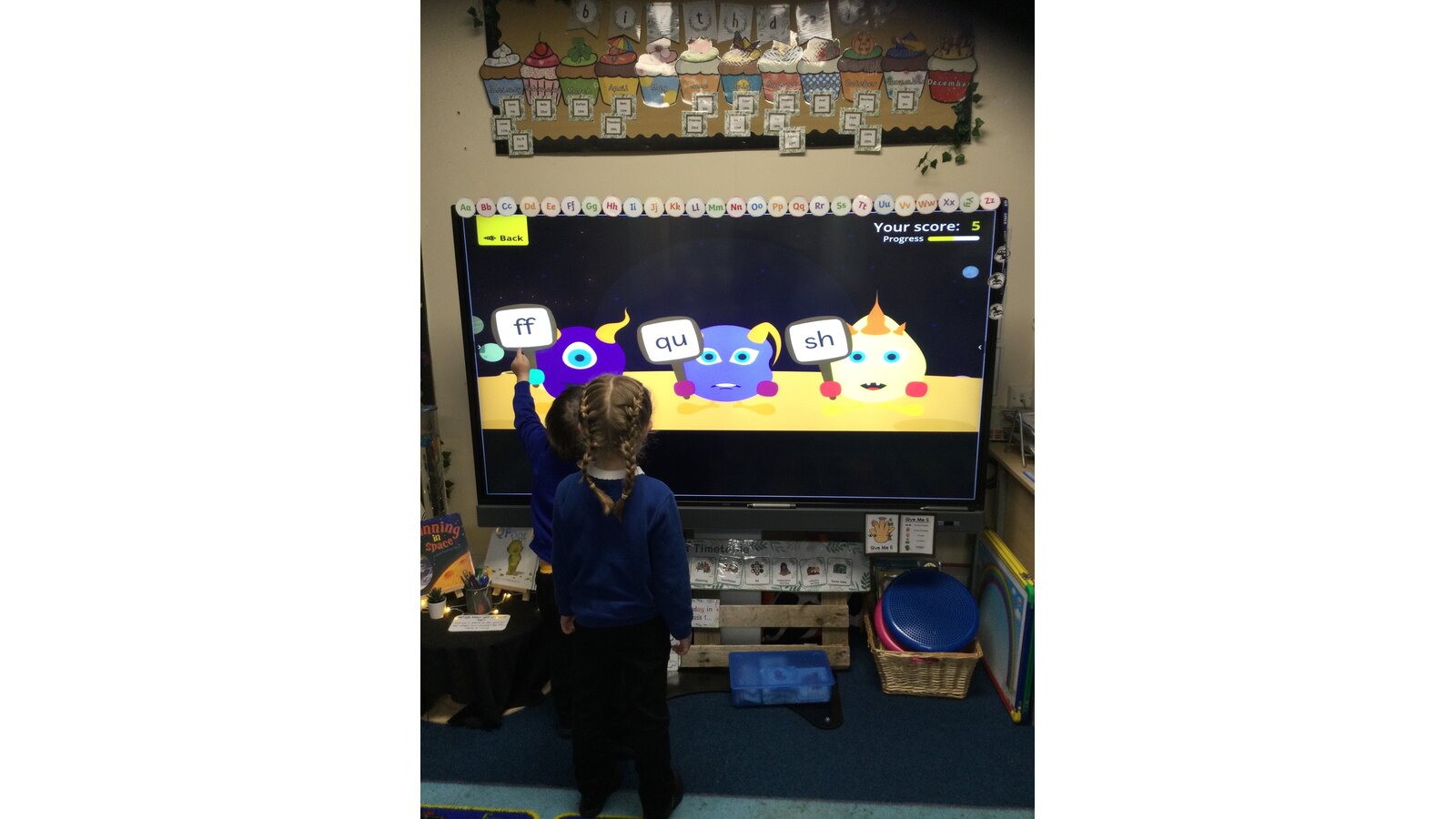 They had to listen carefully to the sound called and then click on the giggling alien who was holding that sound. They loved hearing the aliens’ giggle when they clicked on the right letter.