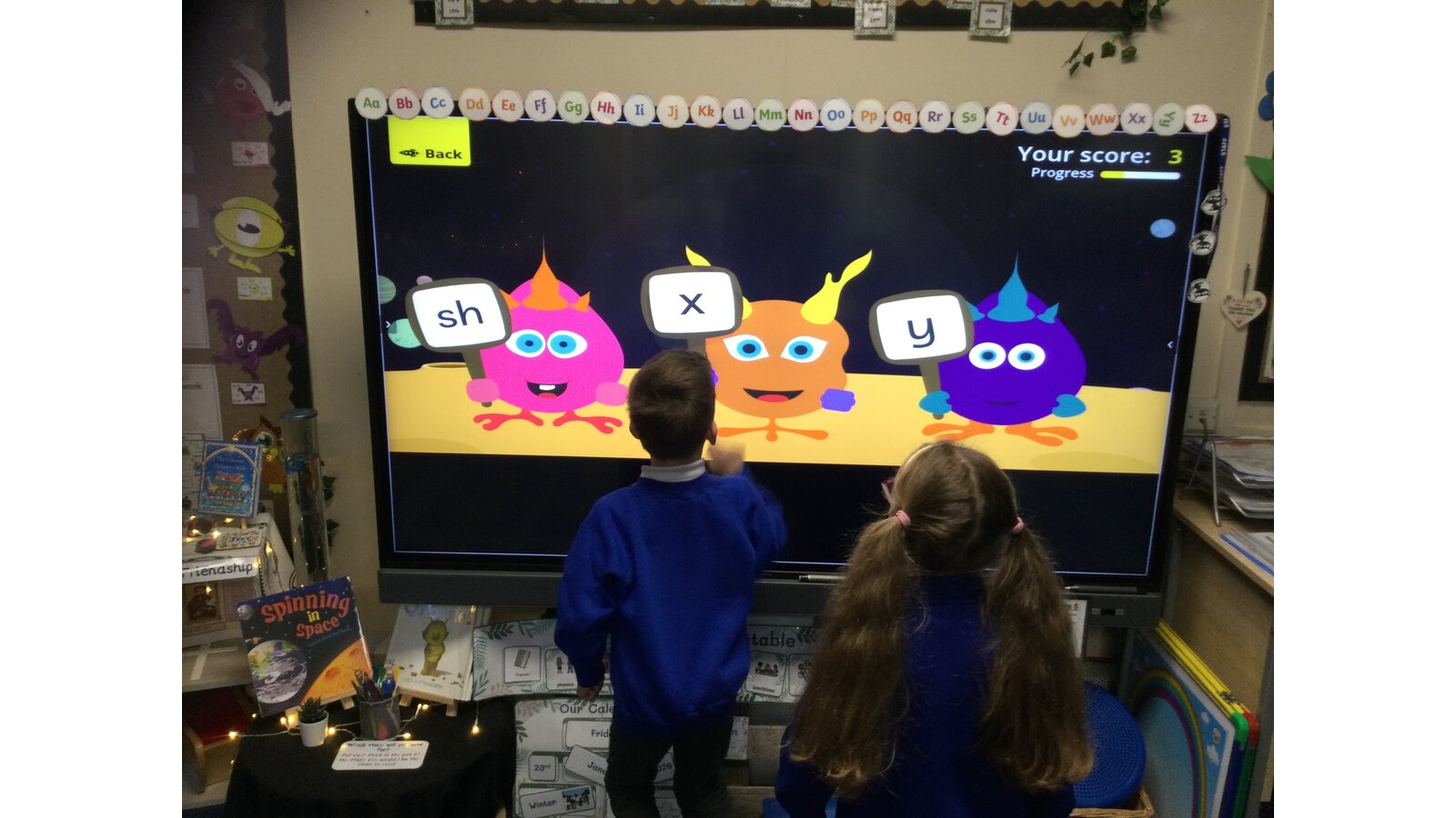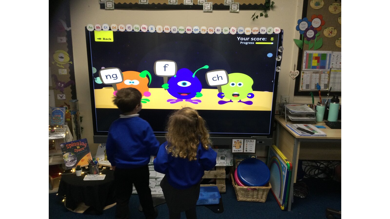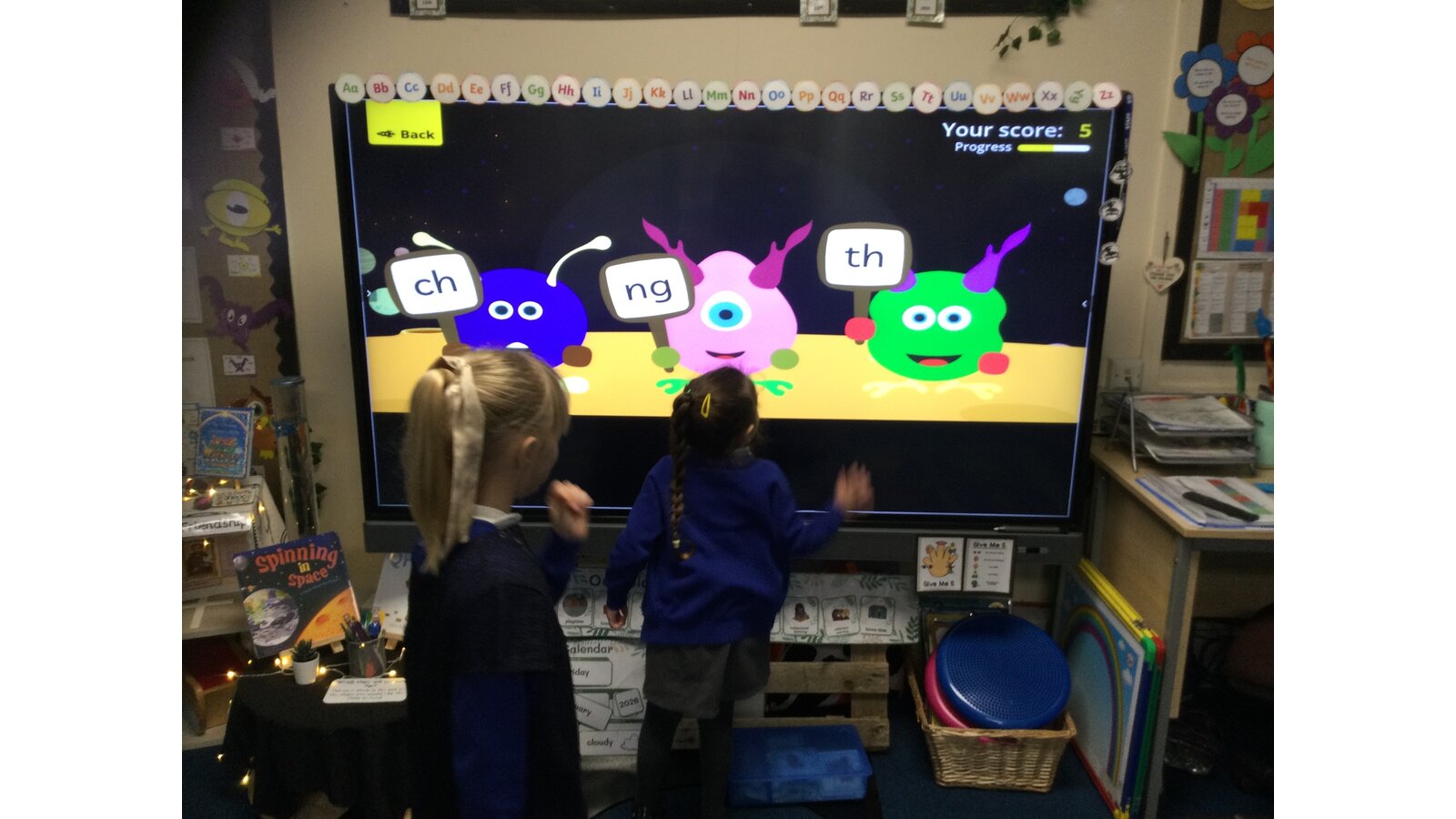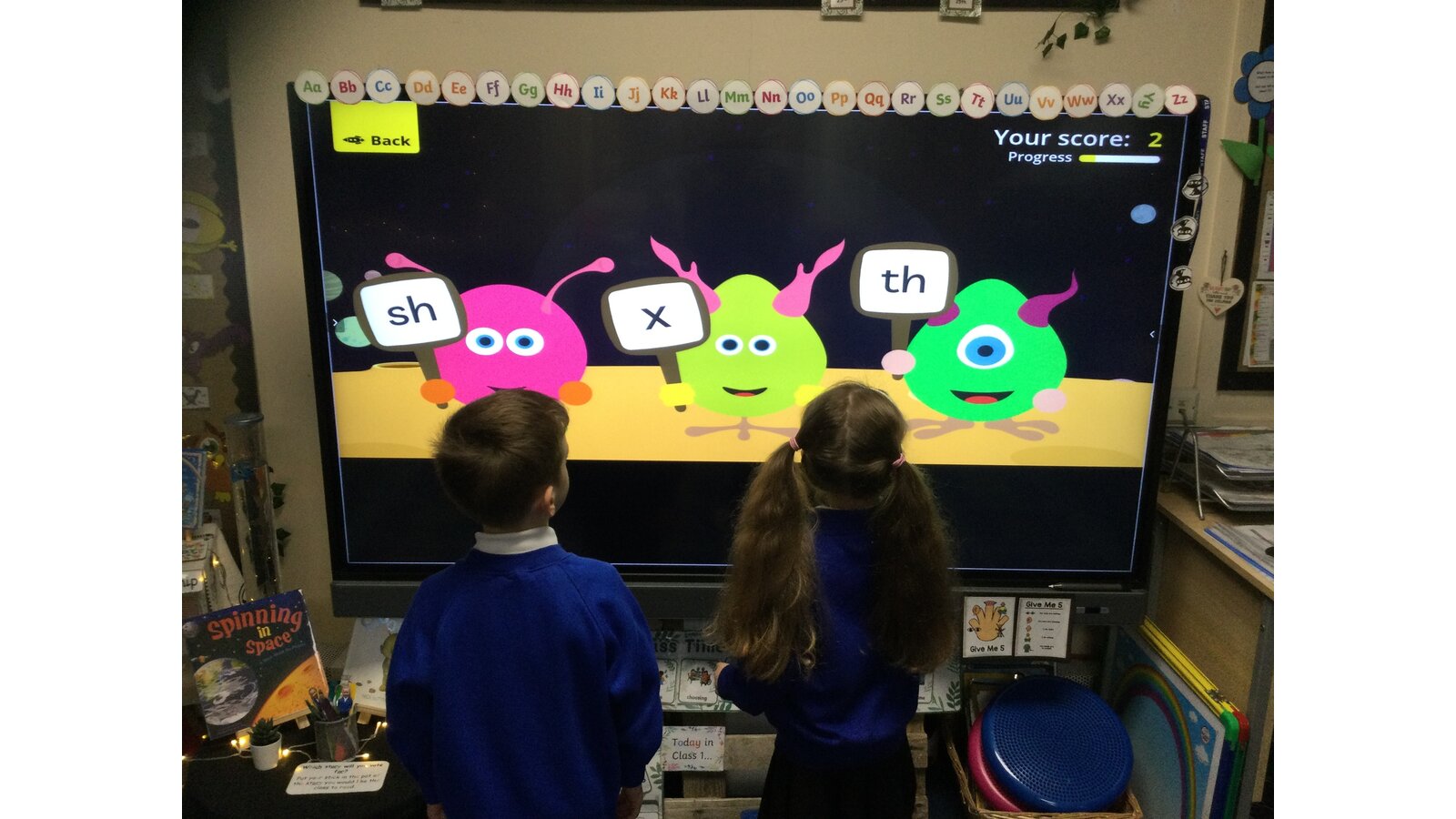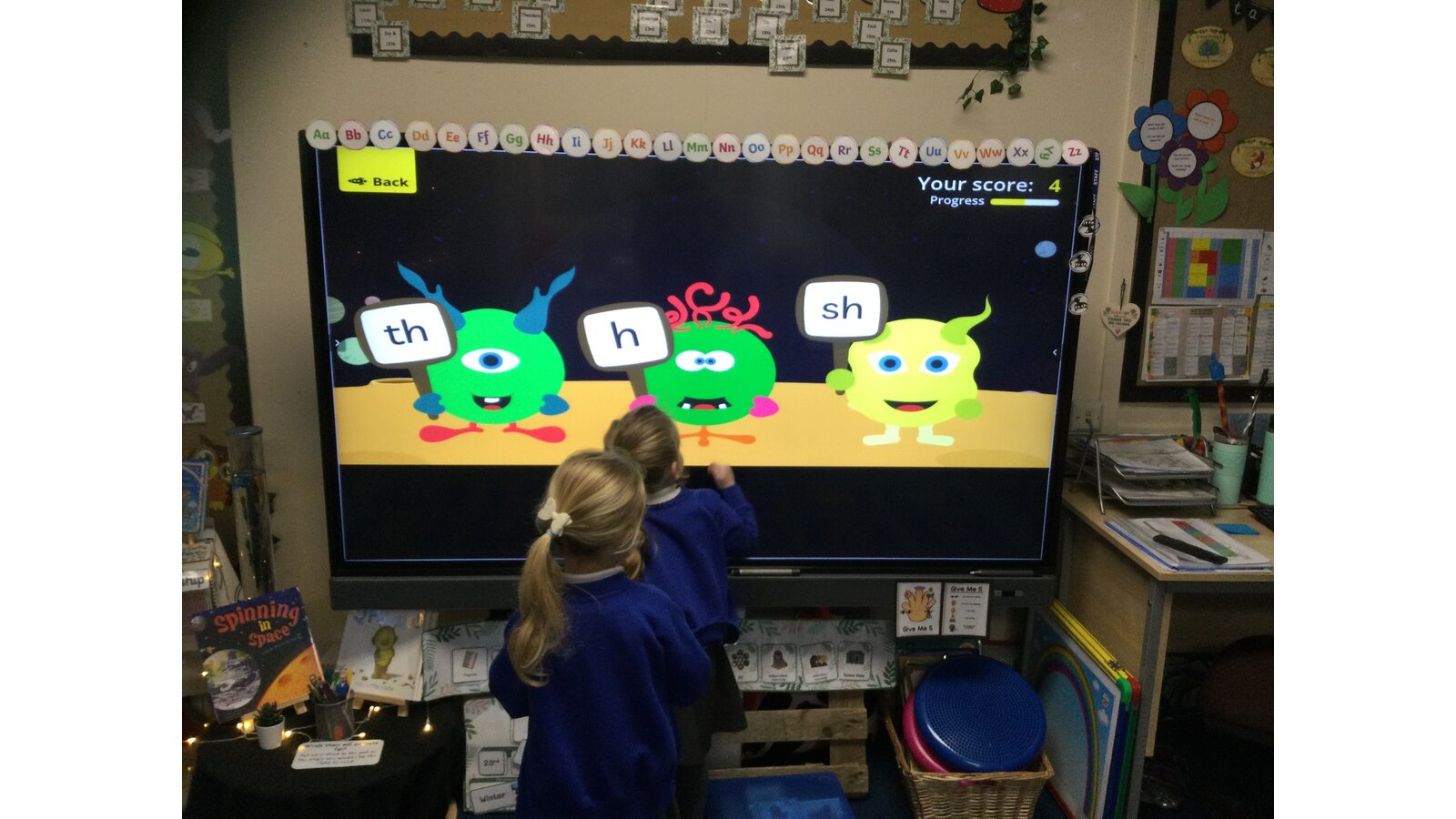 They had to listen carefully to the sound called and then click on the giggling alien who was holding that sound. They loved hearing the aliens’ giggle when they clicked on the right letter.
