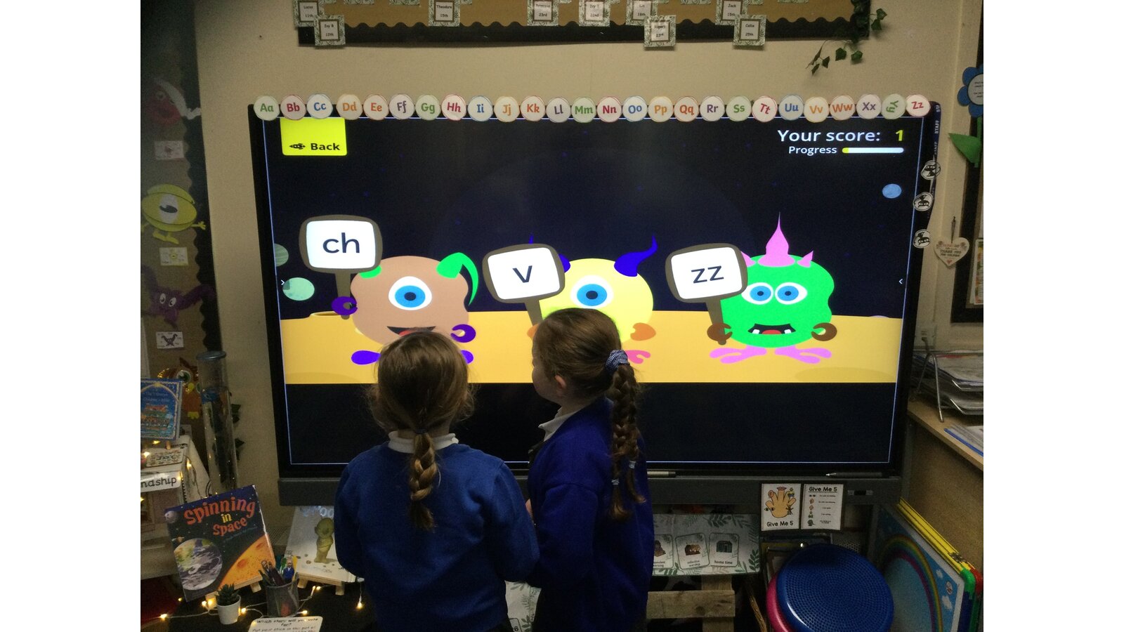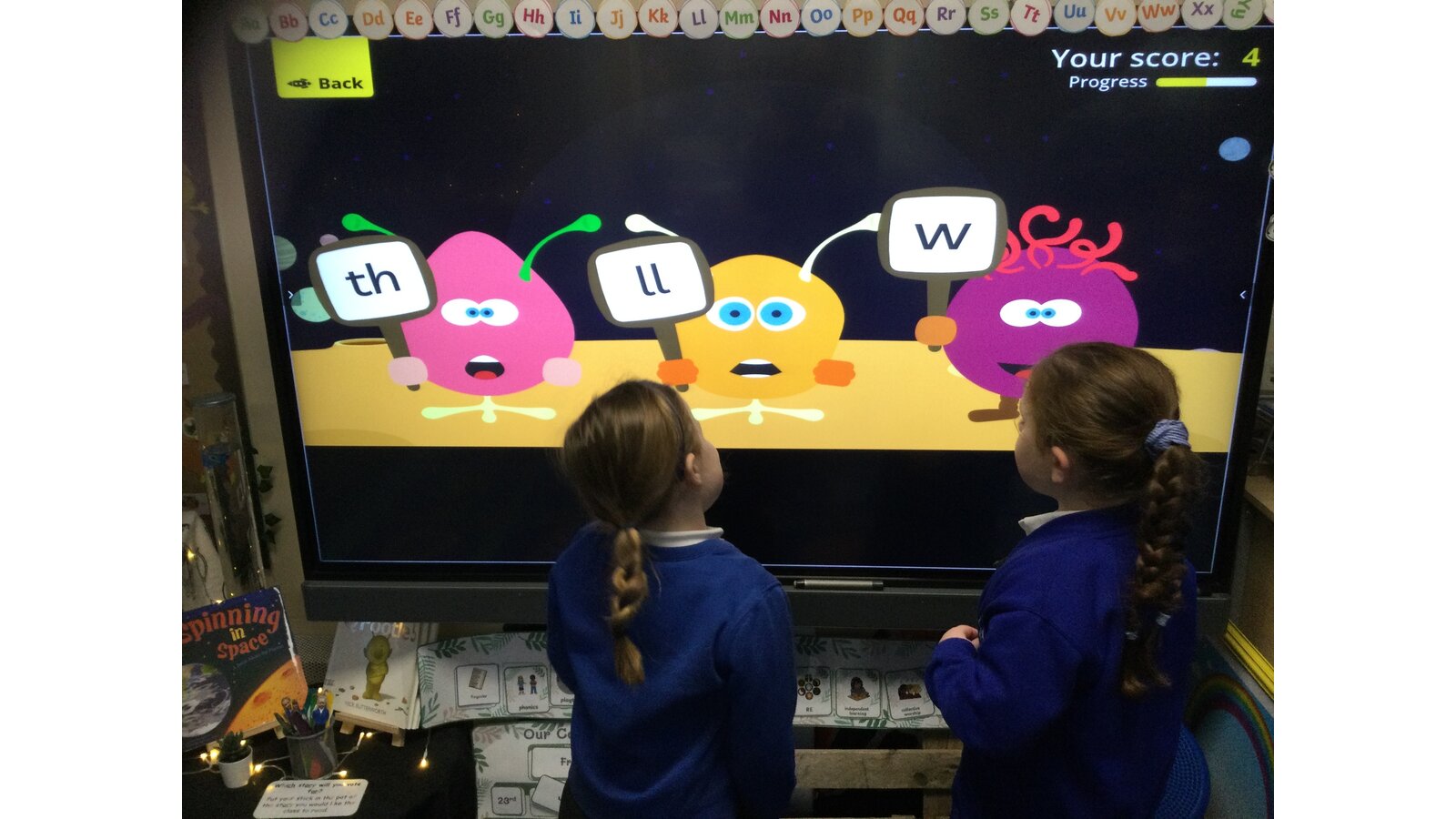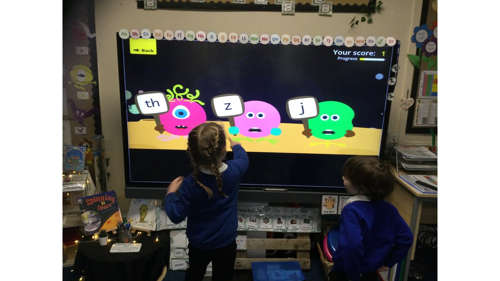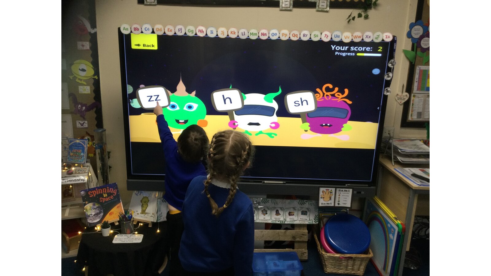 They had to listen carefully to the sound called and then click on the giggling alien who was holding that sound. They loved hearing the aliens’ giggle when they clicked on the right letter.
