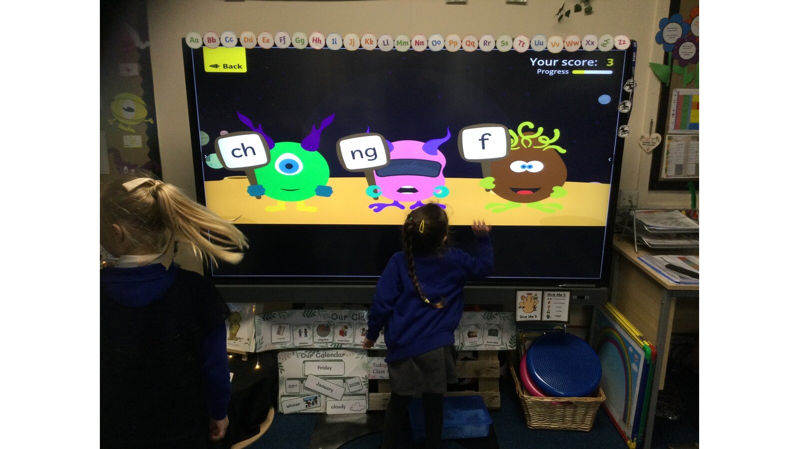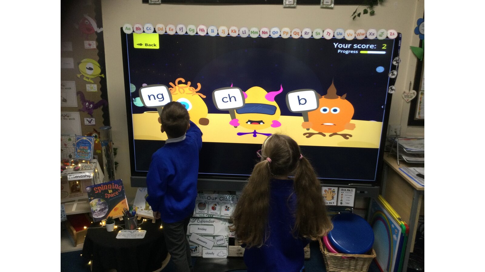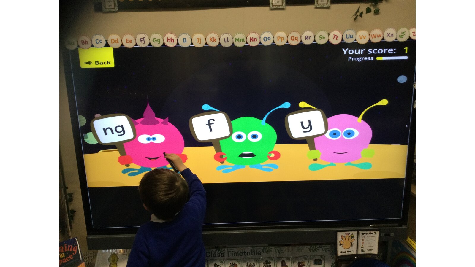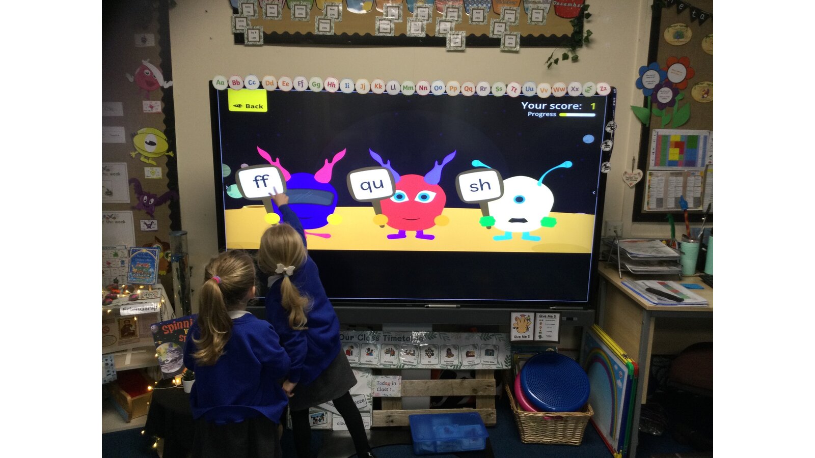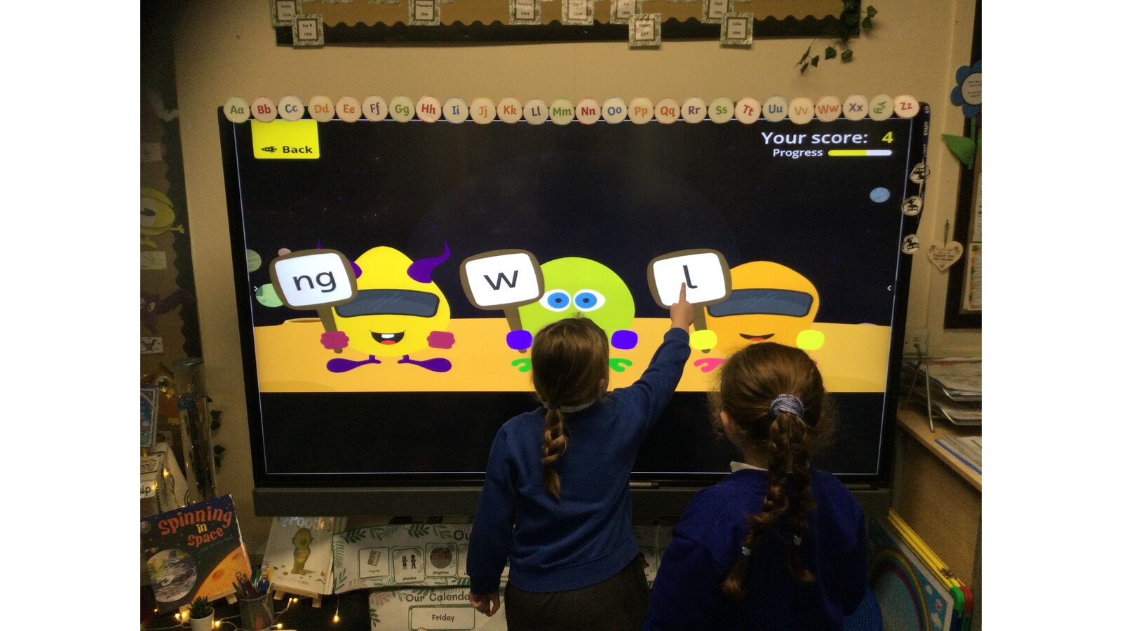 They had to listen carefully to the sound called and then click on the giggling alien who was holding that sound. They loved hearing the aliens’ giggle when they clicked on the right letter.