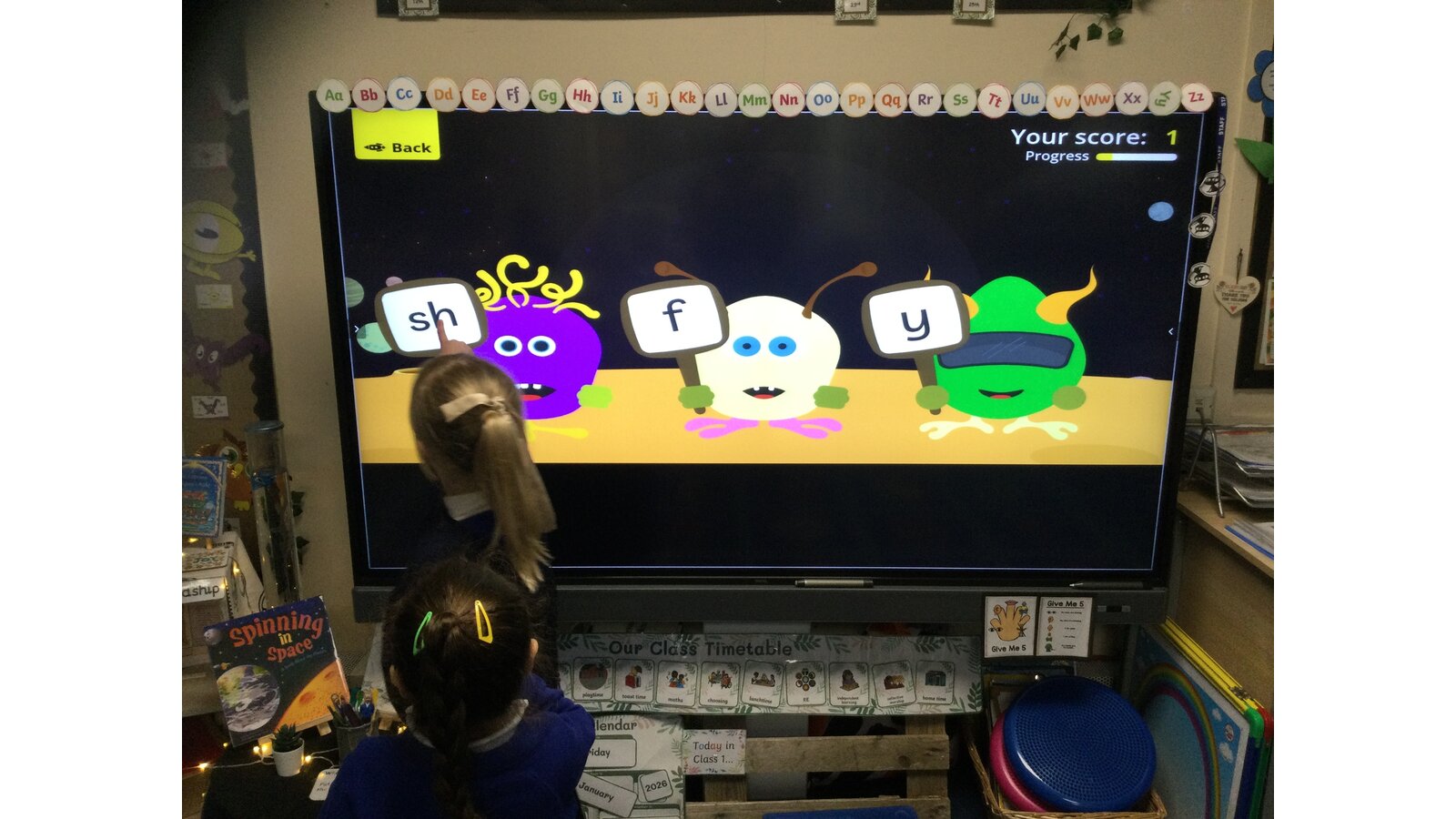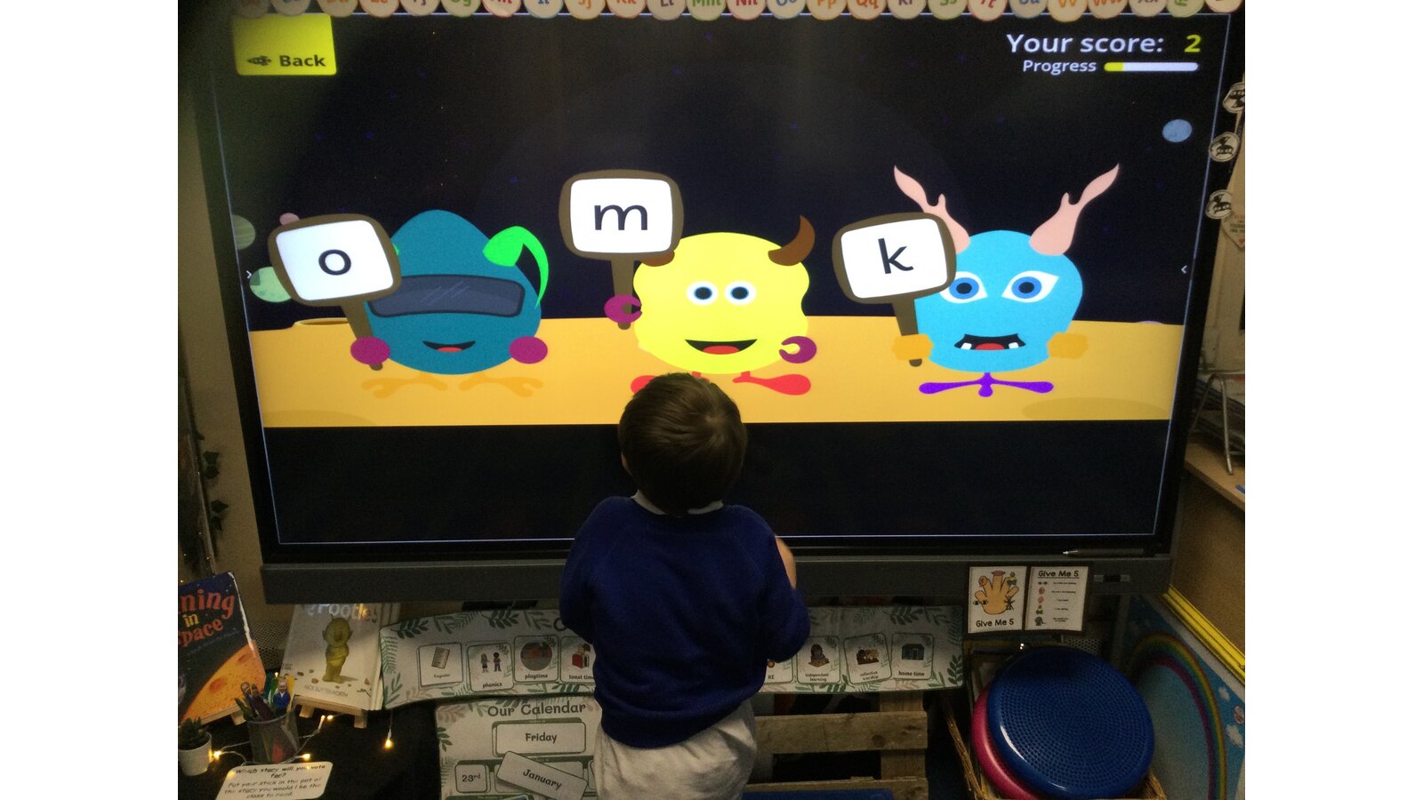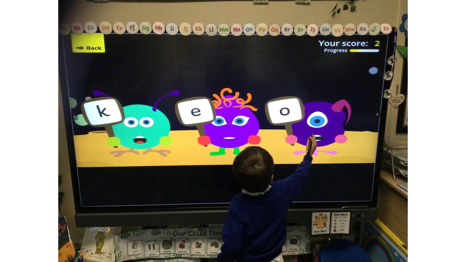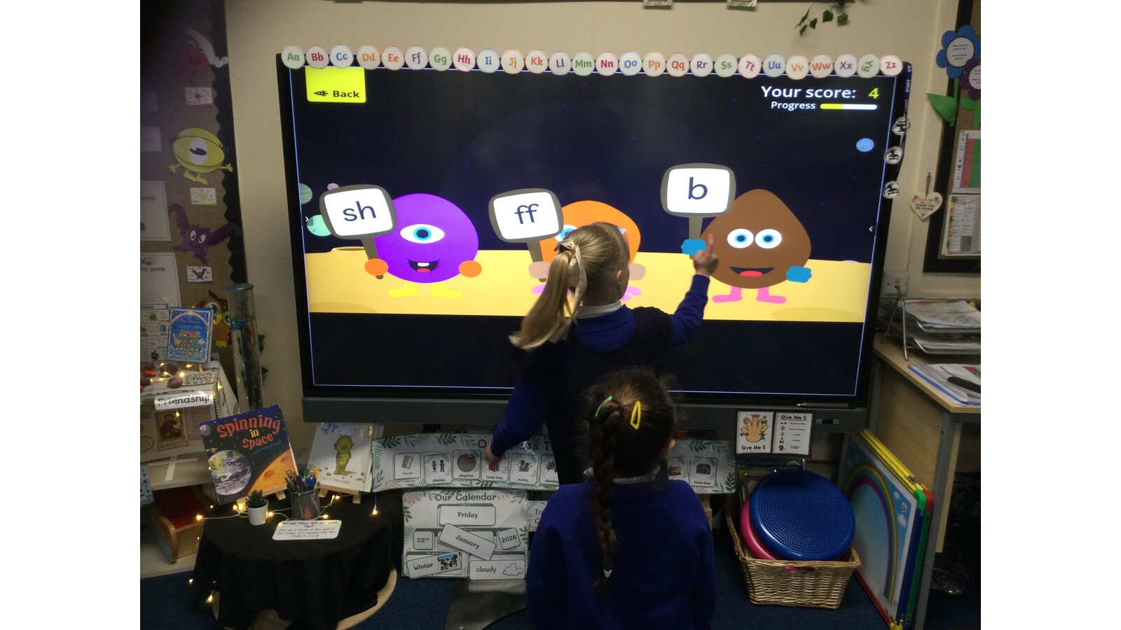 They had to listen carefully to the sound called and then click on the giggling alien who was holding that sound. They loved hearing the aliens’ giggle when they clicked on the right letter.