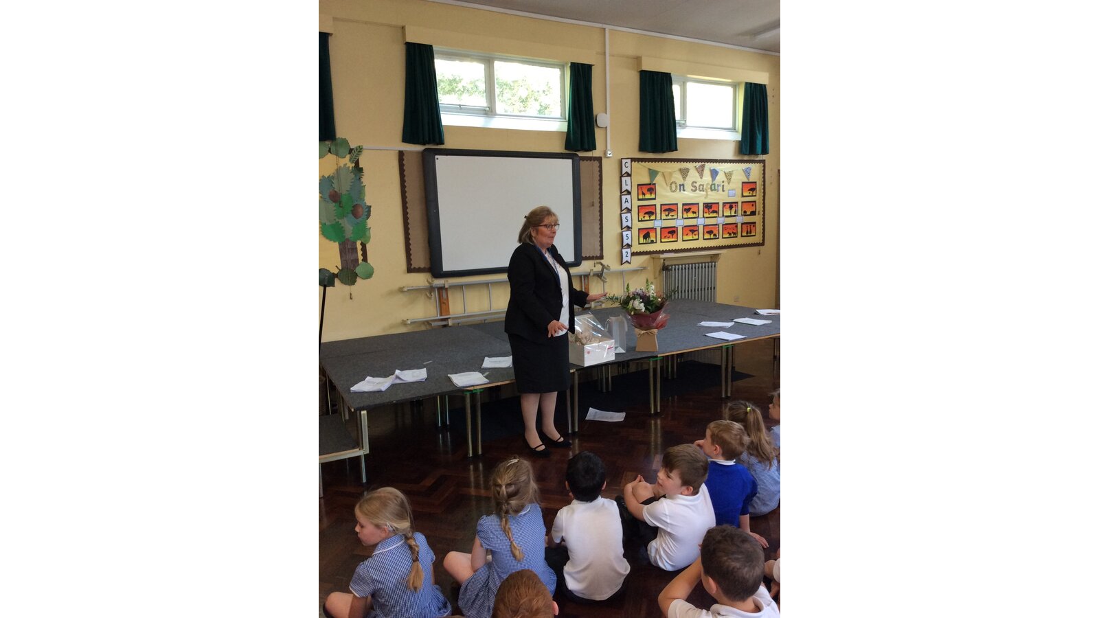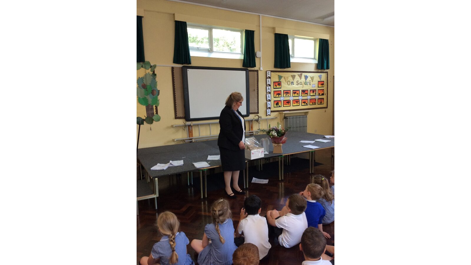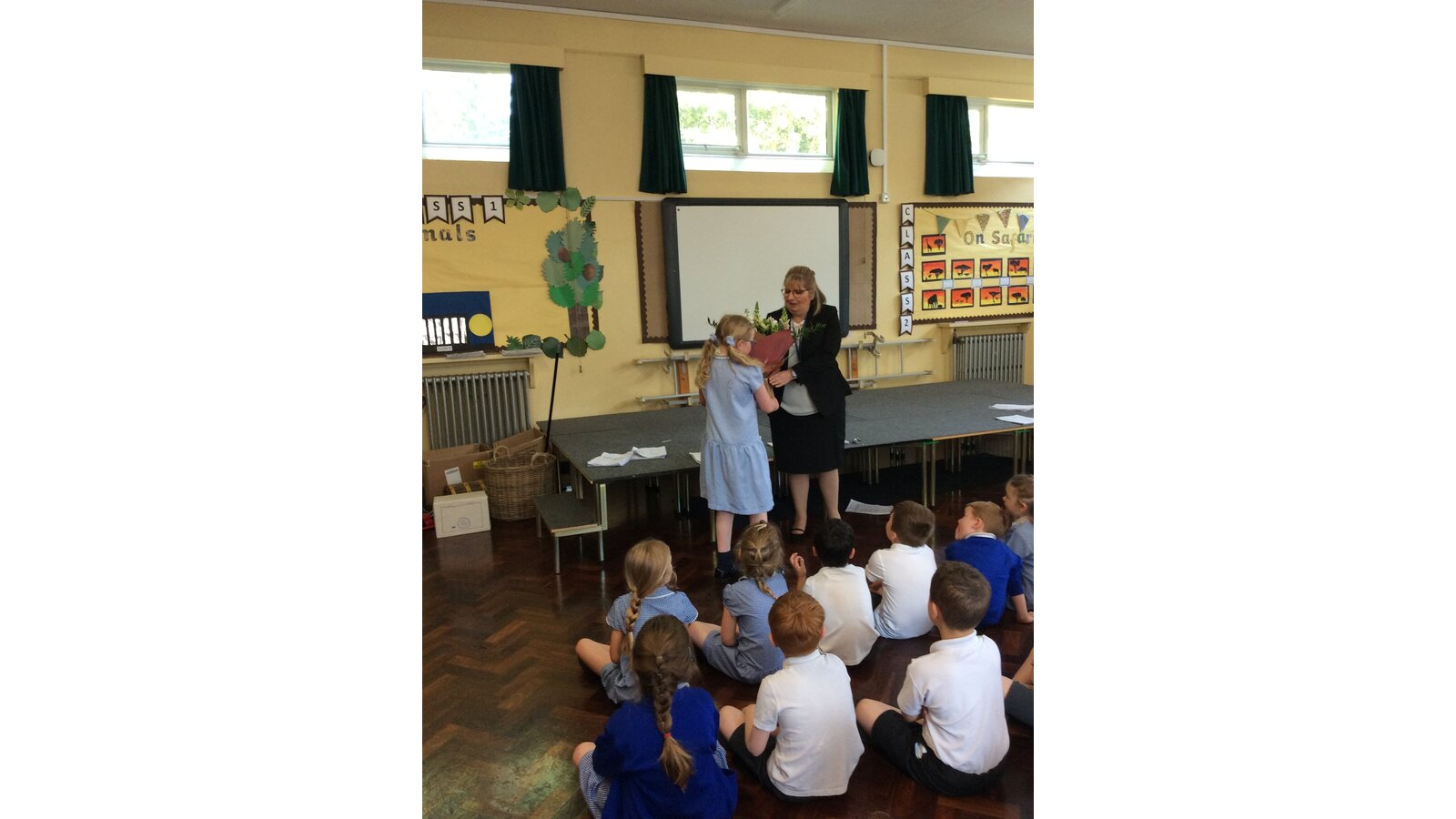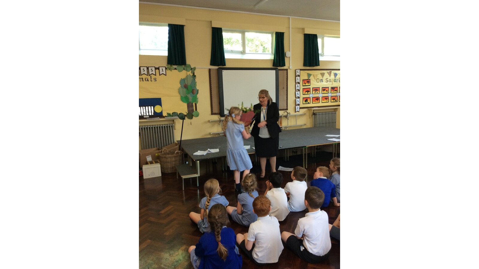 We surprised Mrs Fenton by singing to her in also special birthday assembly . She was very happy with the gifts and cake we gave her too.
