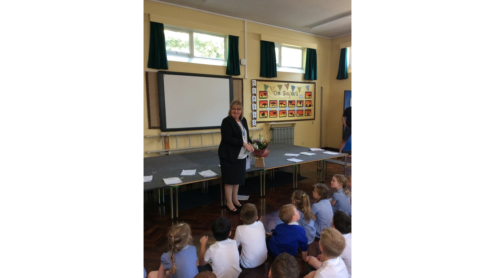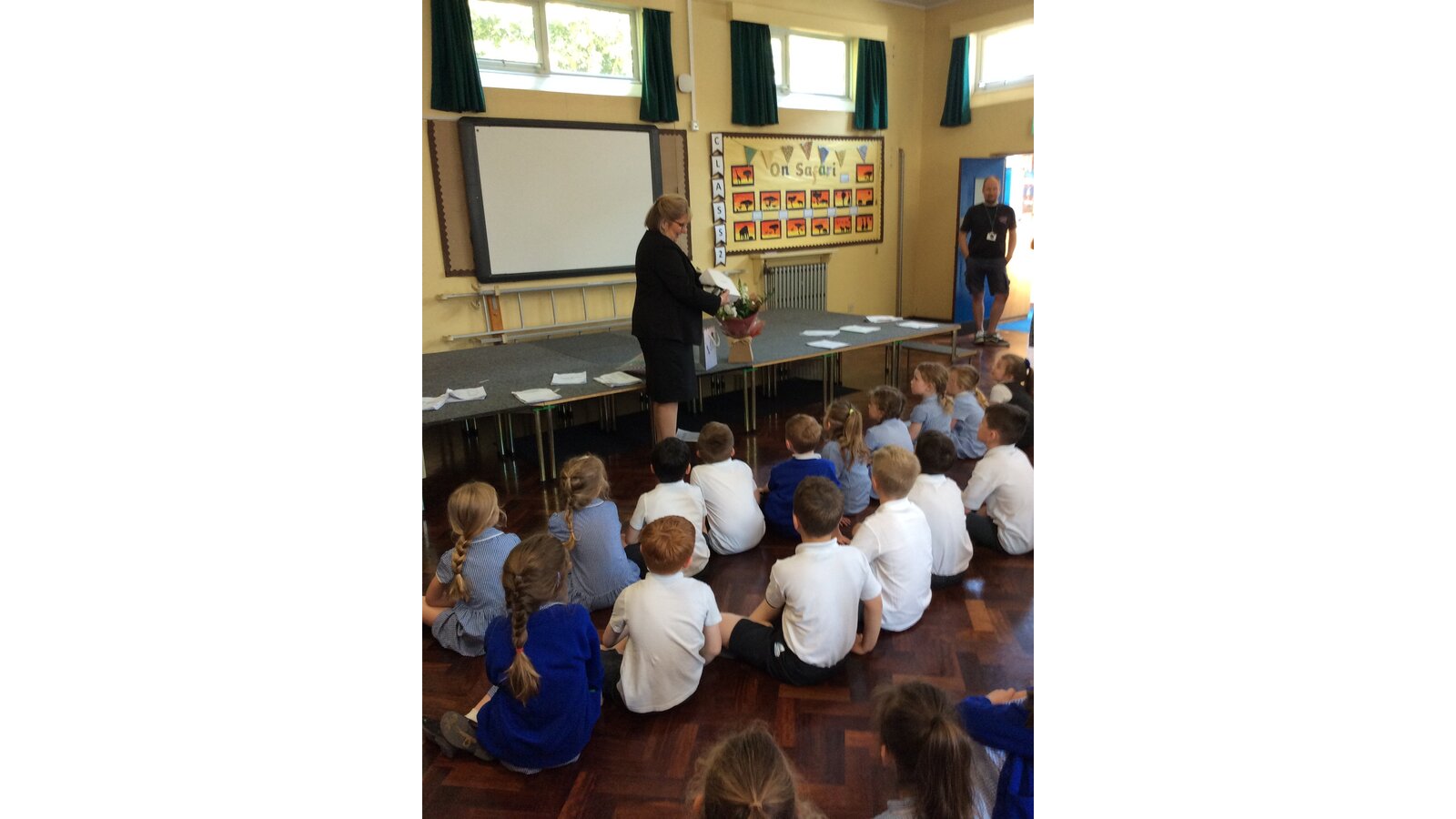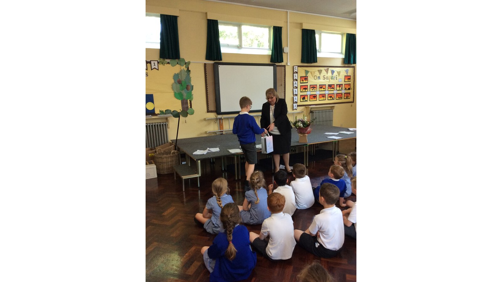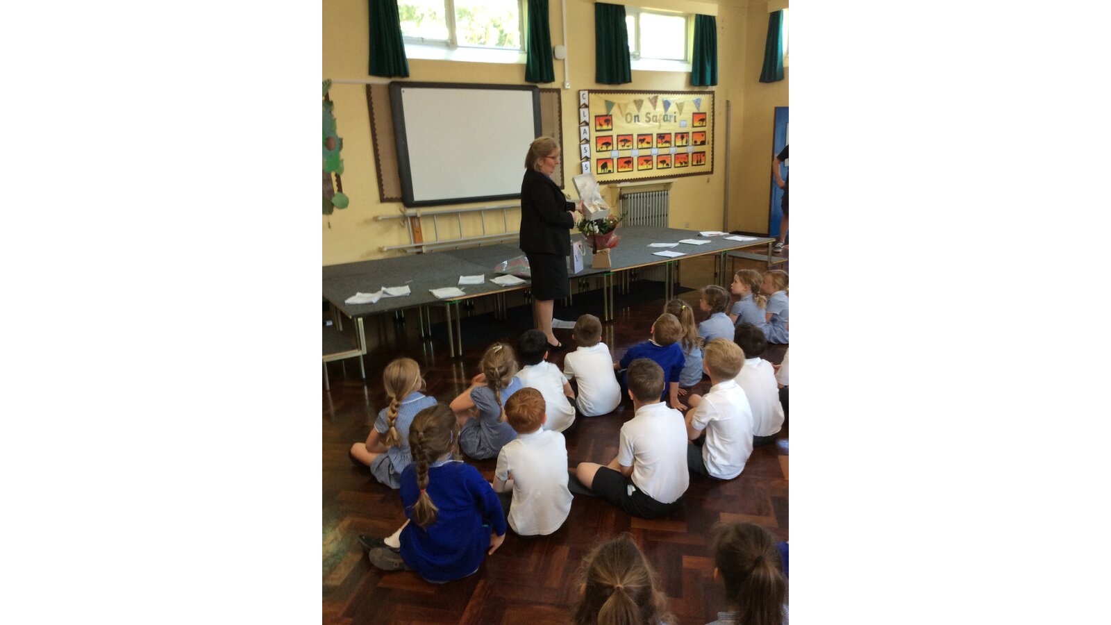 We surprised Mrs Fenton by singing to her in also special birthday assembly . She was very happy with the gifts and cake we gave her too.