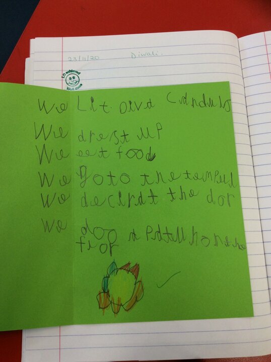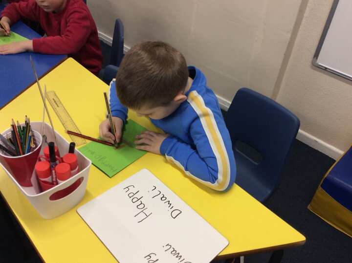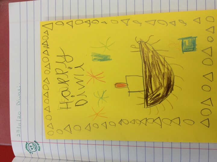 The children have been learning all about Diwali - the Hindu Festival of Light. They have found out about how Diwali is celebrated and the traditions surrounding this important celebration for the Hindu Faith. They made Diwali cards and demonstrated their brilliant knowledge by writing some facts they had learned. They will be continuing their work on Diwali next week by making Diva Lamps.