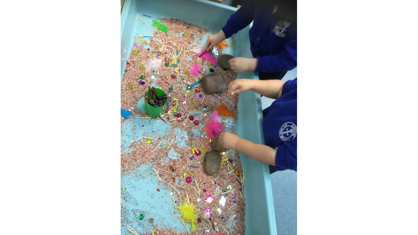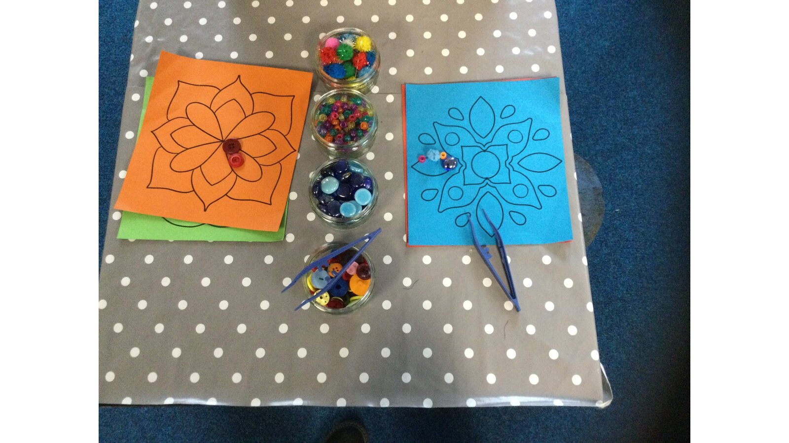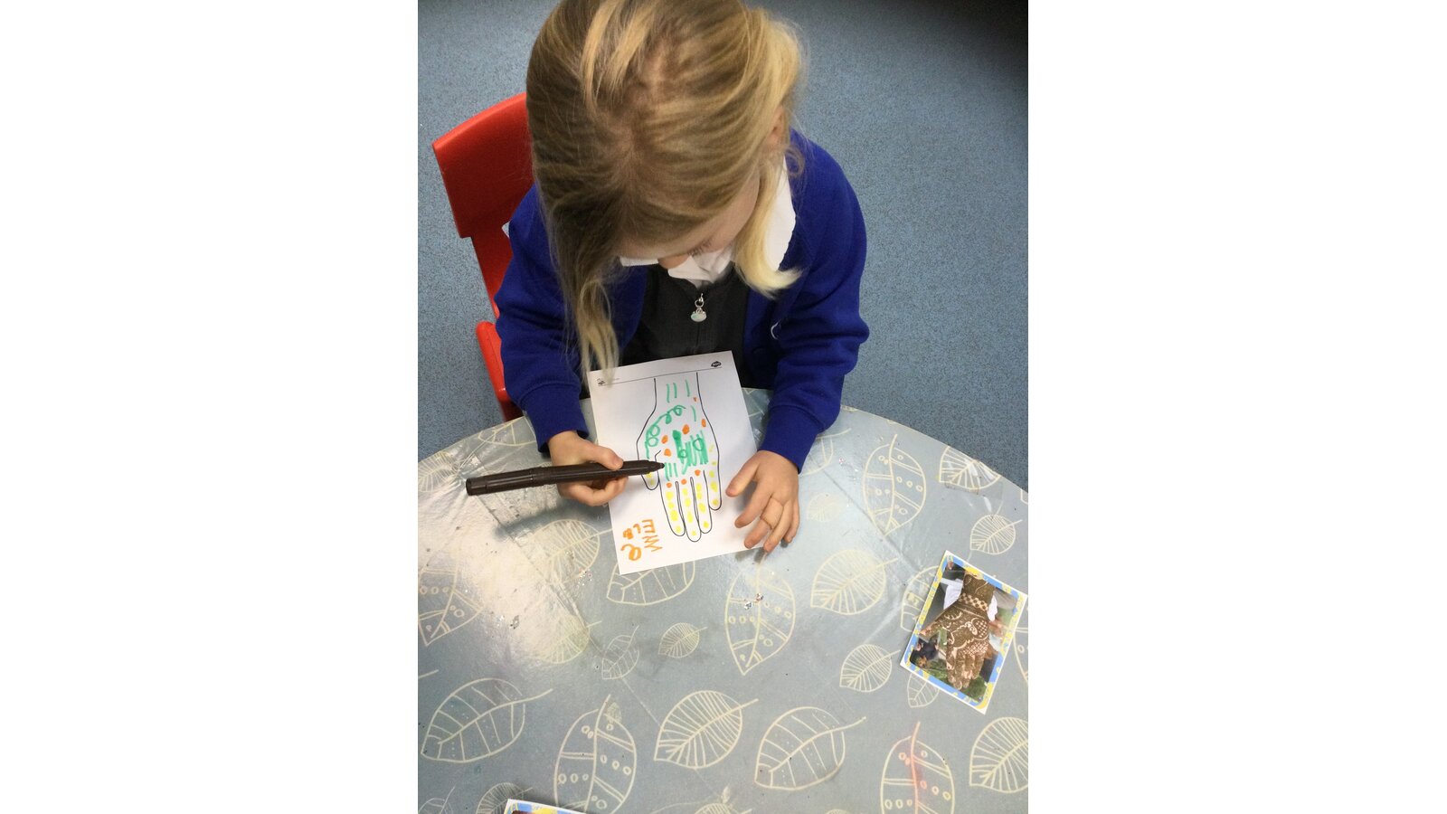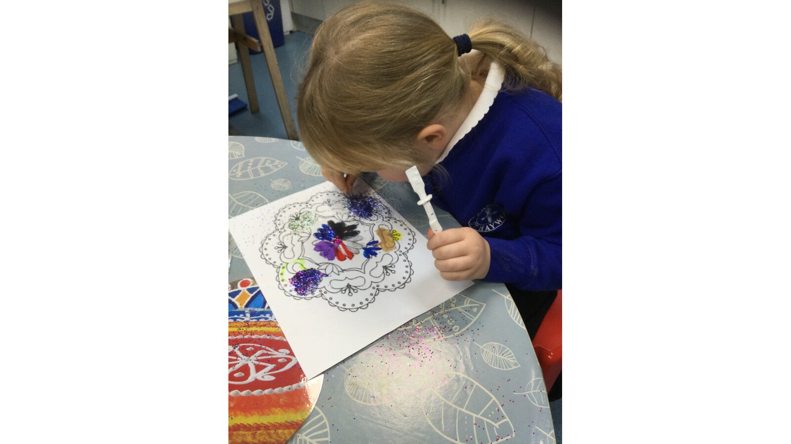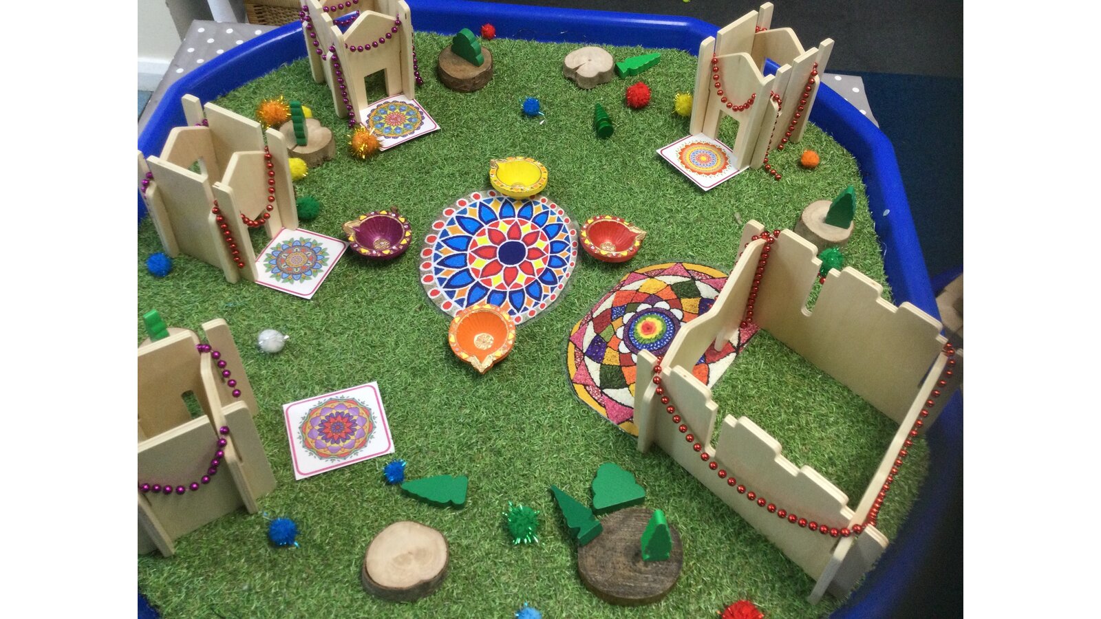 We watched a video of a family preparing and celebrating Diwali and watched the story of Rama and Sita. We made our own Festival of Light lanterns and explored textures creating some Rangoli patterns. The children enjoyed building temples and buildings with the wooden blocks, roleplaying in our small world, exploring our sensory tray and making loose part rangoli patterns.