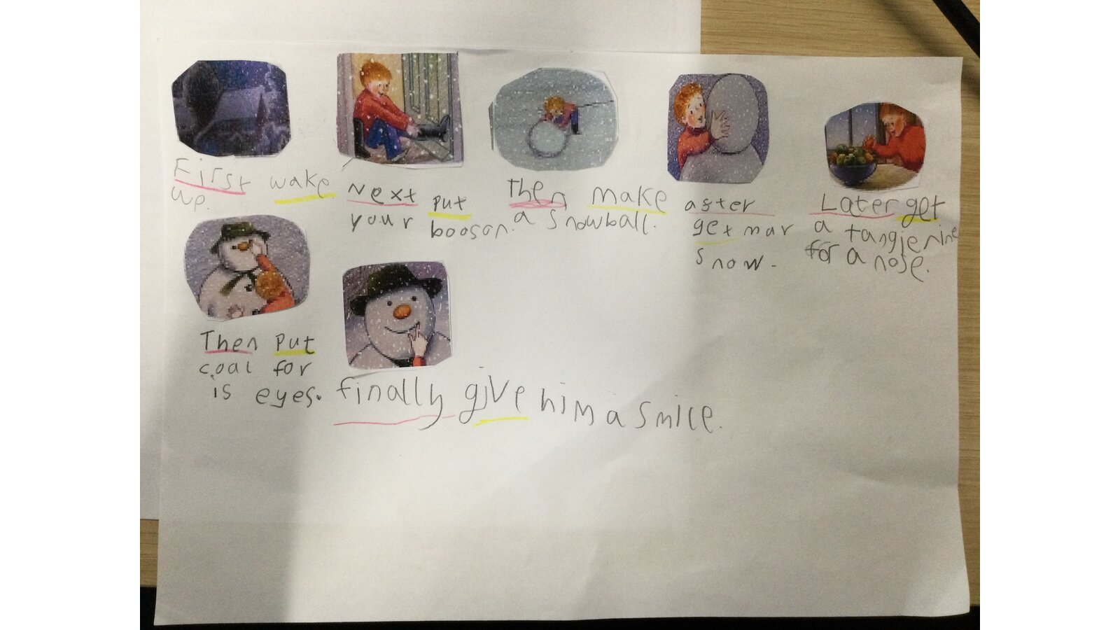 Today the children worked hard within their table groups to sequence the part of the story where James builds the snowman, all the while developing their oracy skills through key discussions with their peers and team work!