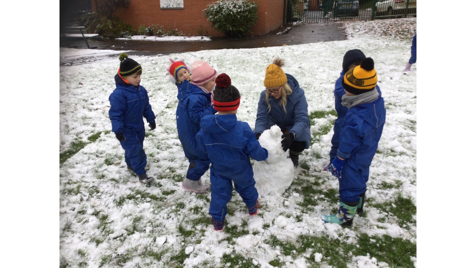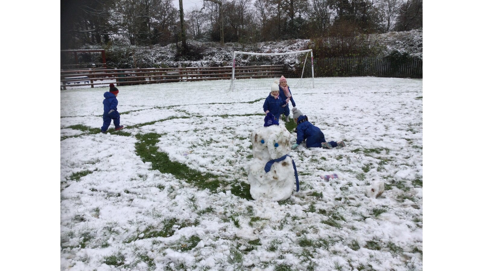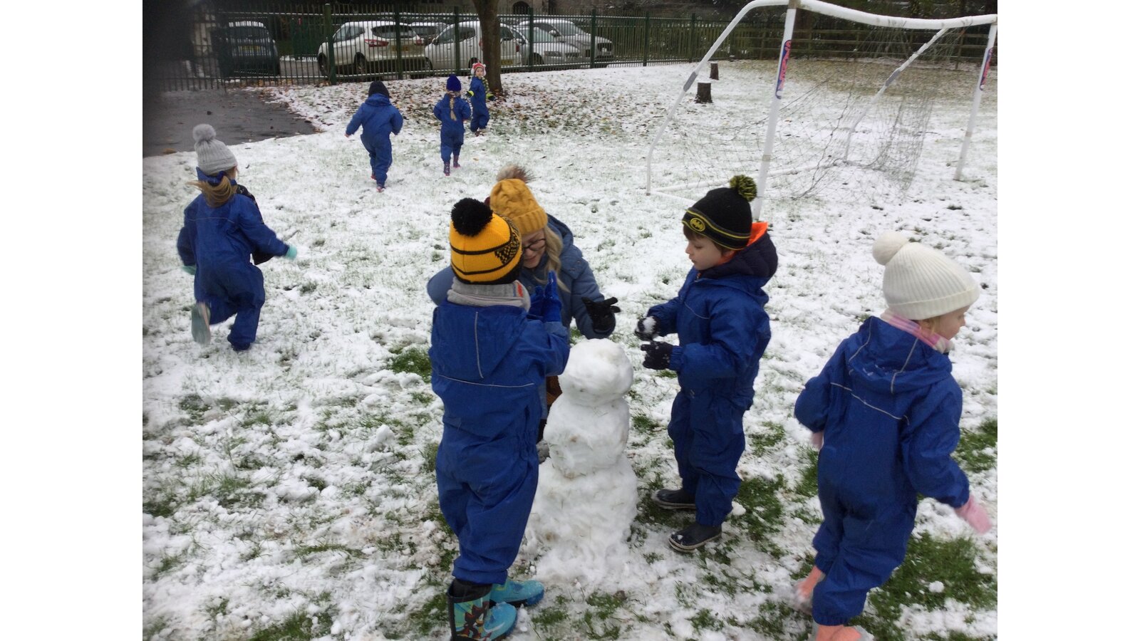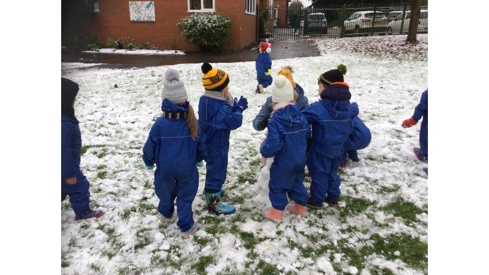 Class 1 explored the snow together this morning, we wrapped up warm and worked together to build some snowmen.