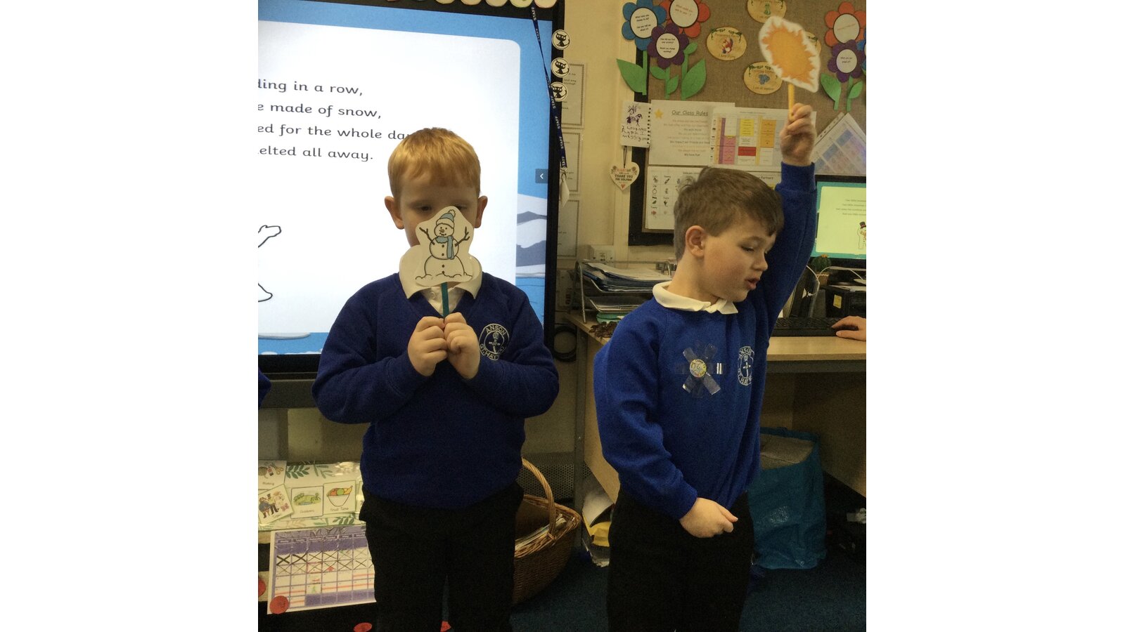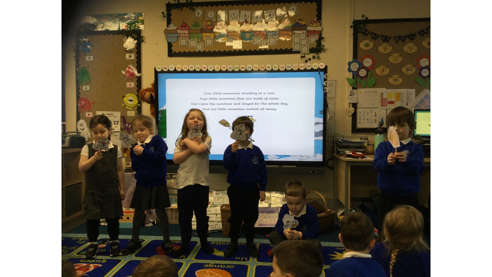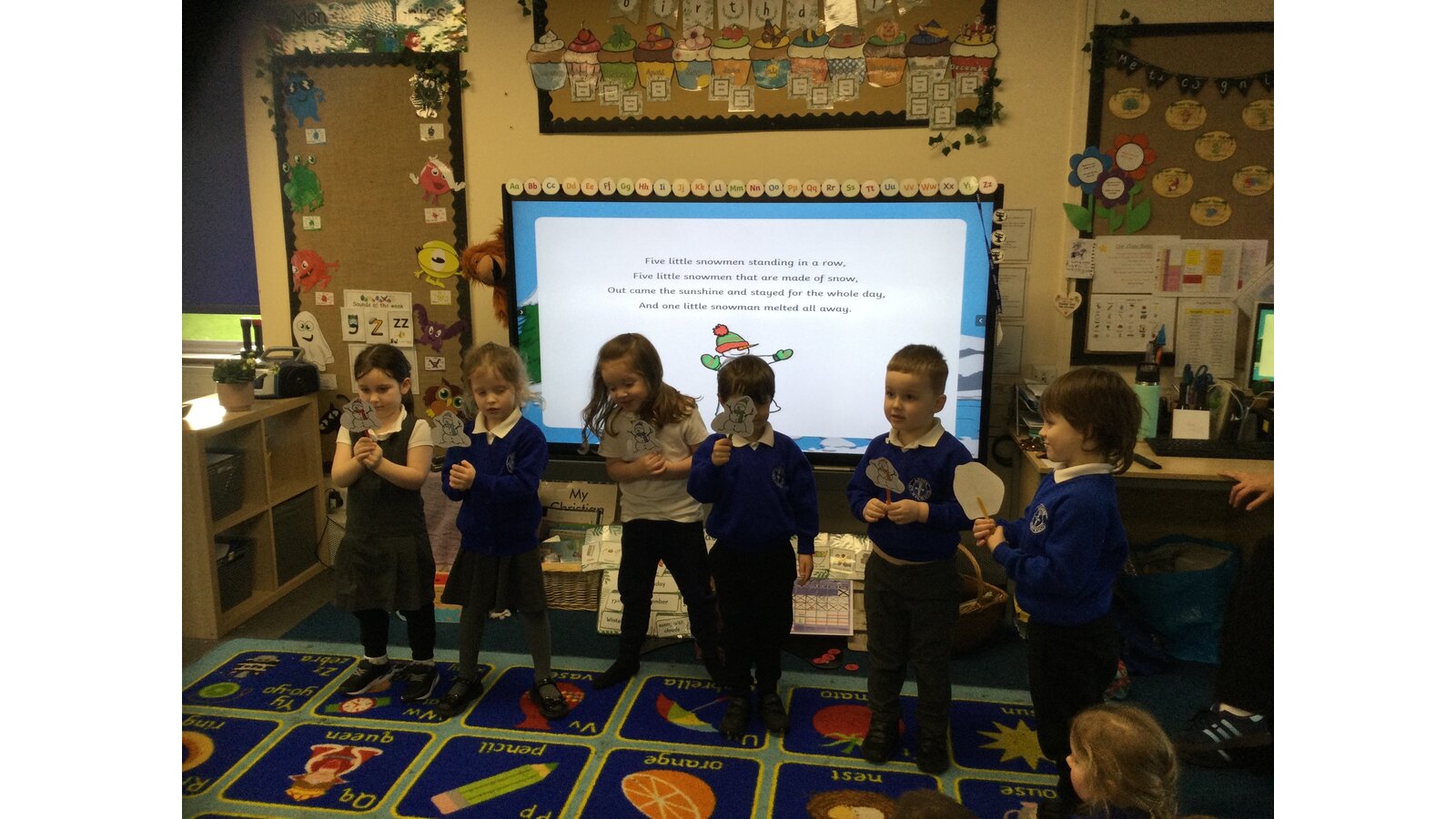 Today in our maths activity, Class 1 were exploring the concept of 1 less than. We used some snowmen stick puppets and a fantastic song to help us work out 1 less than a given number. The children loved being either a snowman or a sun and making one snowman melt away at a time. They were all really confident at recognising which number was 1 less than a given number.