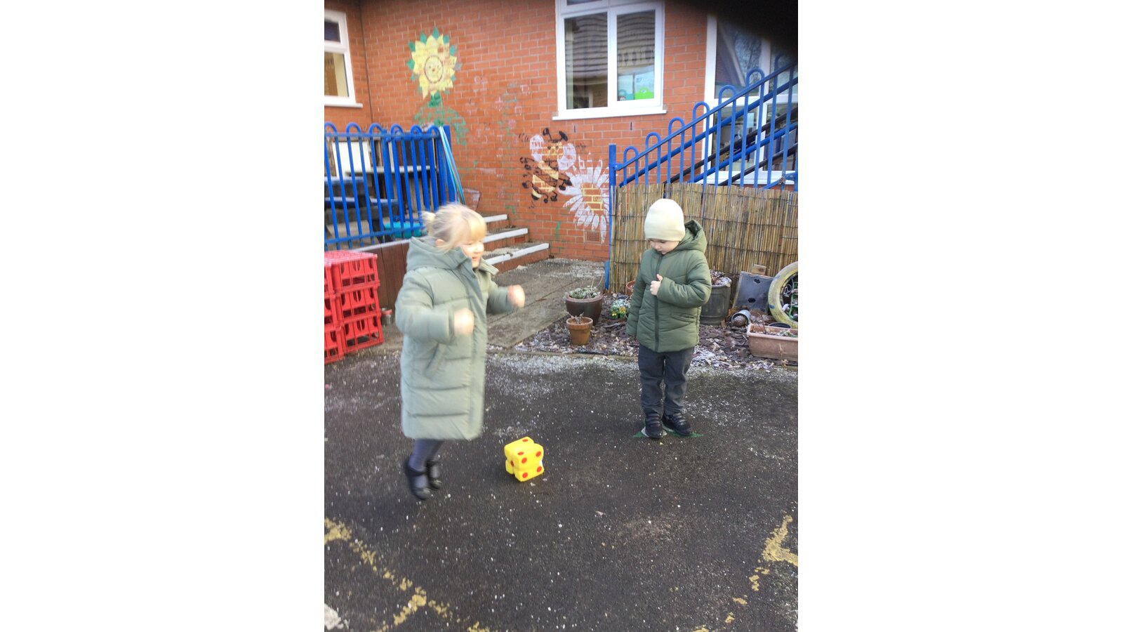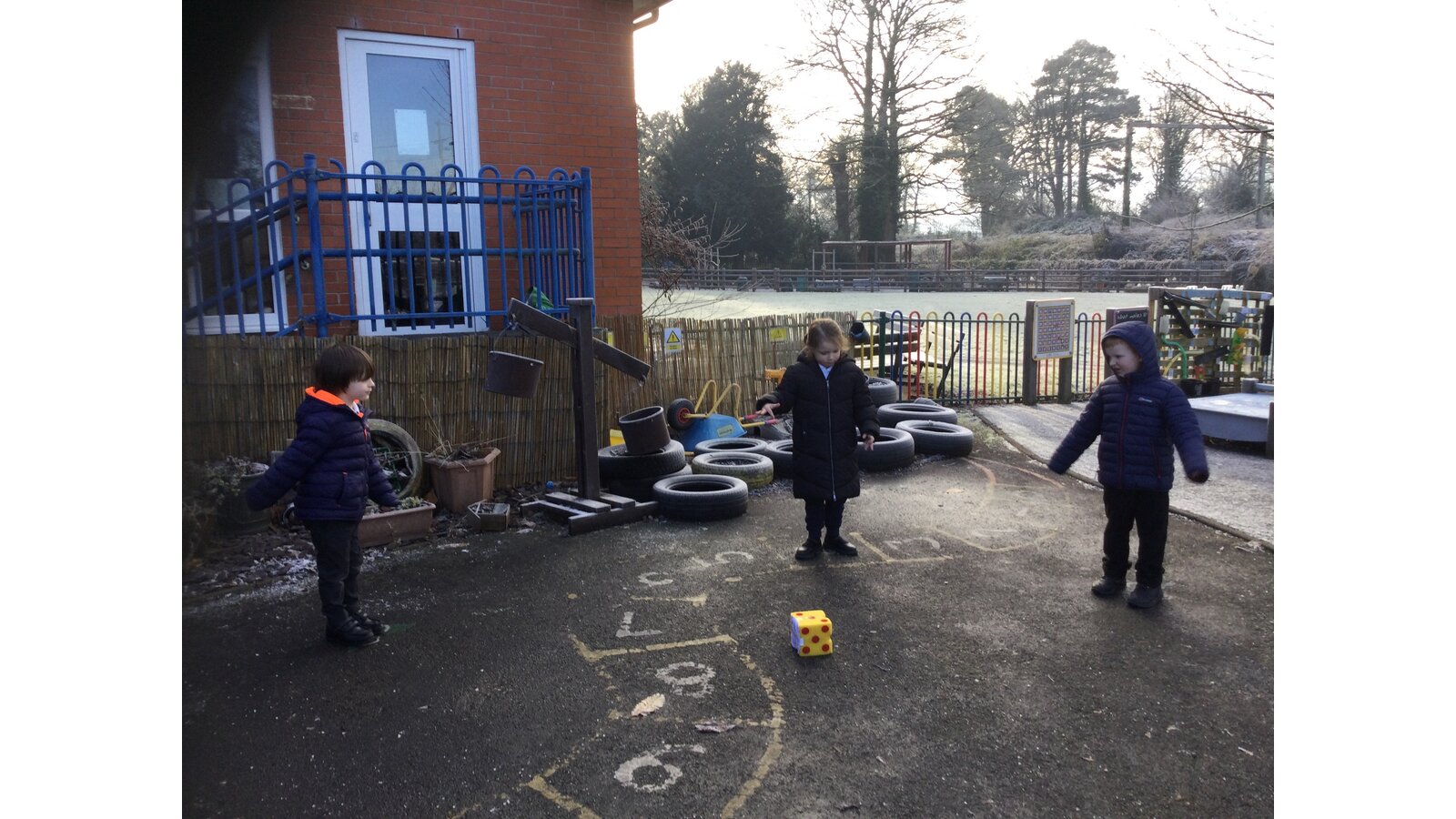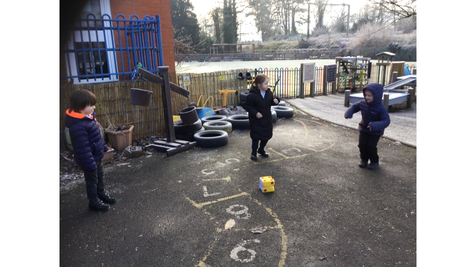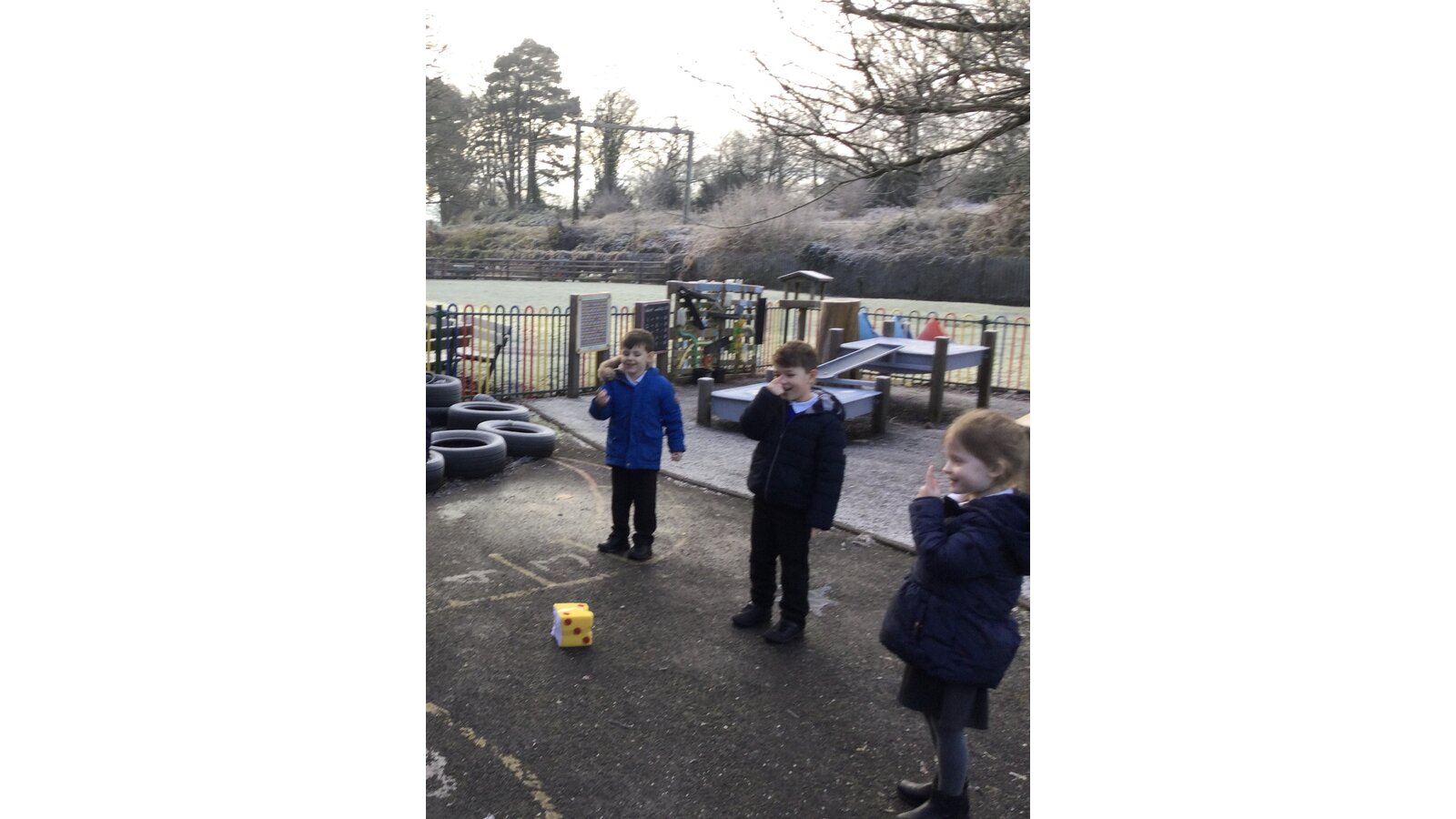 In maths today, Class 1 have been thinking about representing numbers to 5 in different ways. We put on our coats and found a safe place on our outside area to enjoy our maths activity.