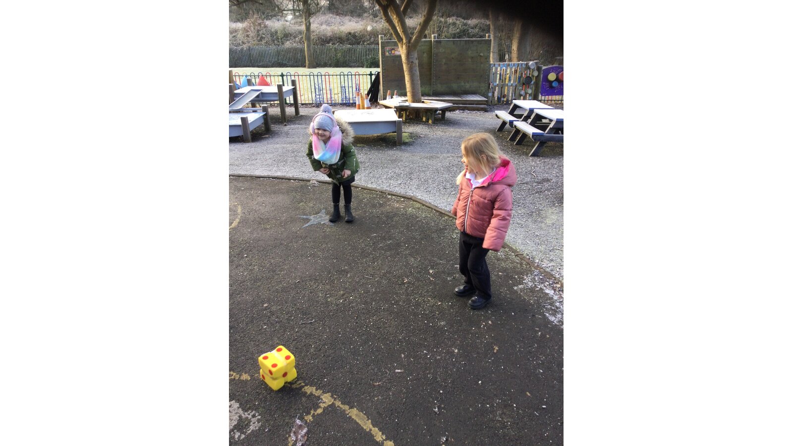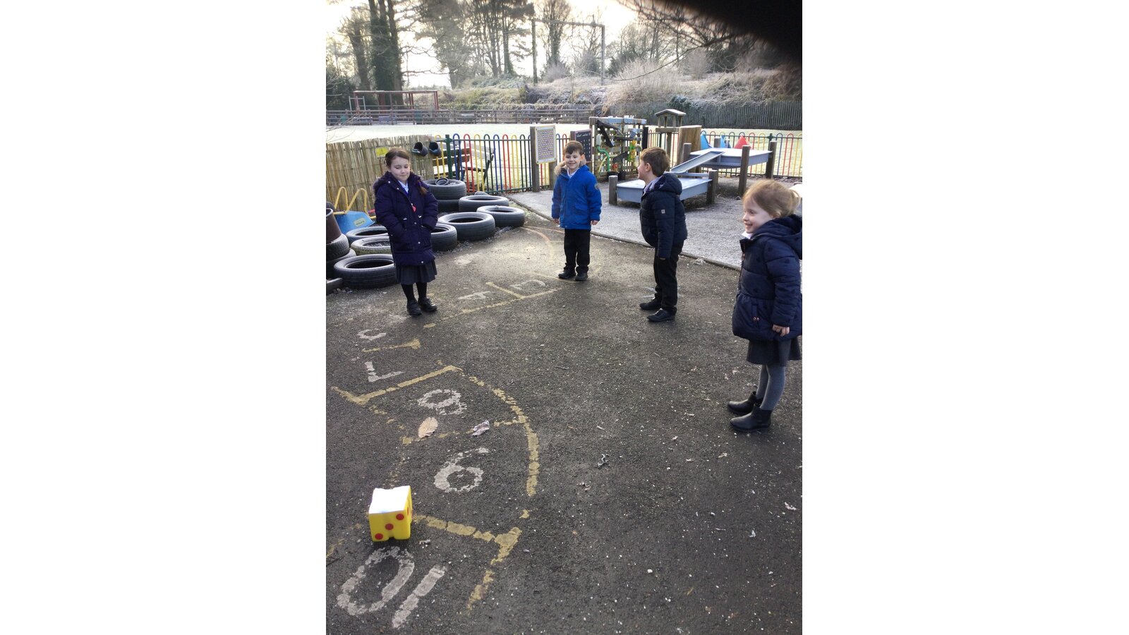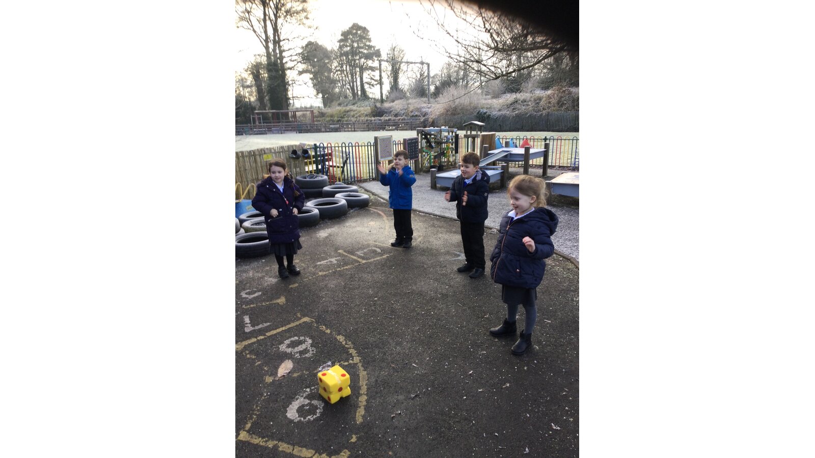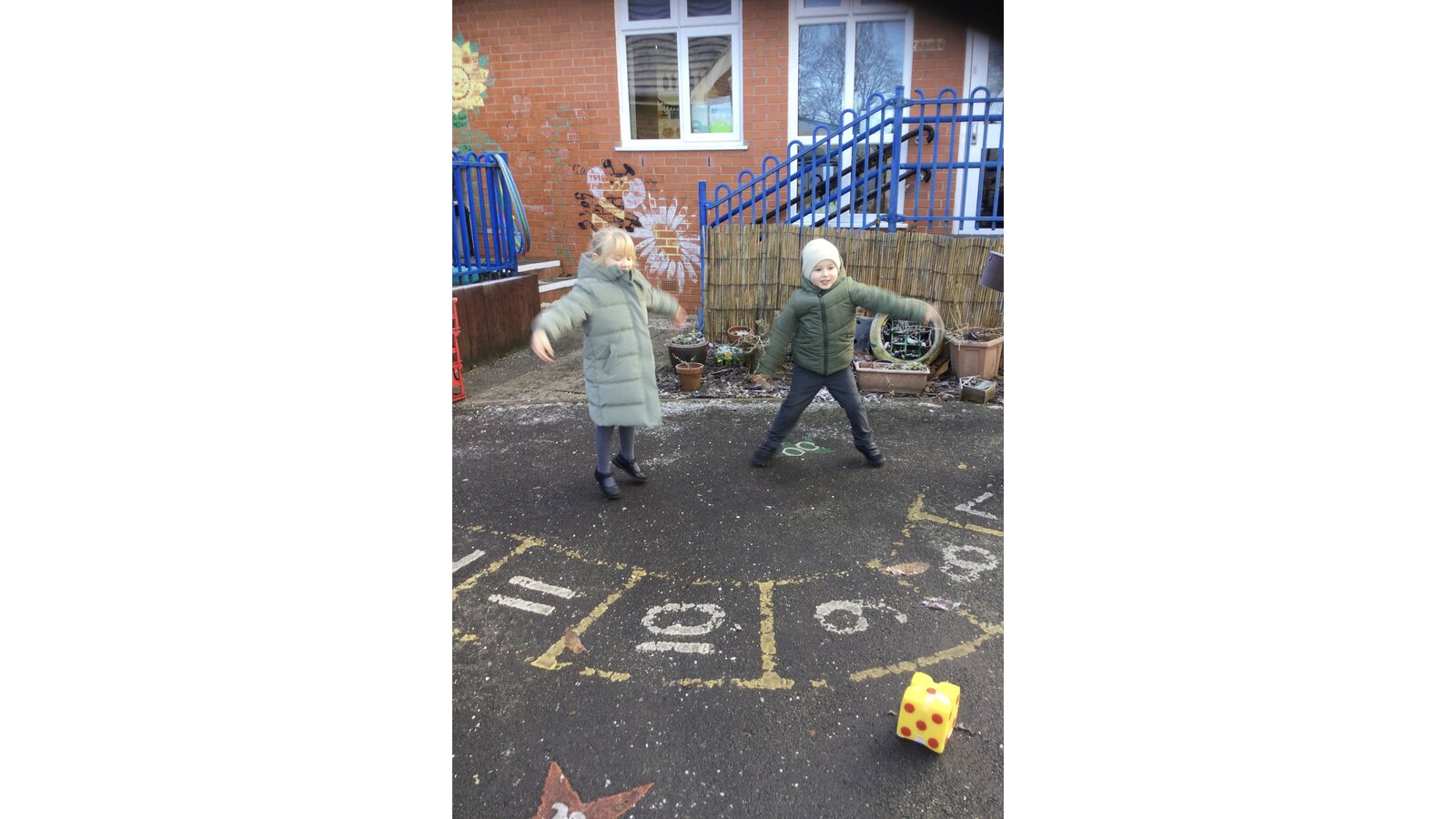 In maths today, Class 1 have been thinking about representing numbers to 5 in different ways. We put on our coats and found a safe place on our outside area to enjoy our maths activity.