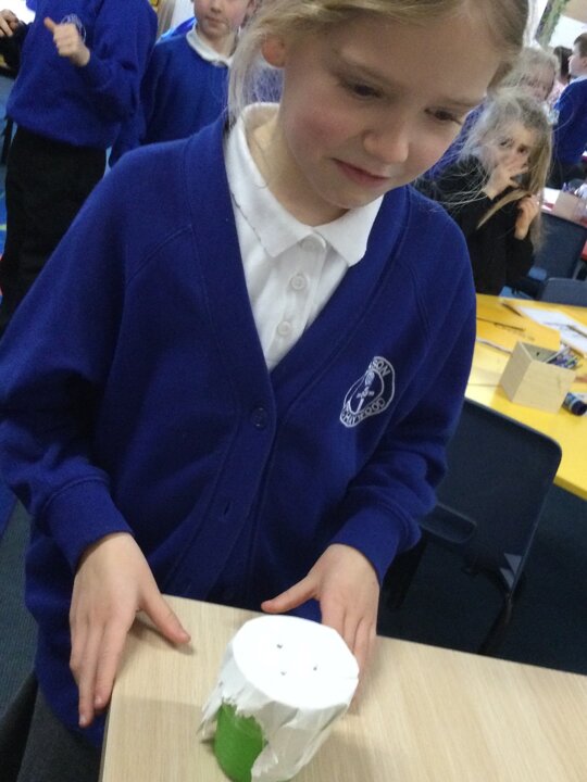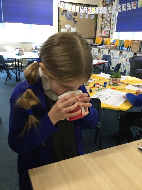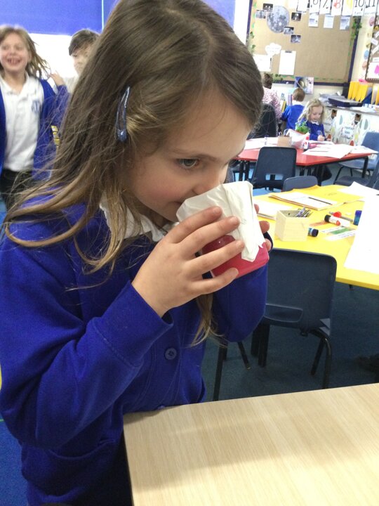 We had a go at predicting what was in a cup by using our sense of smell, what was in the bag using our sense of touch, and what the sound was using our sense of hearing.