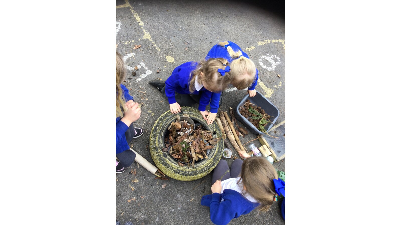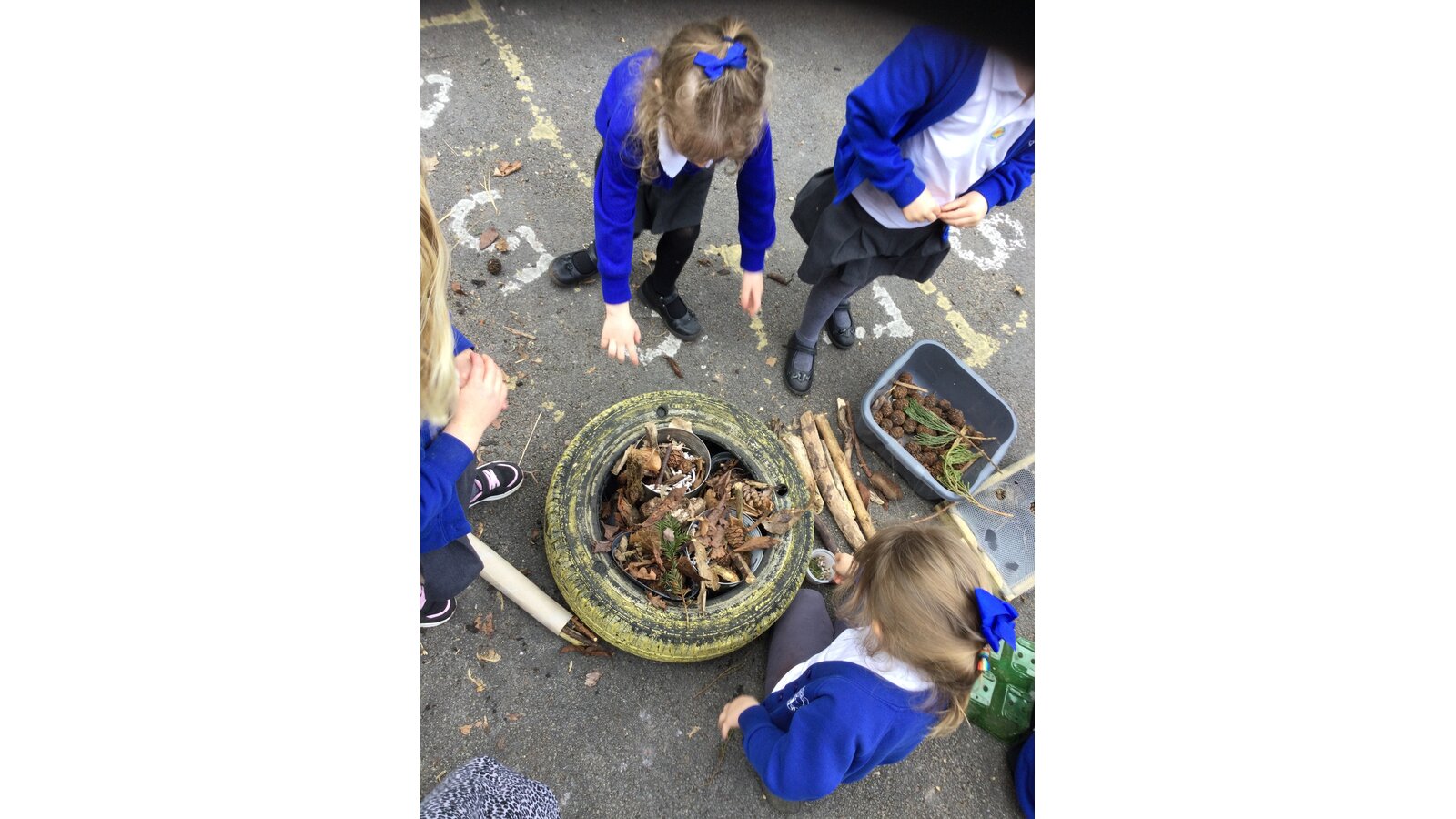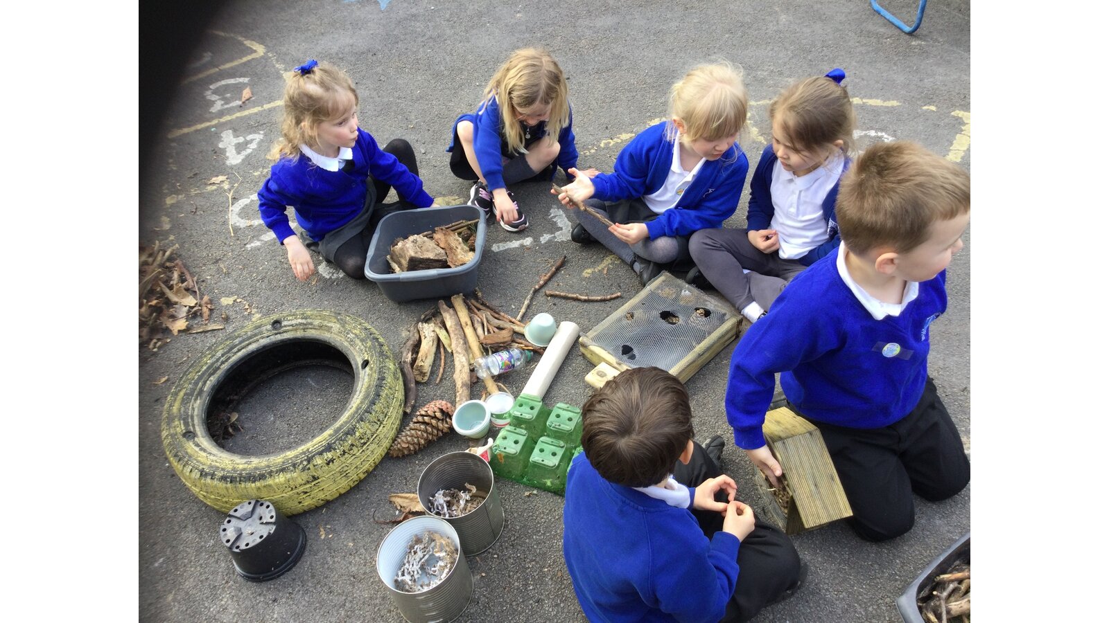 Class 1 explored minibeast habitats in Science today and why minibeasts like small, sheltered places. We went outside to collect natural materials, sticks, leaves, pine cones and bark to create a bug hotel out of a tyre.