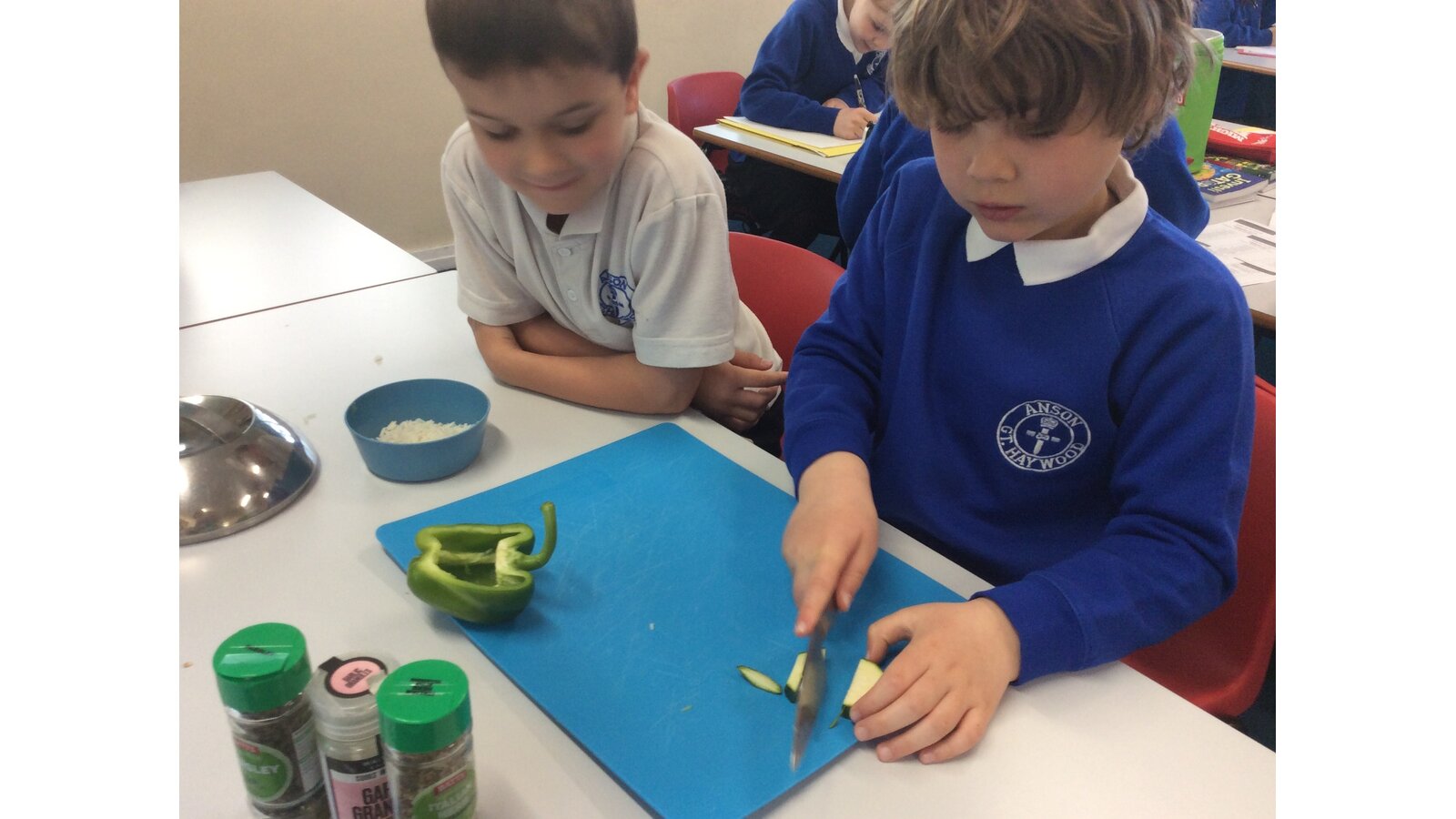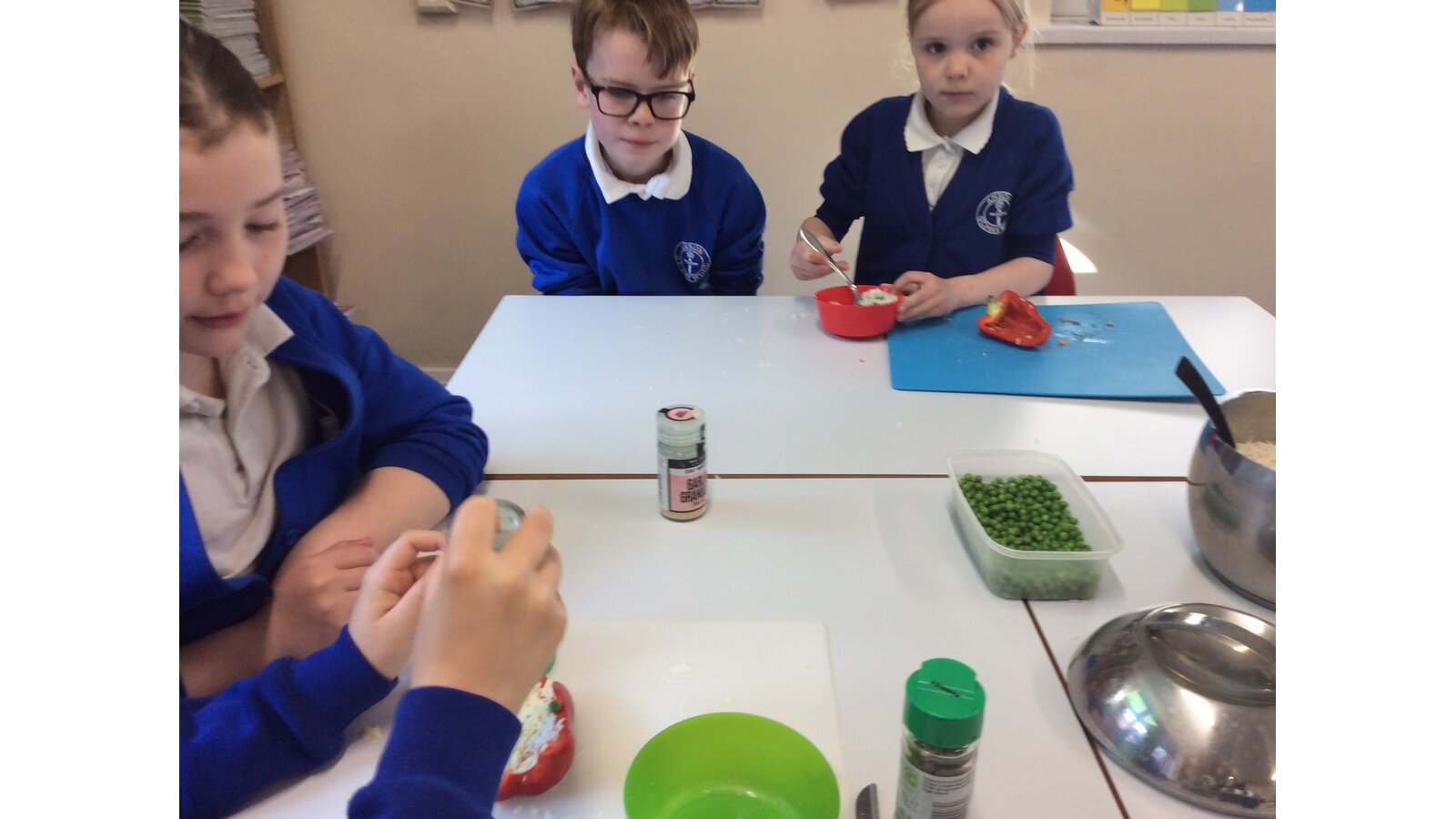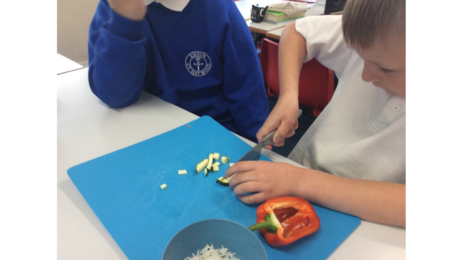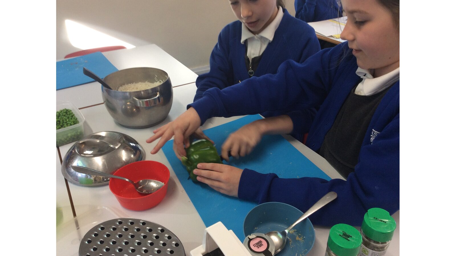 We have been learning about seasonal British vegetables in Design and Technology. We have created stuffed peppers with the ingredients of rice, peas, courgette and some herbs. The skills we developed were grating cheese and chopping with a knife. We all tried our stuffed peppers and reflected on the taste.