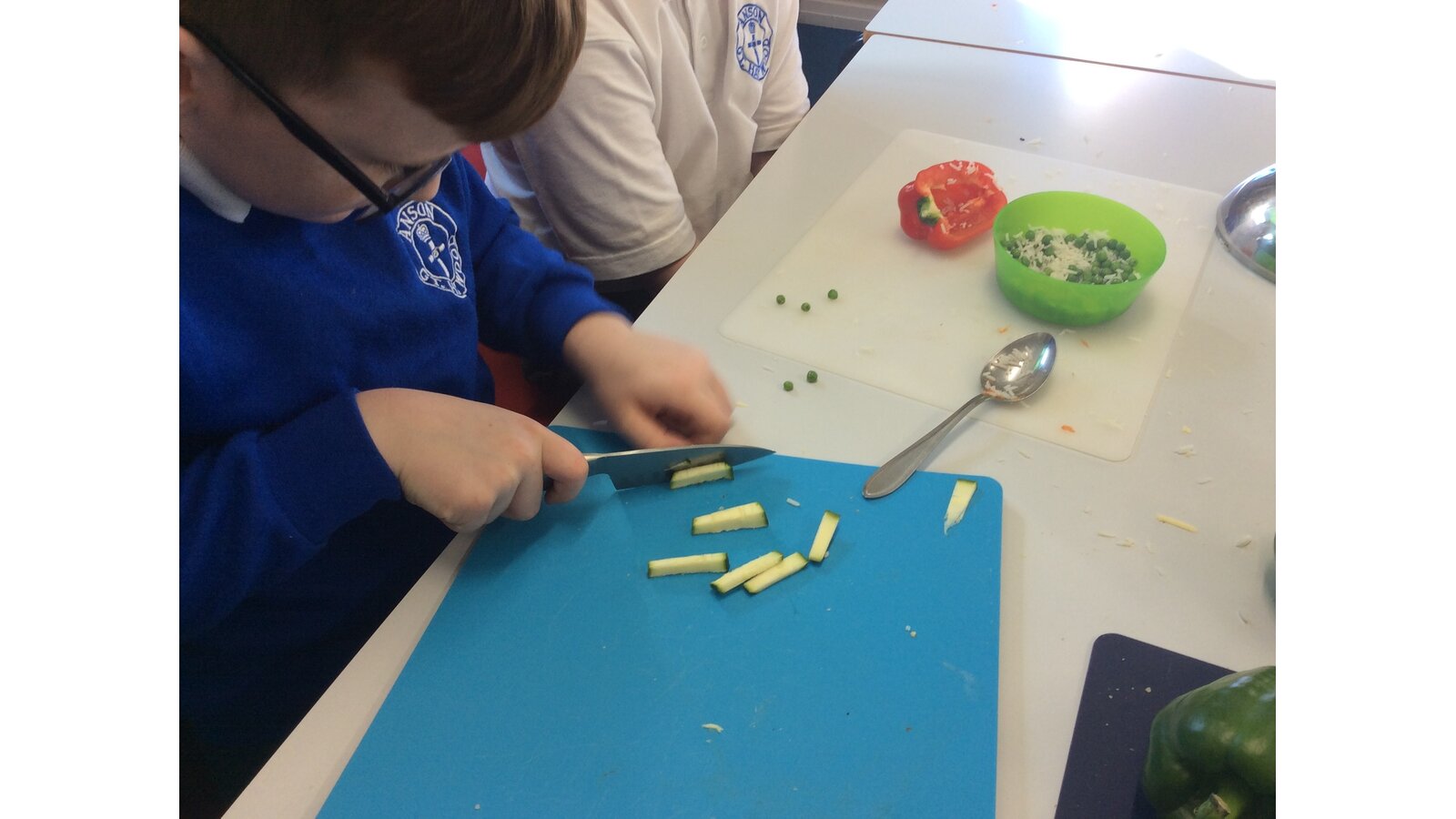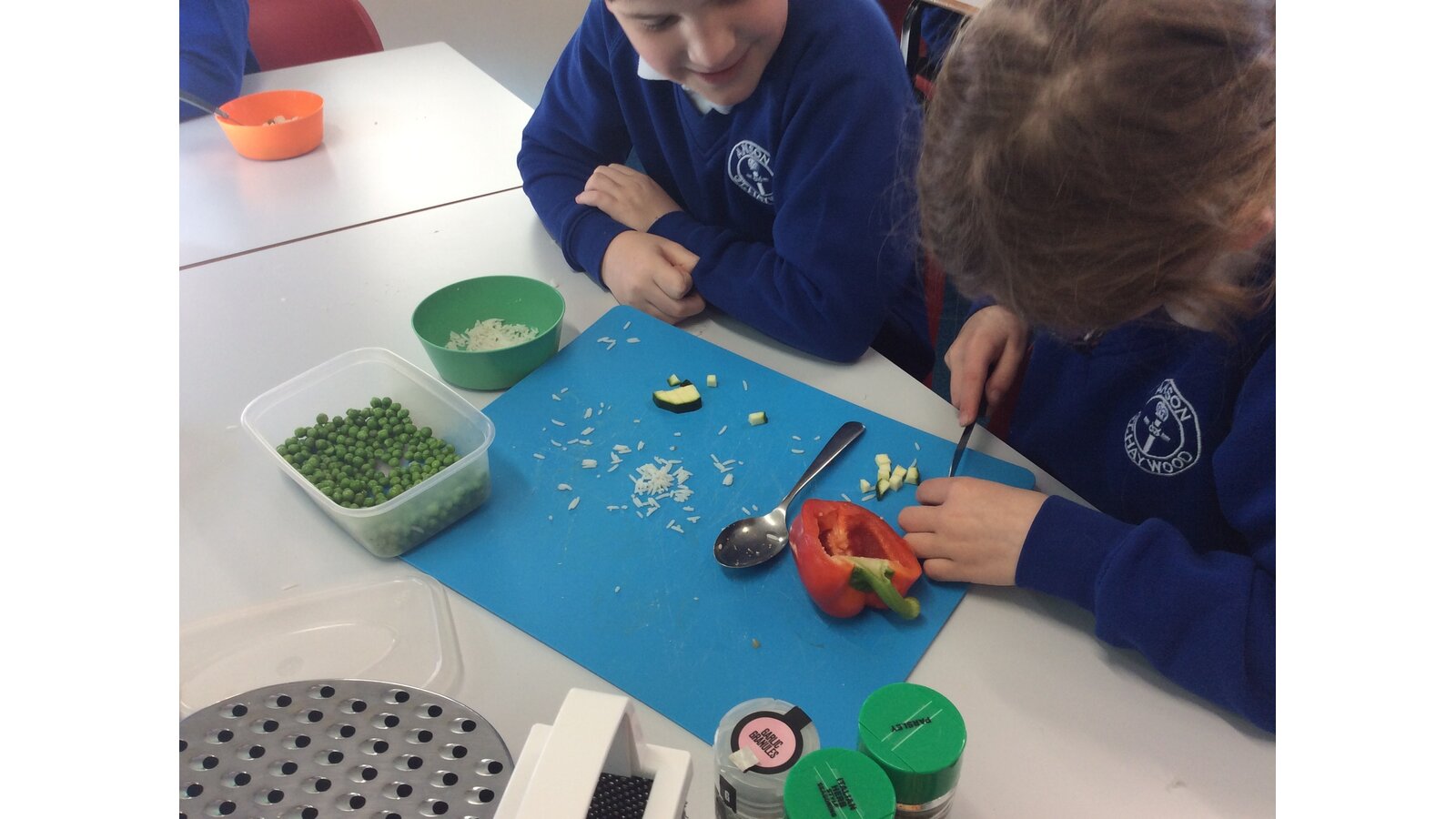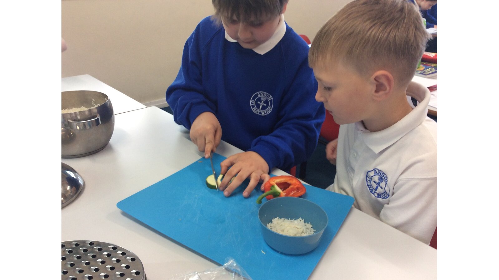 We have been learning about seasonal British vegetables in Design and Technology. We have created stuffed peppers with the ingredients of rice, peas, courgette and some herbs. The skills we developed were grating cheese and chopping with a knife. We all tried our stuffed peppers and reflected on the taste.