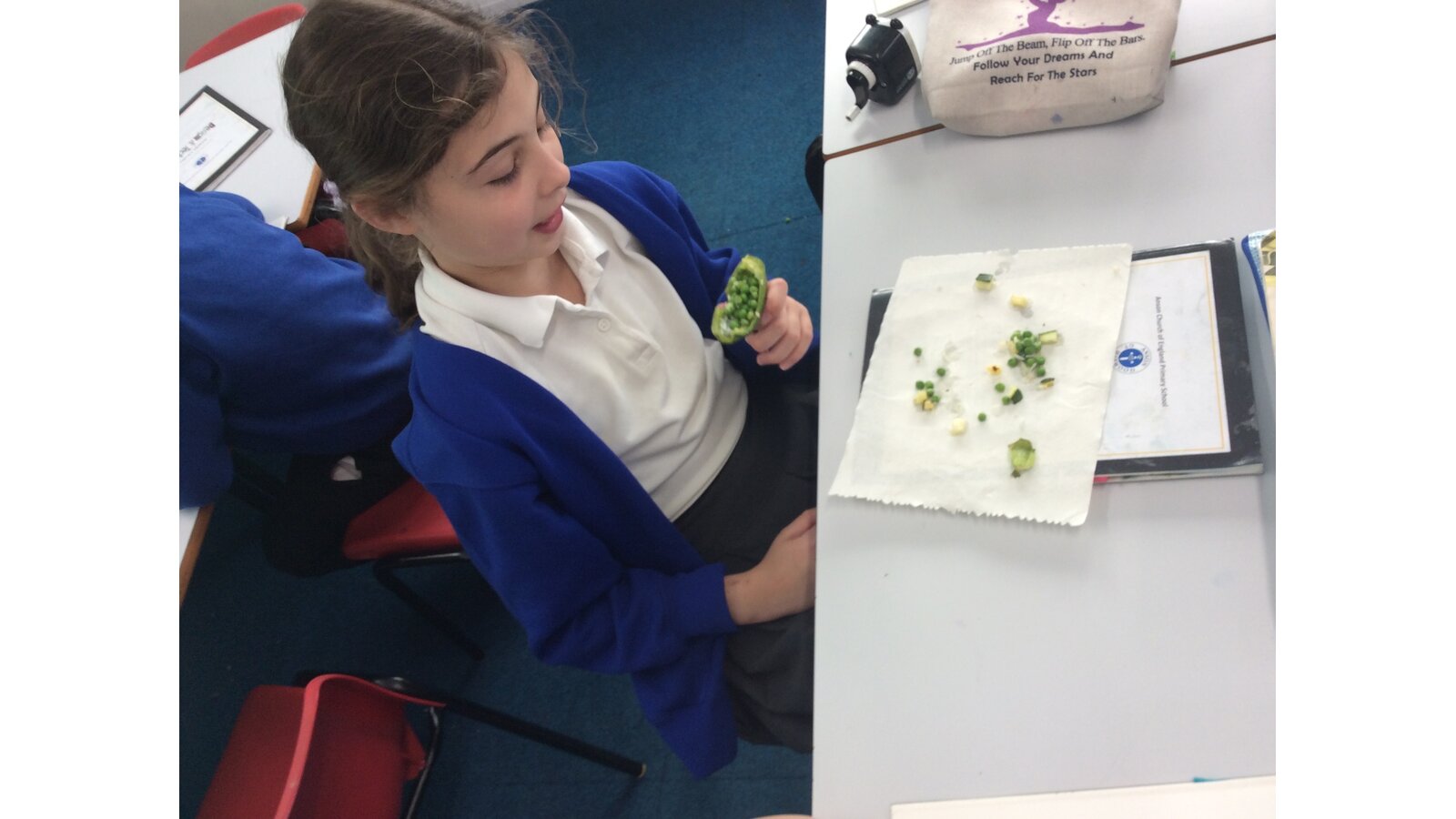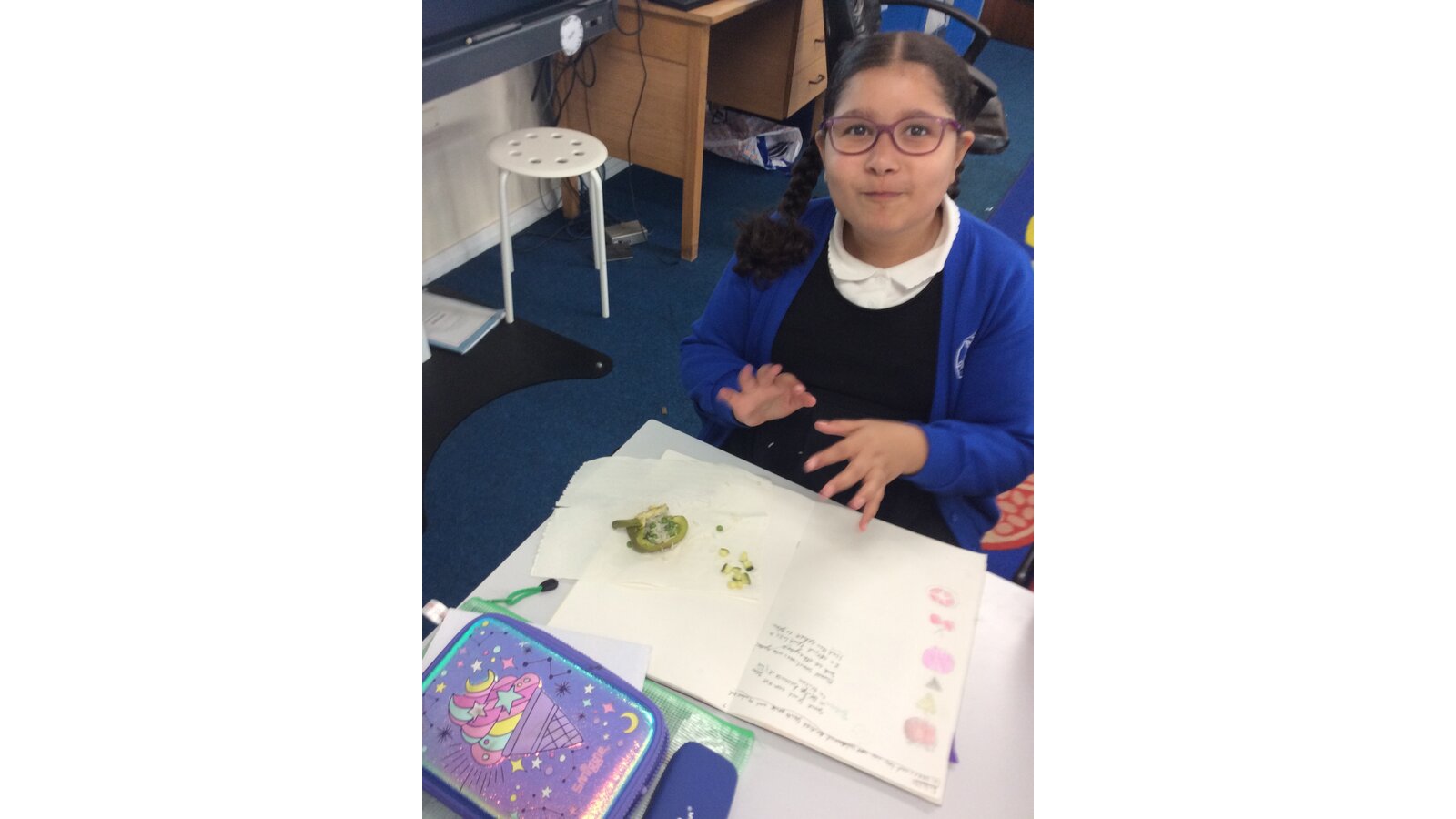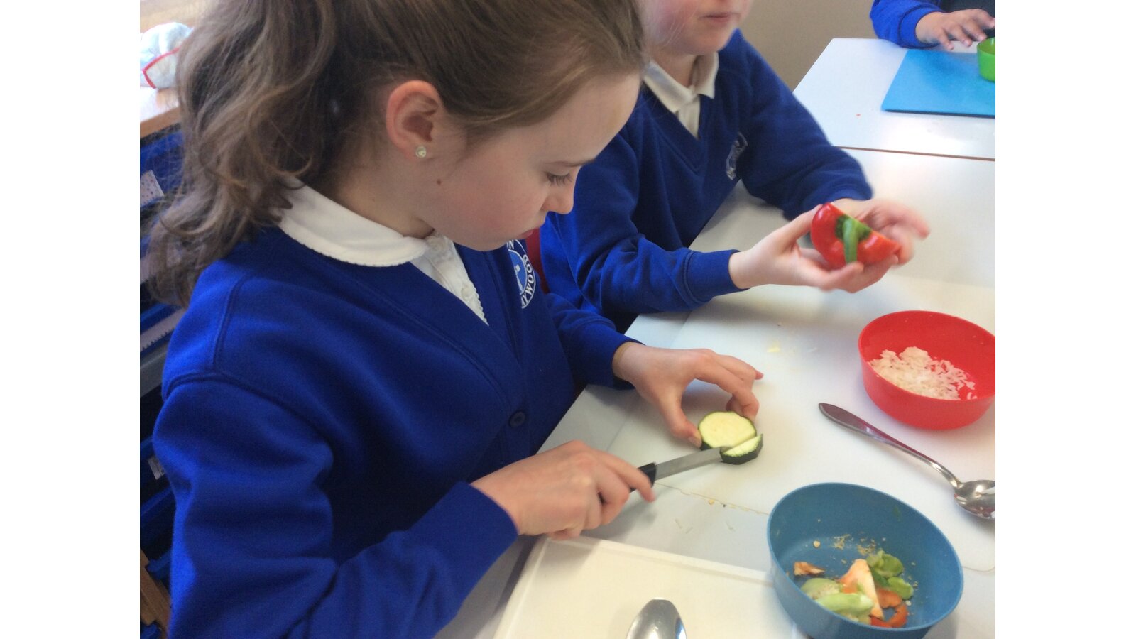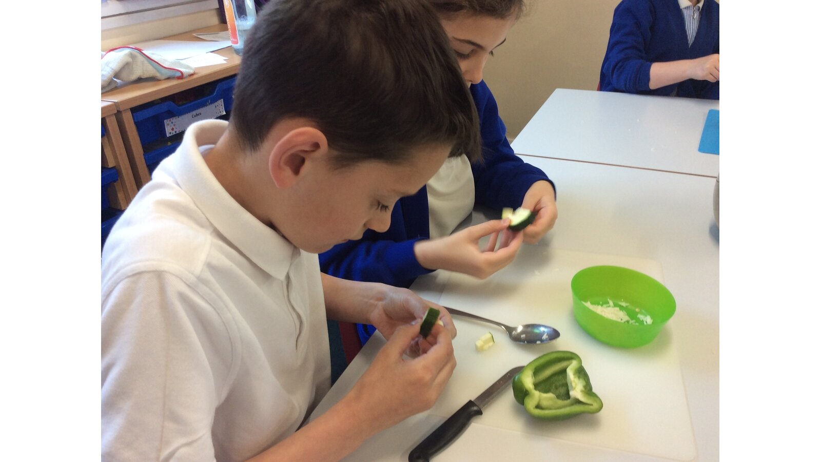 We have been learning about seasonal British vegetables in Design and Technology. We have created stuffed peppers with the ingredients of rice, peas, courgette and some herbs. The skills we developed were grating cheese and chopping with a knife. We all tried our stuffed peppers and reflected on the taste.