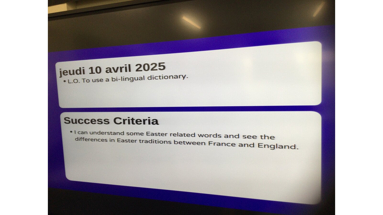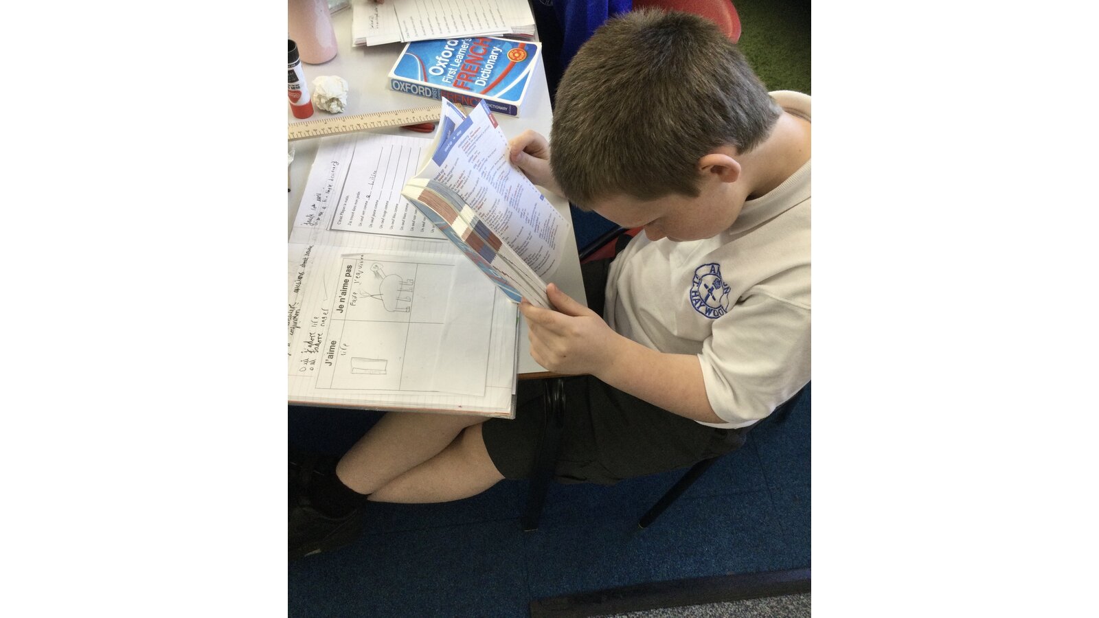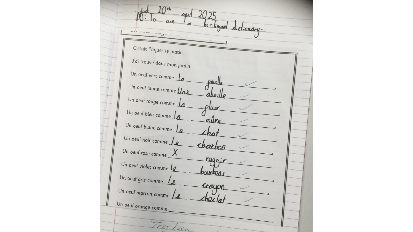 The children enjoyed using a bi lingual French dictionary to look up words for their Easter French poem. Super confident work!