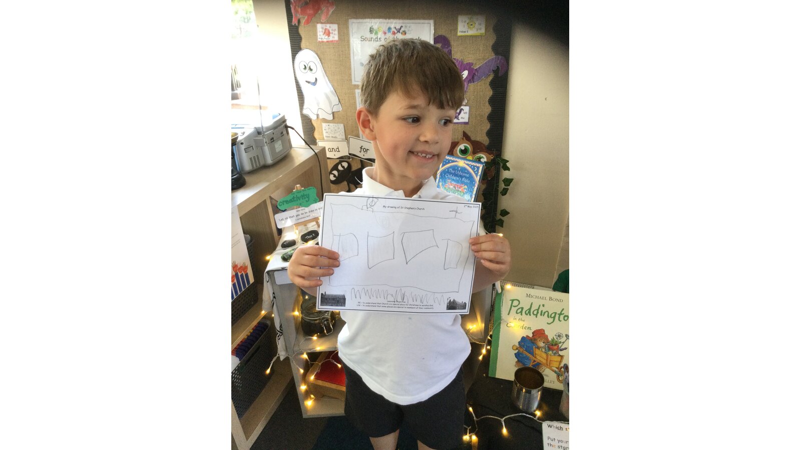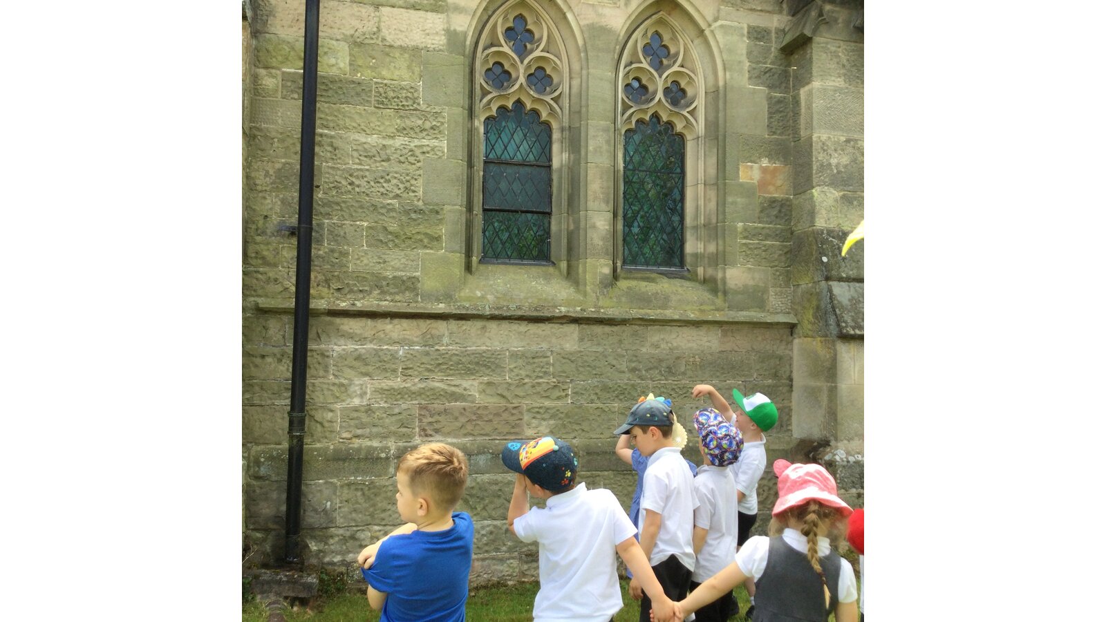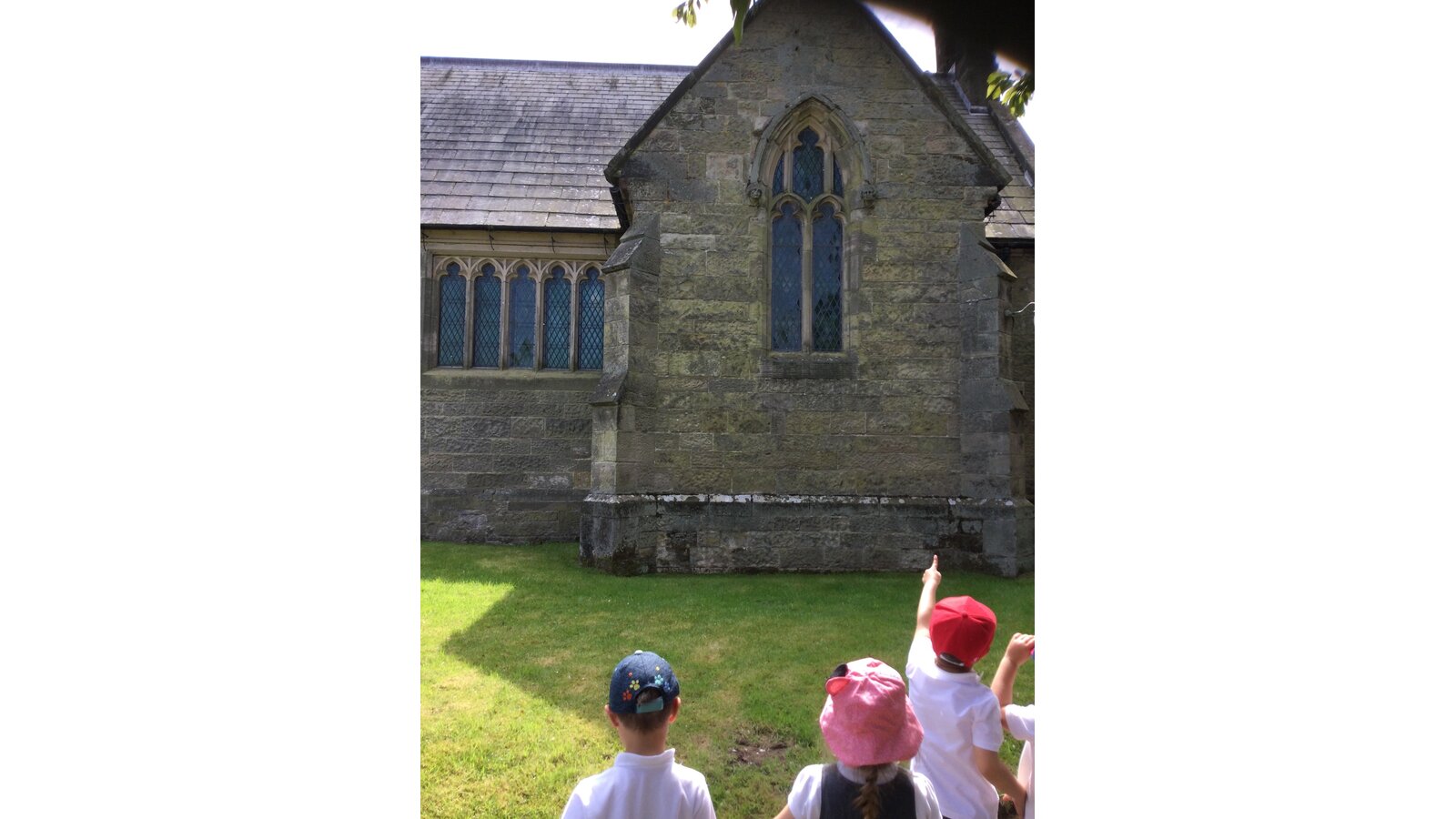We then looked closely at some pictures of church buildings and walked around the outside of St Stephen’s in the gorgeous sunshine to discover what distinctive features it has. The children enjoyed spotting where the bell tower was and looking closely at the shape and decoration on the windows.