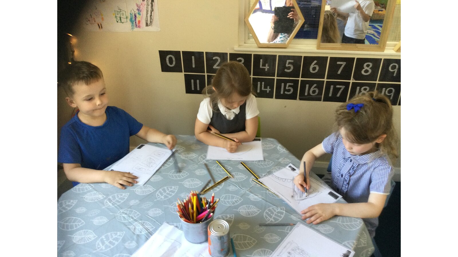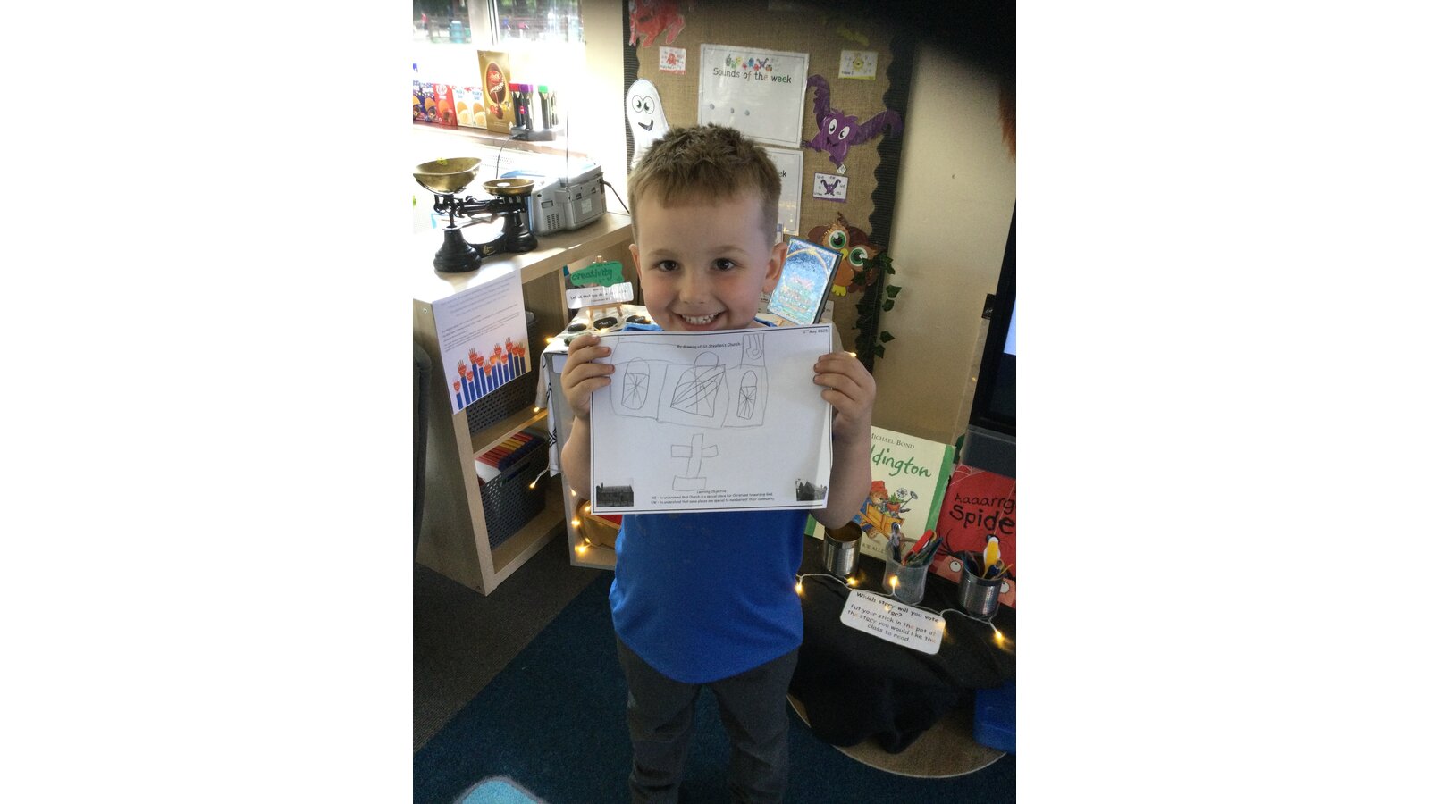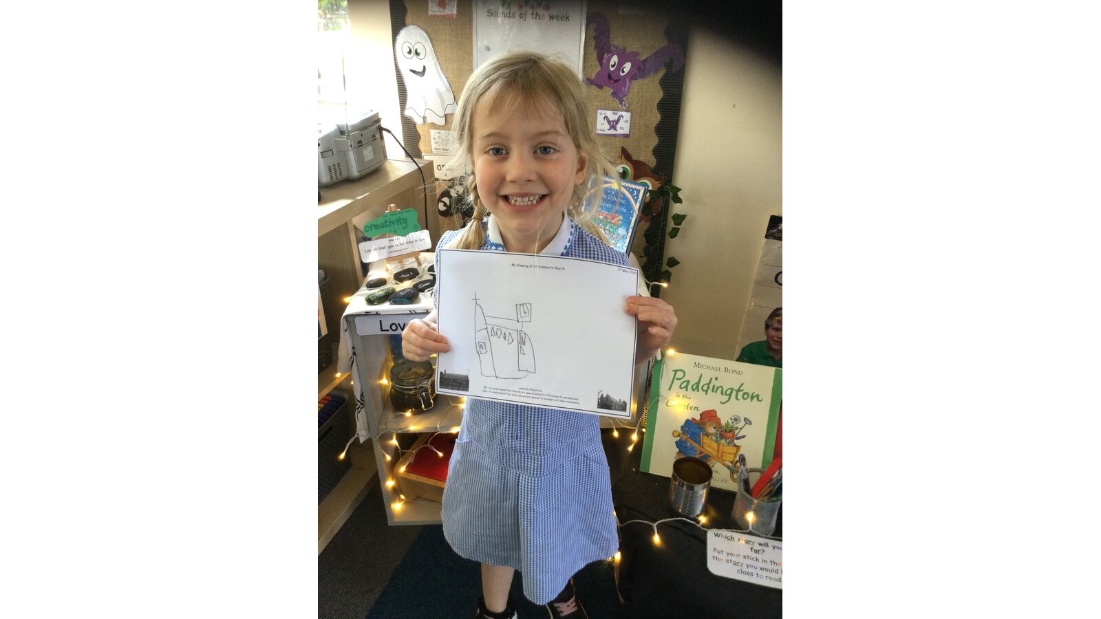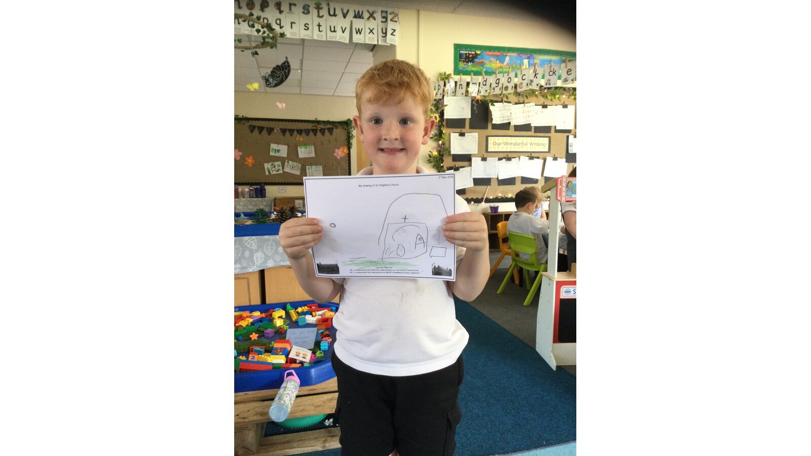 We then looked closely at some pictures of church buildings and walked around the outside of St Stephen’s in the gorgeous sunshine to discover what distinctive features it has. The children enjoyed spotting where the bell tower was and looking closely at the shape and decoration on the windows.