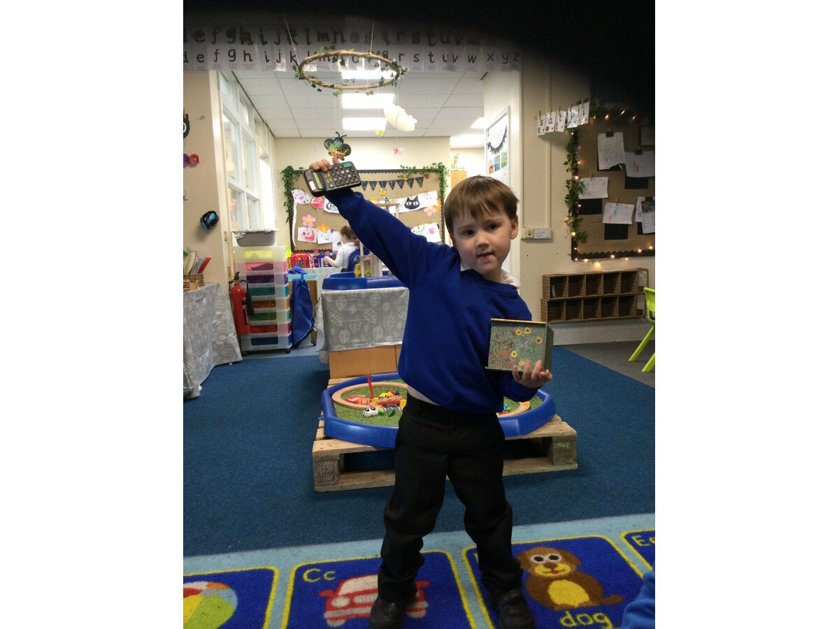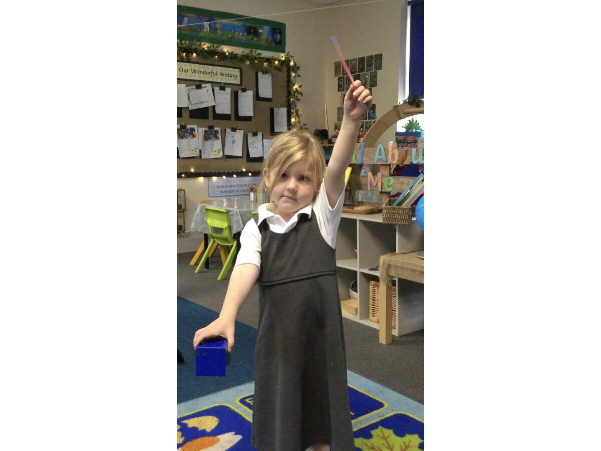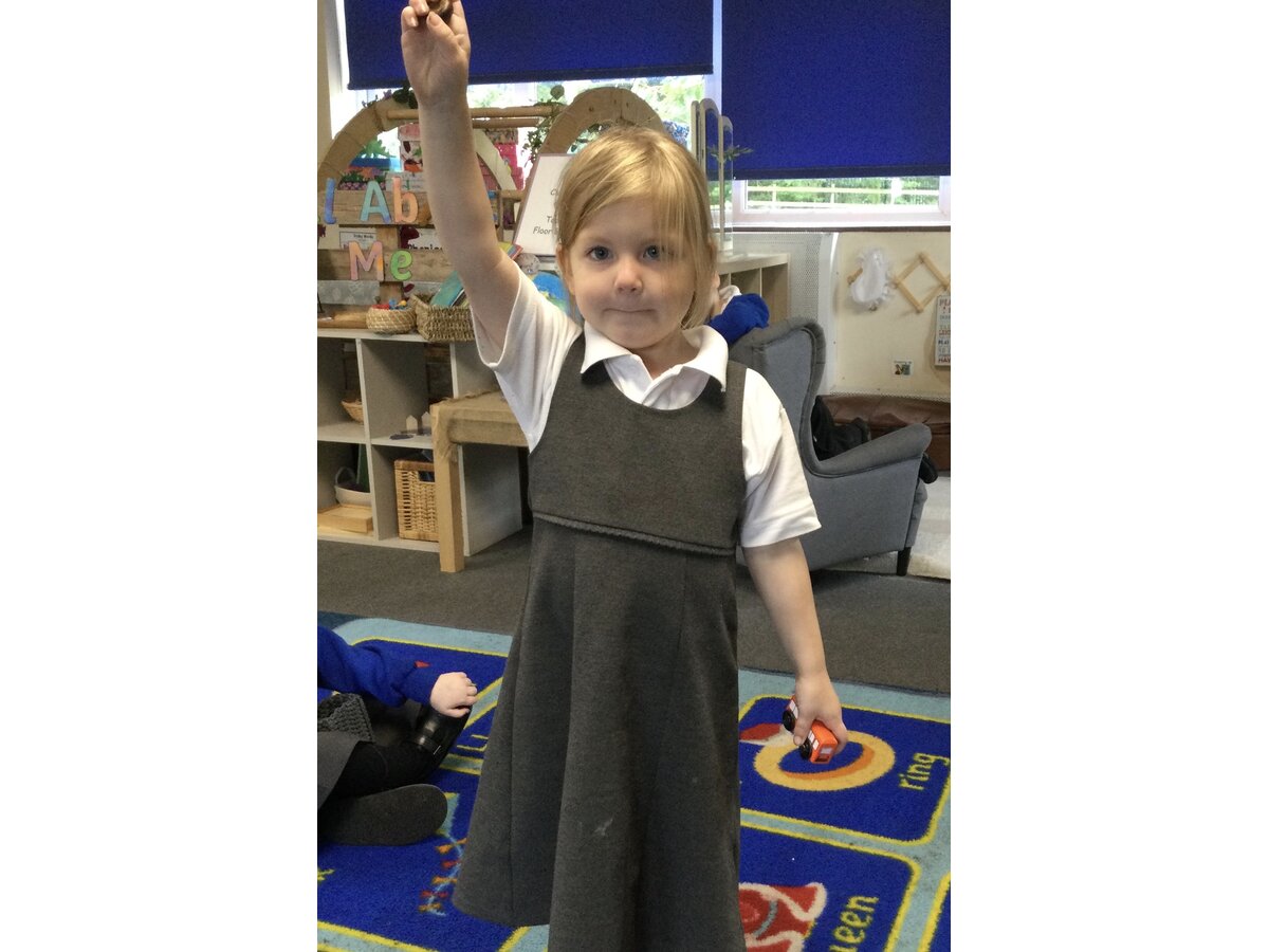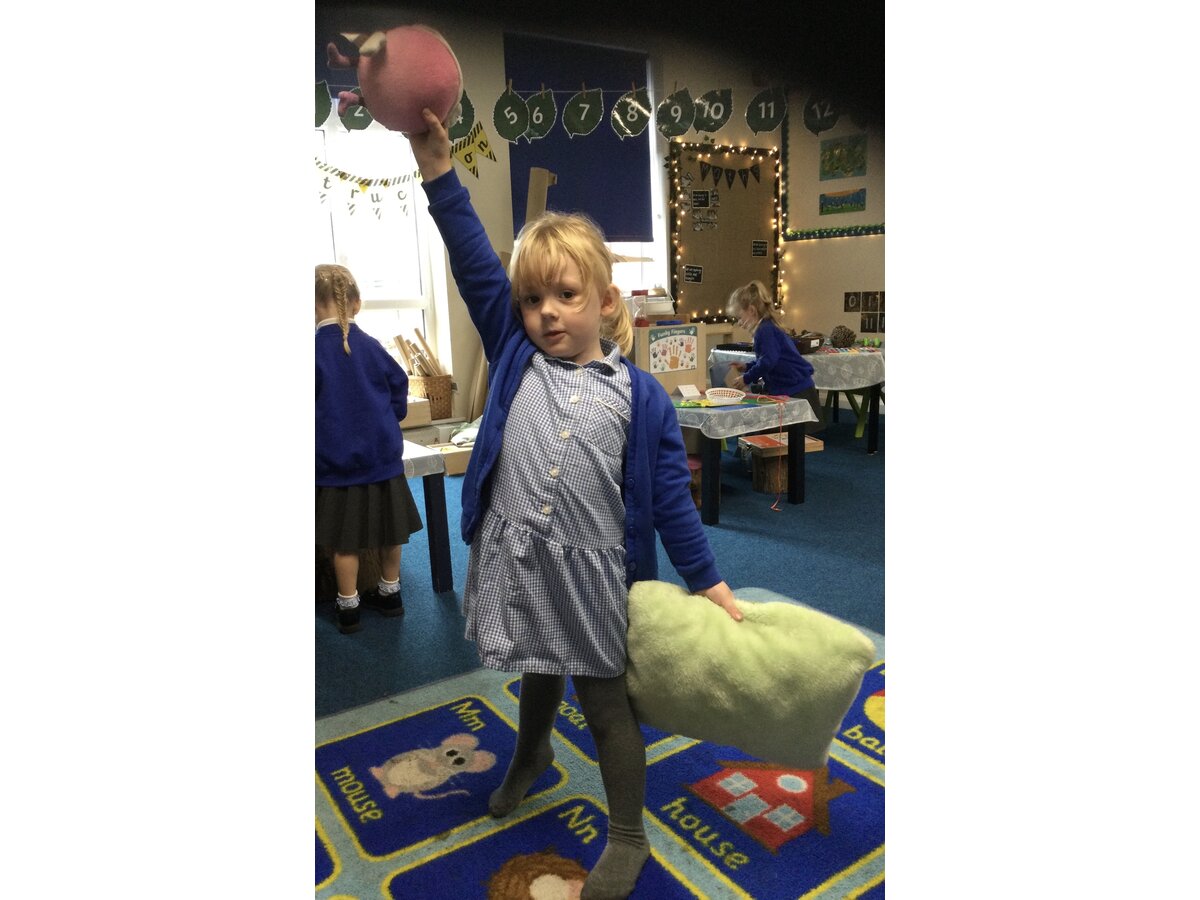 We used our bodies as a balance scale to compare the mass of two objects. If the object was the heaviest of the two items, the children knew to put their arm down and if the object was lighter, their arm went up.