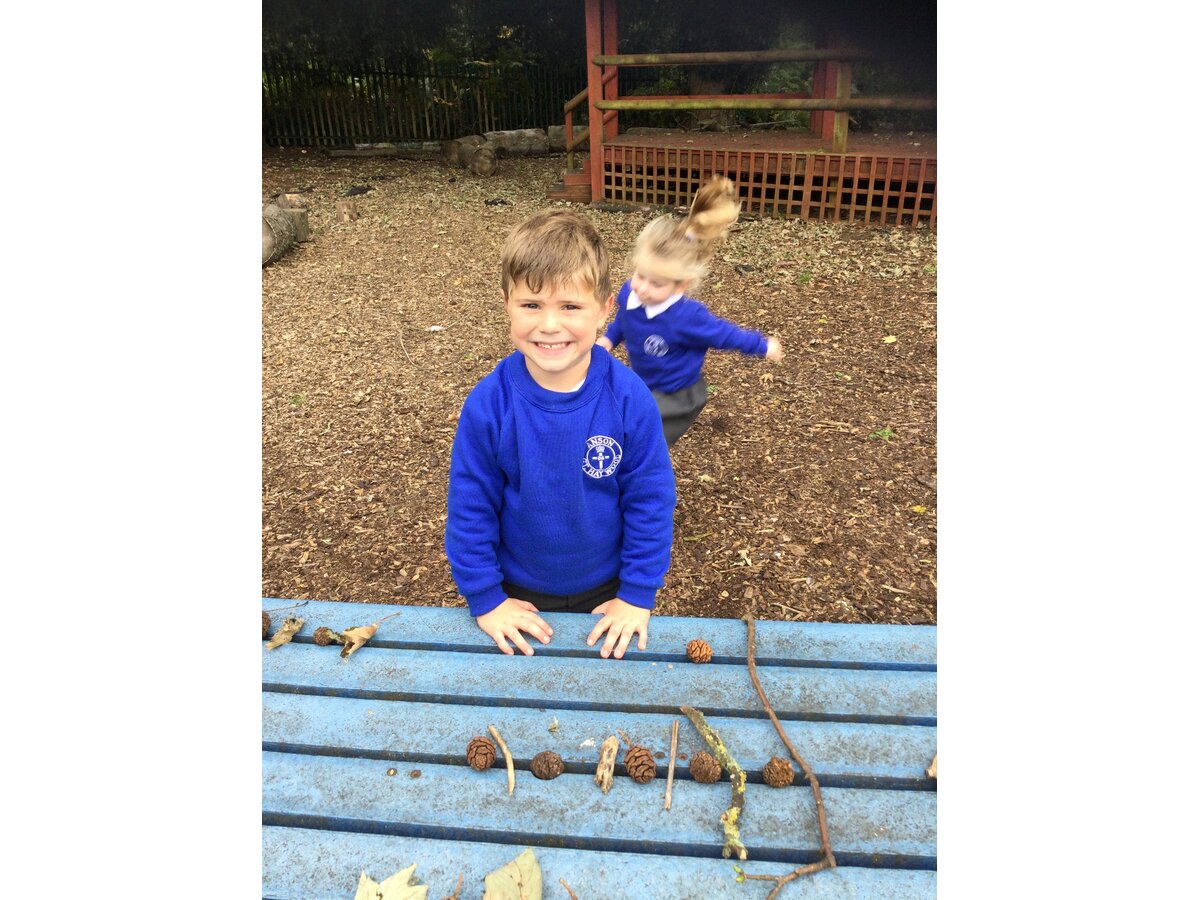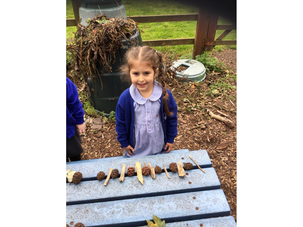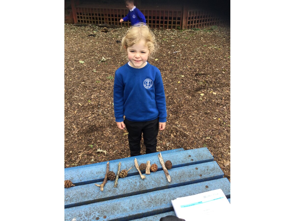 In our maths sessions this week, we are exploring patterns. This afternoon after looking at some repeating patterns together in class, the children were challenged to create their own repeating pattern using natural resources they found in our outdoor classroom.