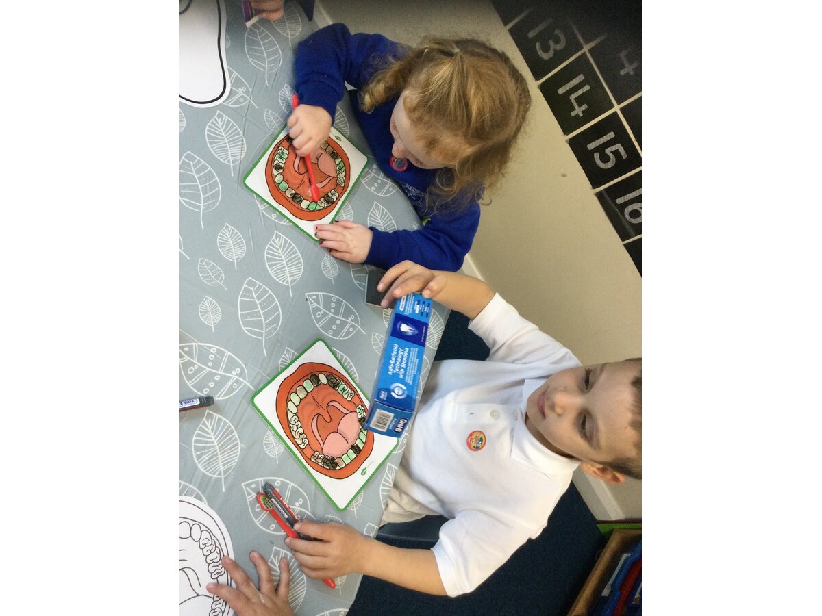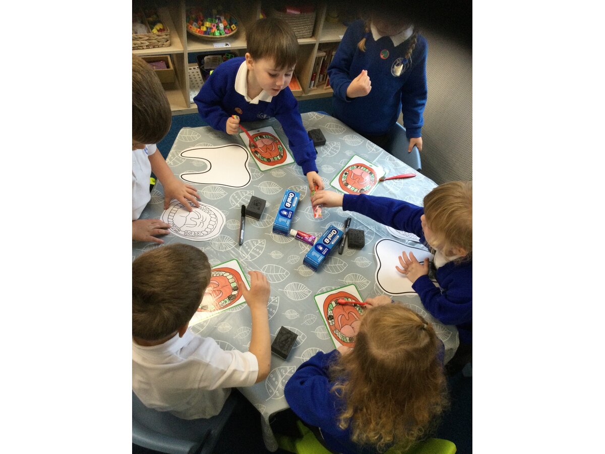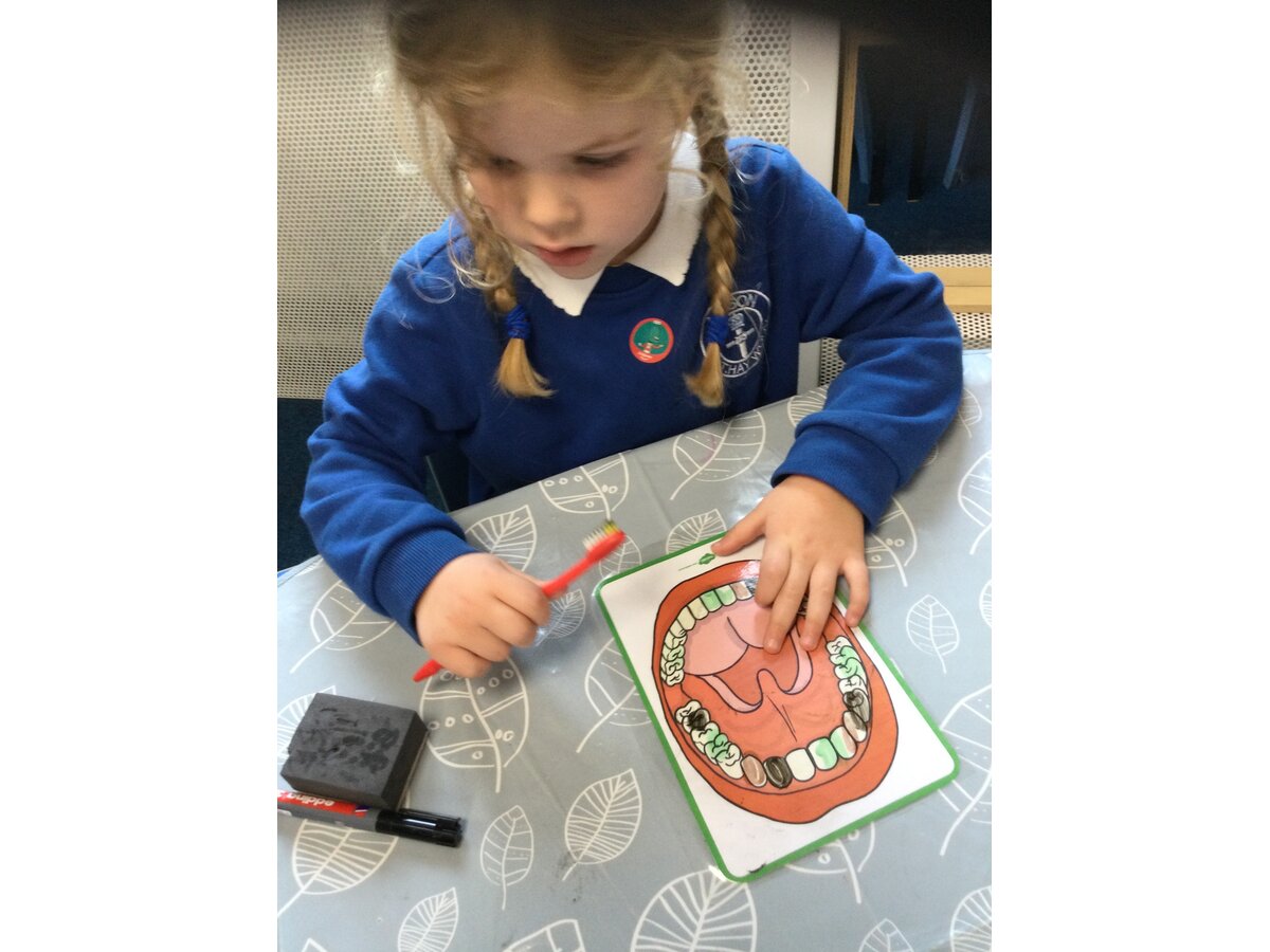 We have practised brushing teeth correctly, choosing healthy foods and drinks for our teeth and have learnt lots of facts about our teeth. We have watched videos of what happens when we visit a dentist and enjoyed teeth brushing songs.