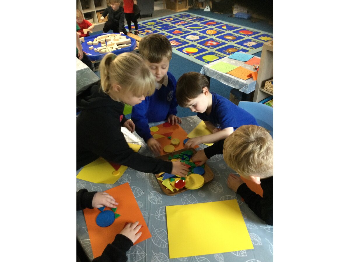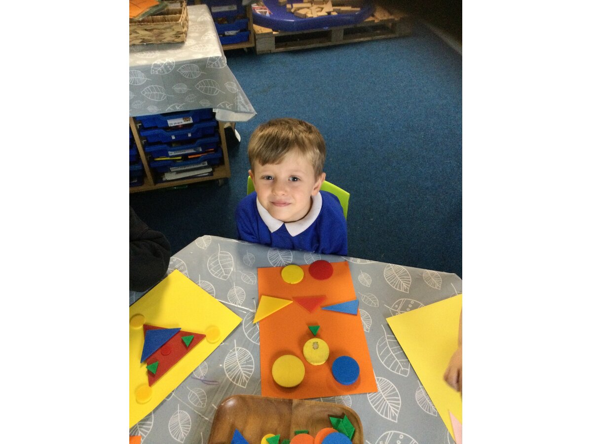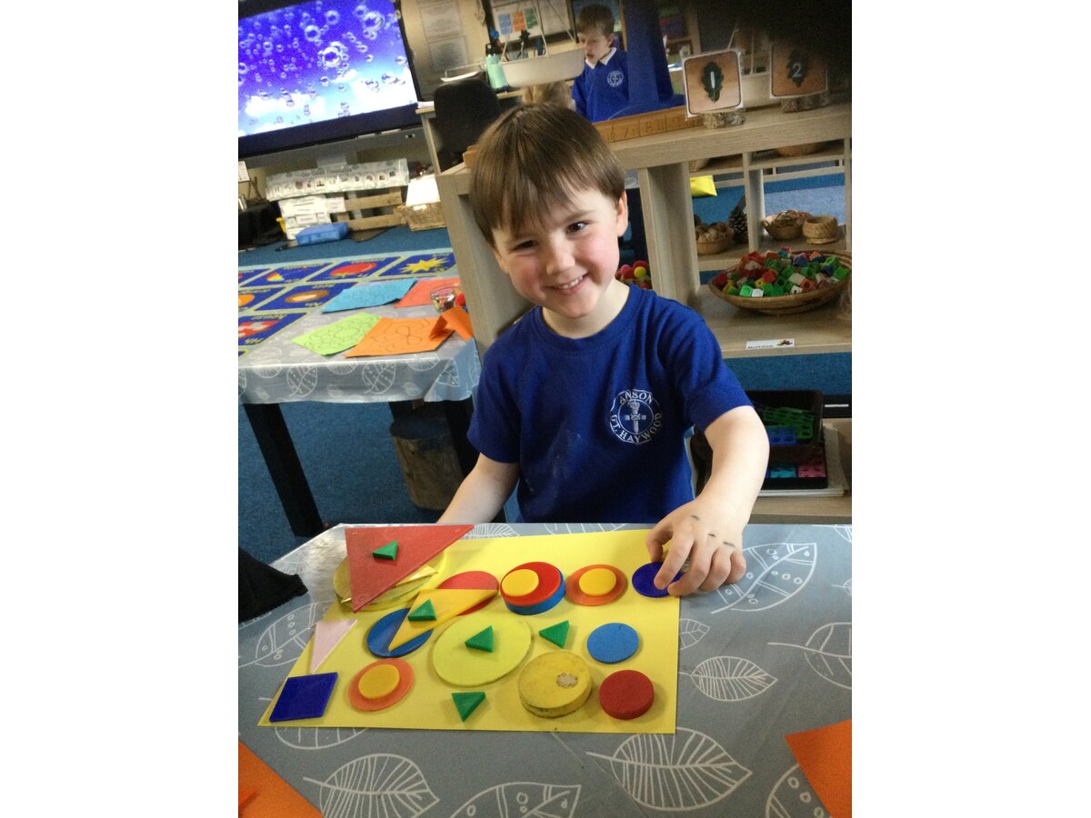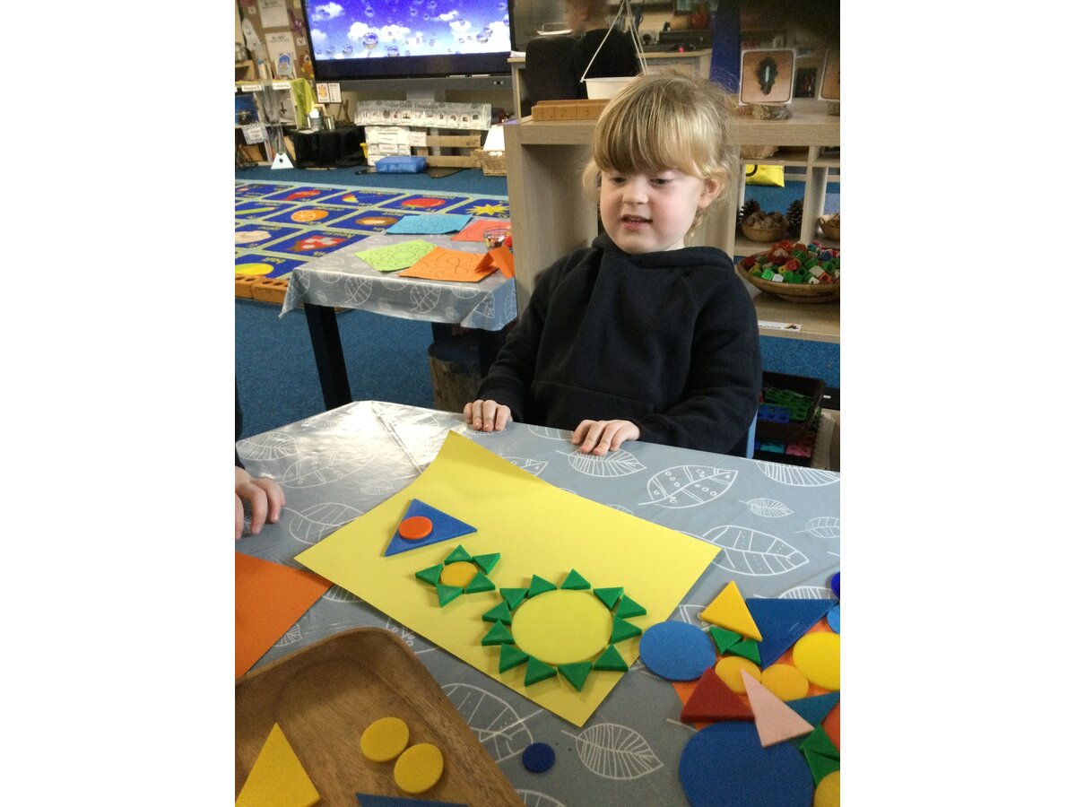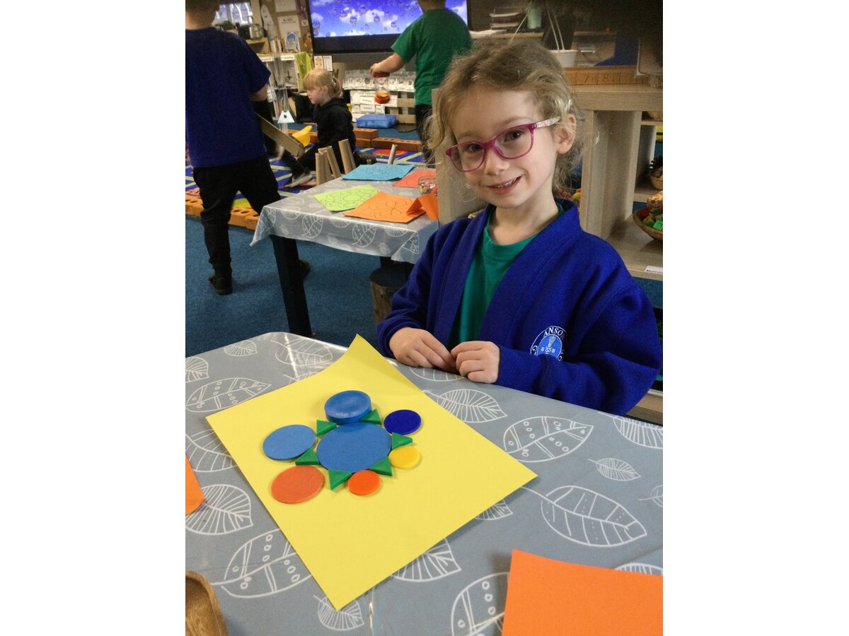 In our maths today, Class 1 have been exploring circles and triangles. We have talked about what makes a circle a circle and why a triangle is a triangle. We played a game where we had to listen to clues to determine what shape Mrs Philp was hiding in her bag and then we got creative.