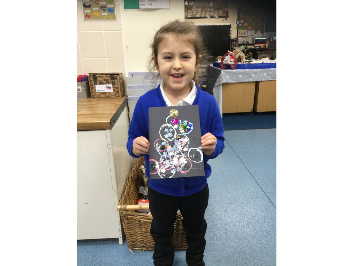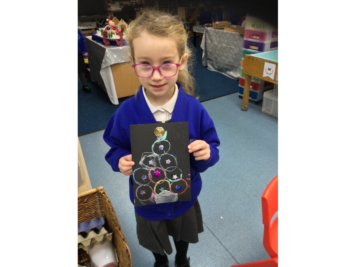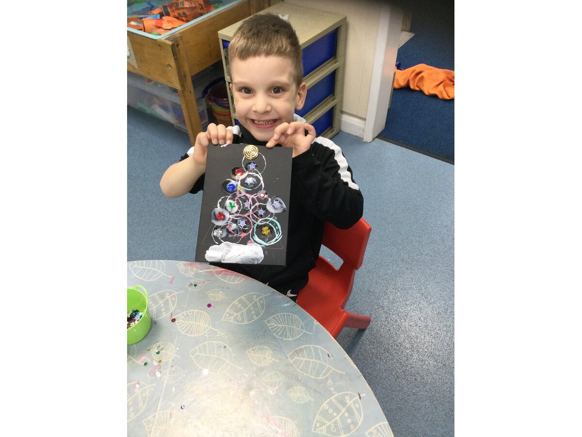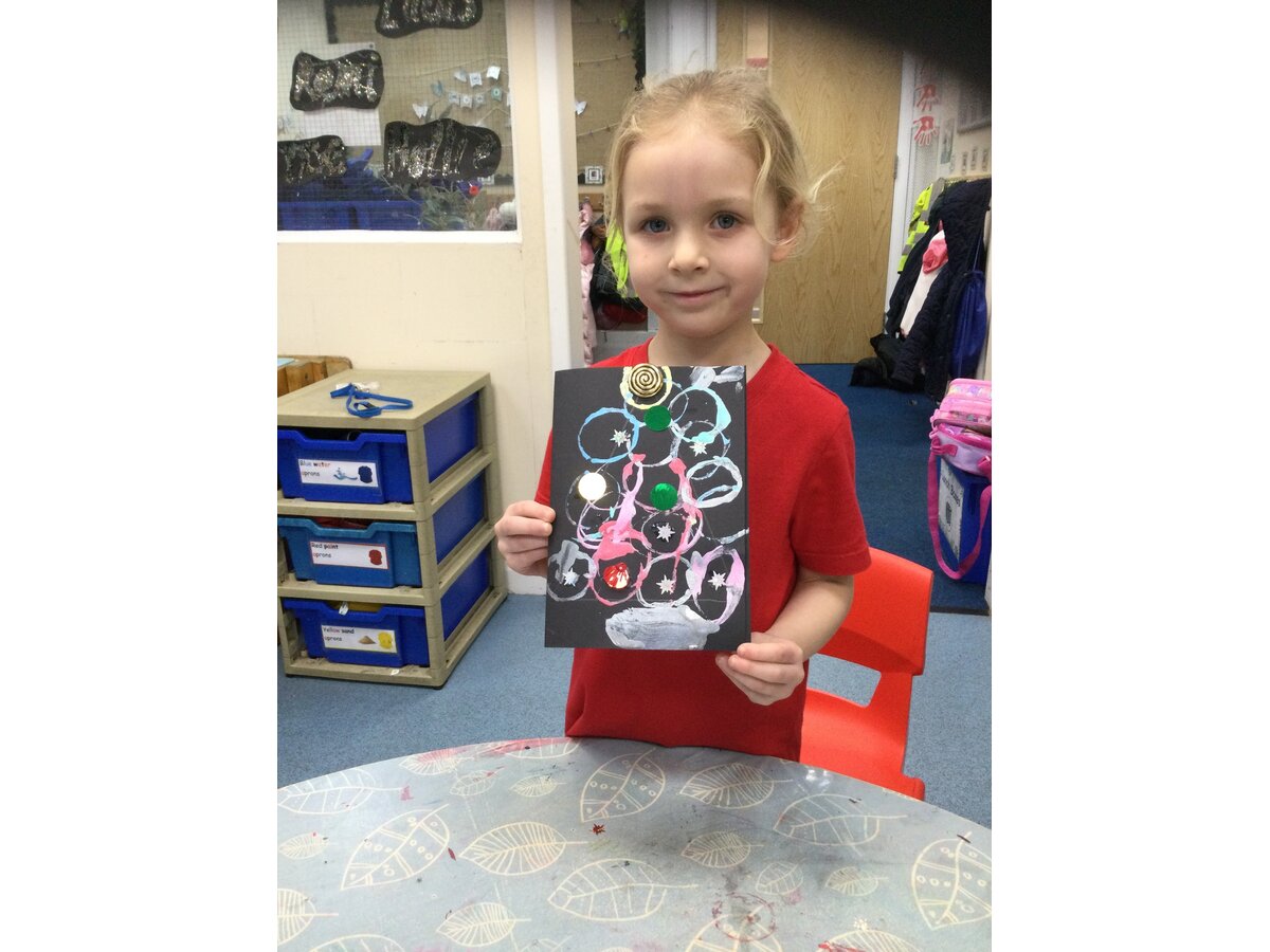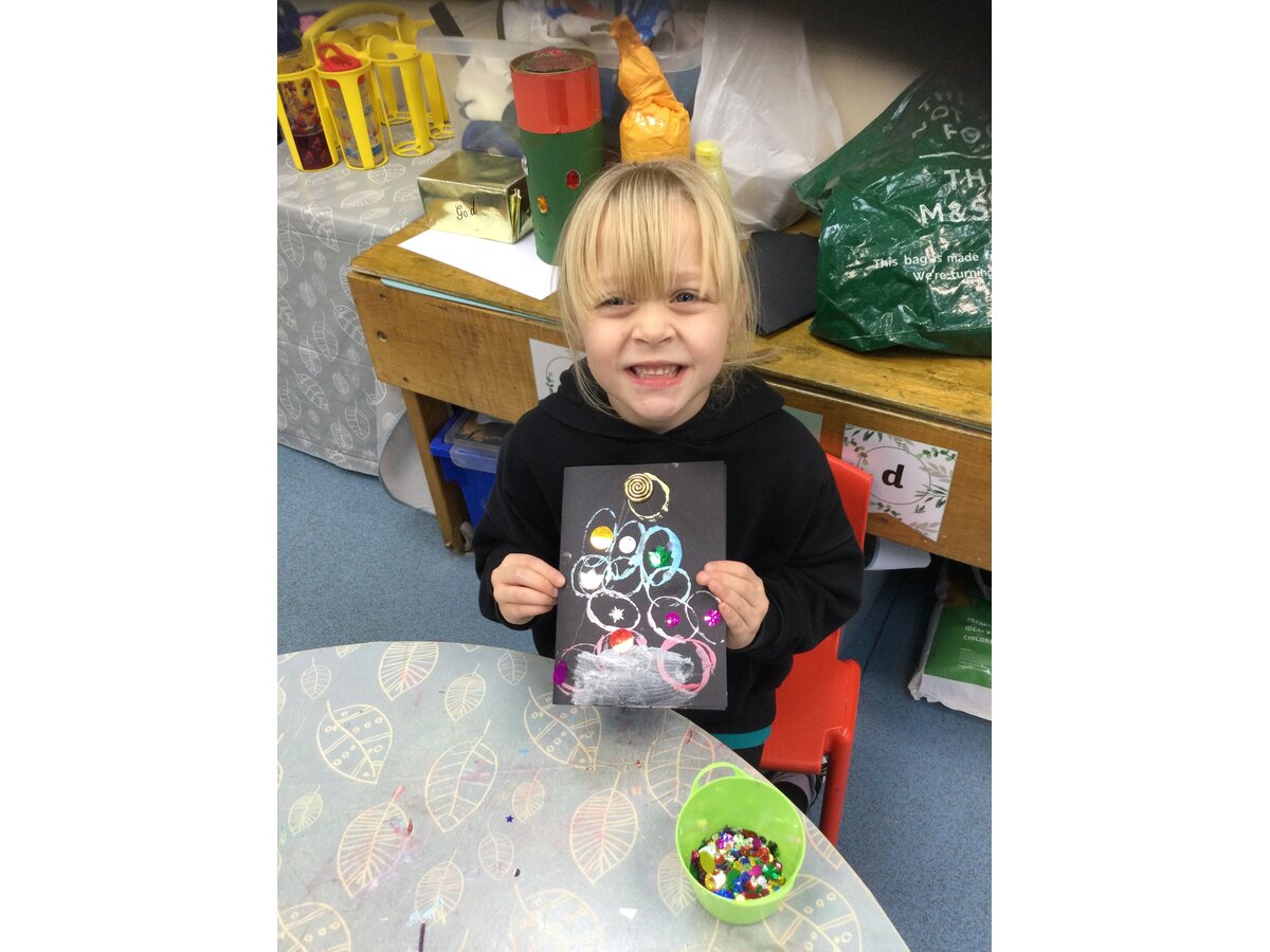 All the children worked so carefully using their printing skills to design and create their Christmas tree on the front of their card. The children then used cotton buds to carefully place glue dots to enable them to add decorations to their trees in their own unique design.