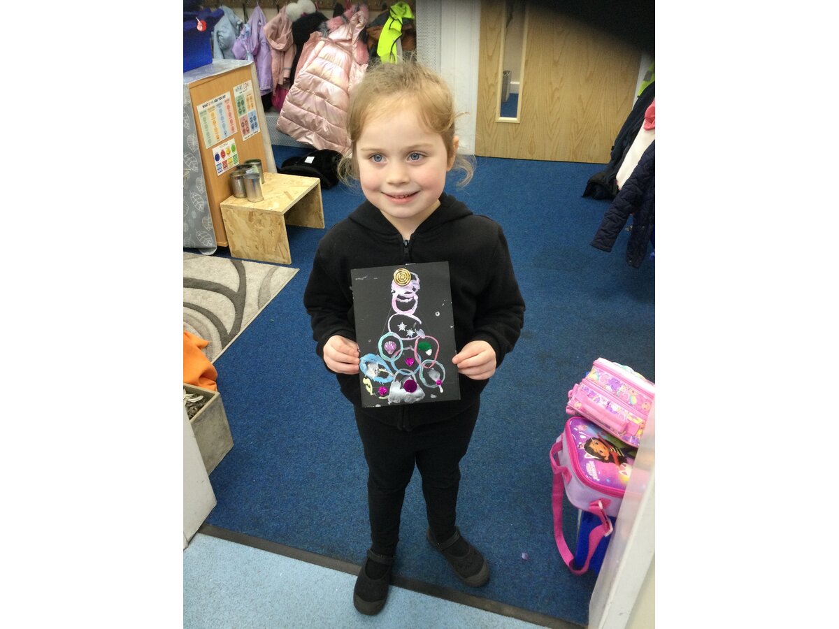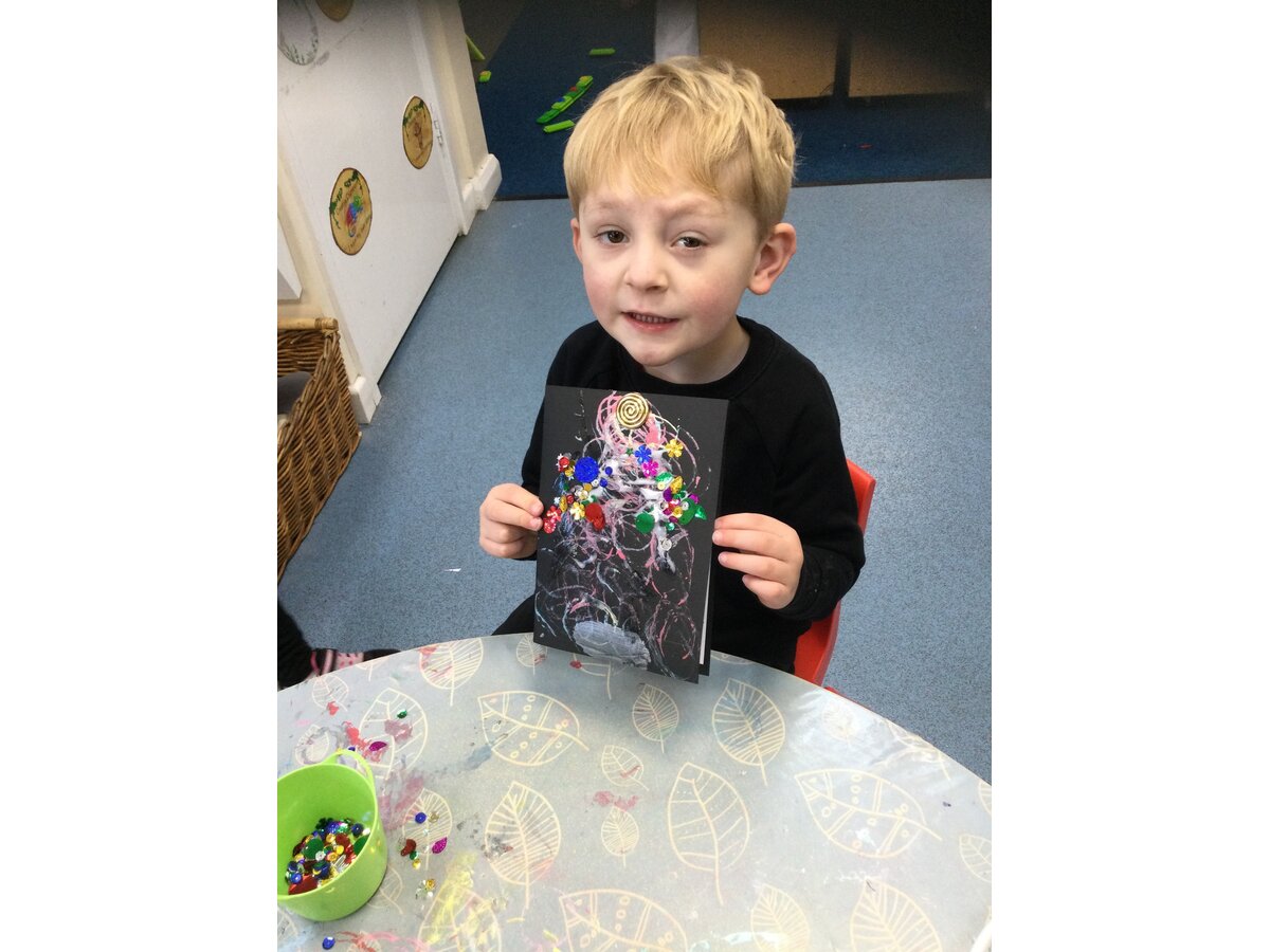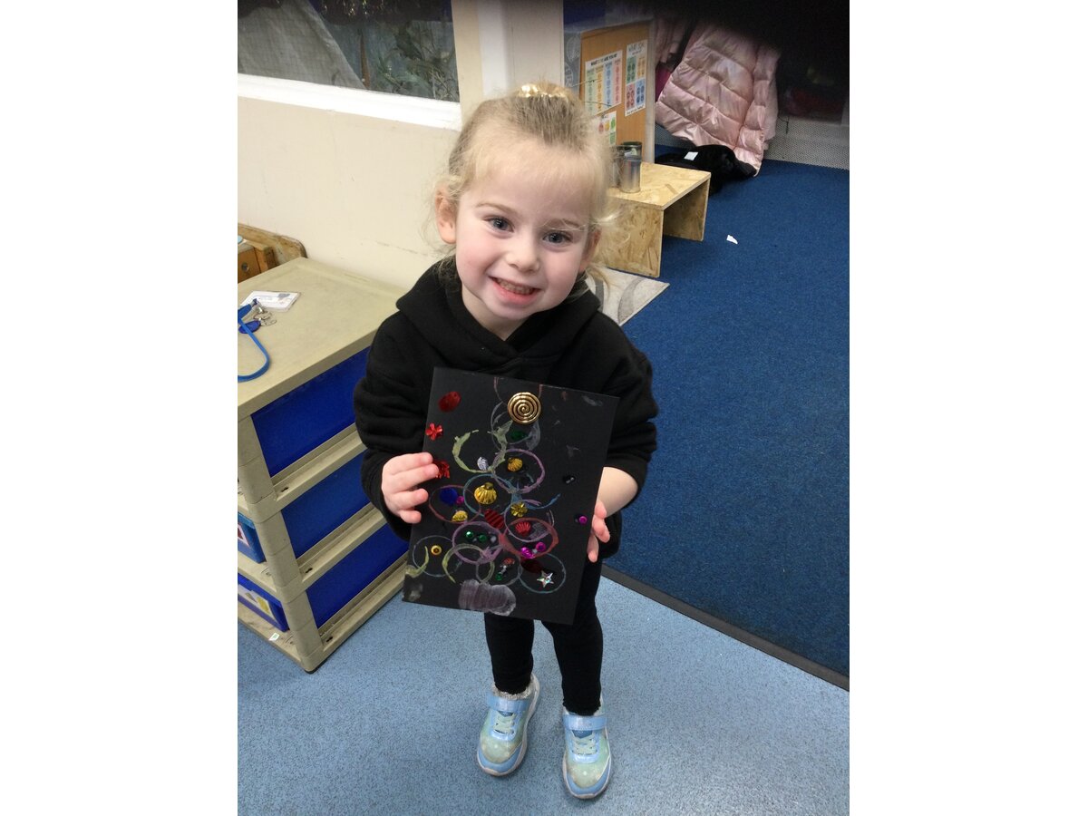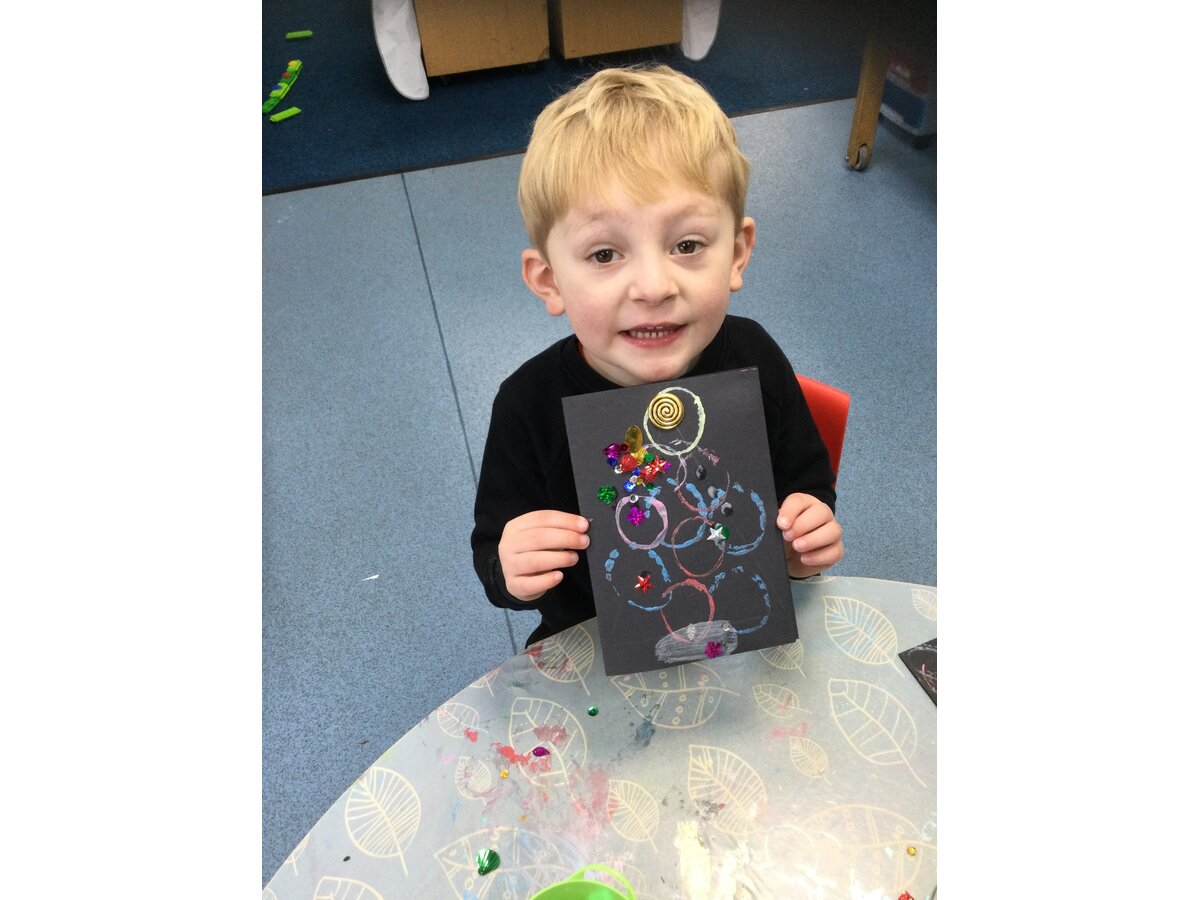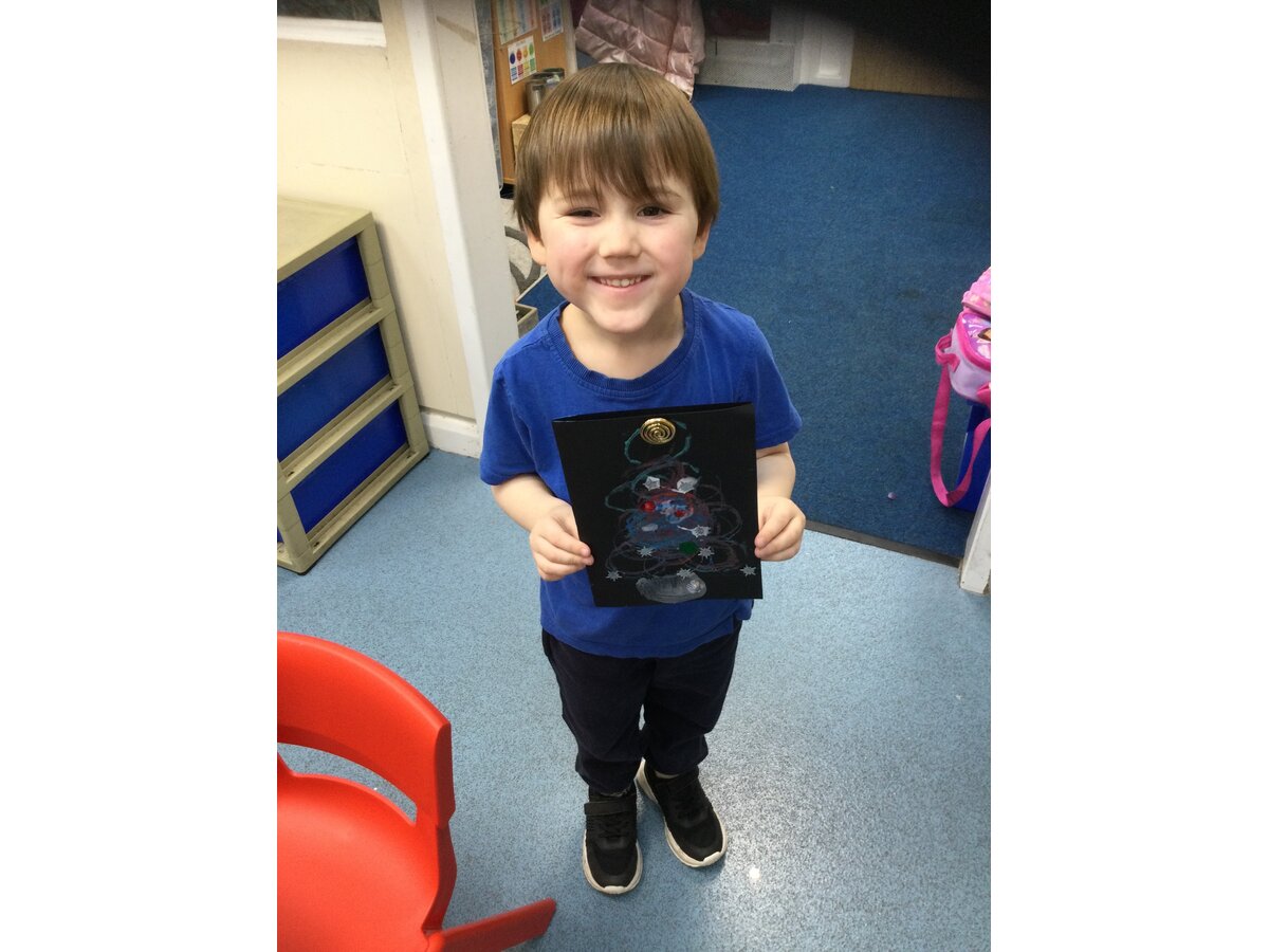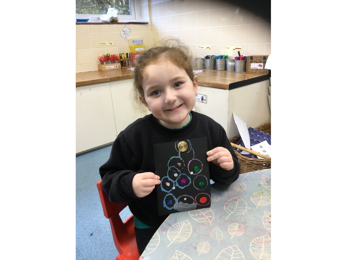 All the children worked so carefully using their printing skills to design and create their Christmas tree on the front of their card. The children then used cotton buds to carefully place glue dots to enable them to add decorations to their trees in their own unique design.