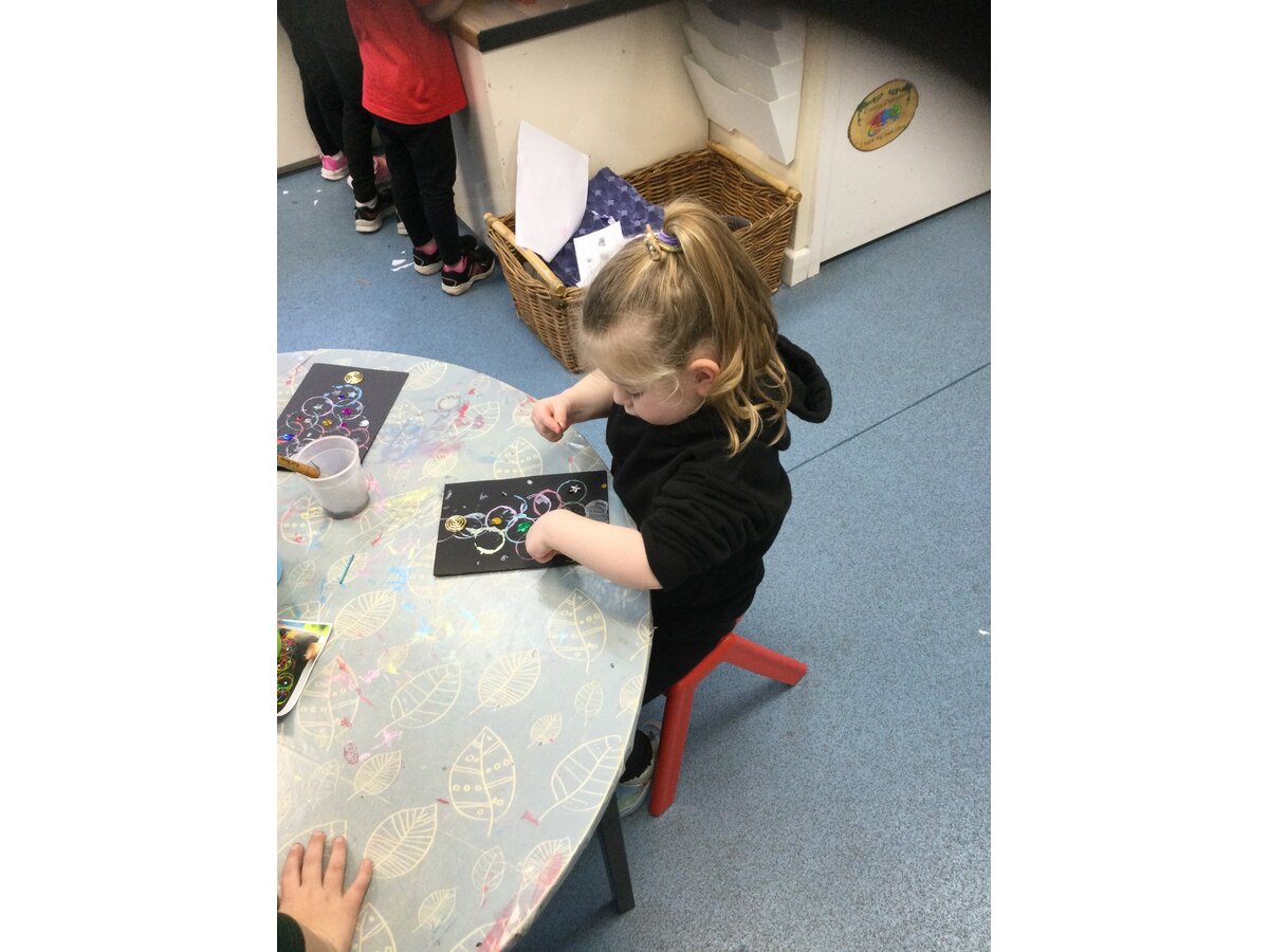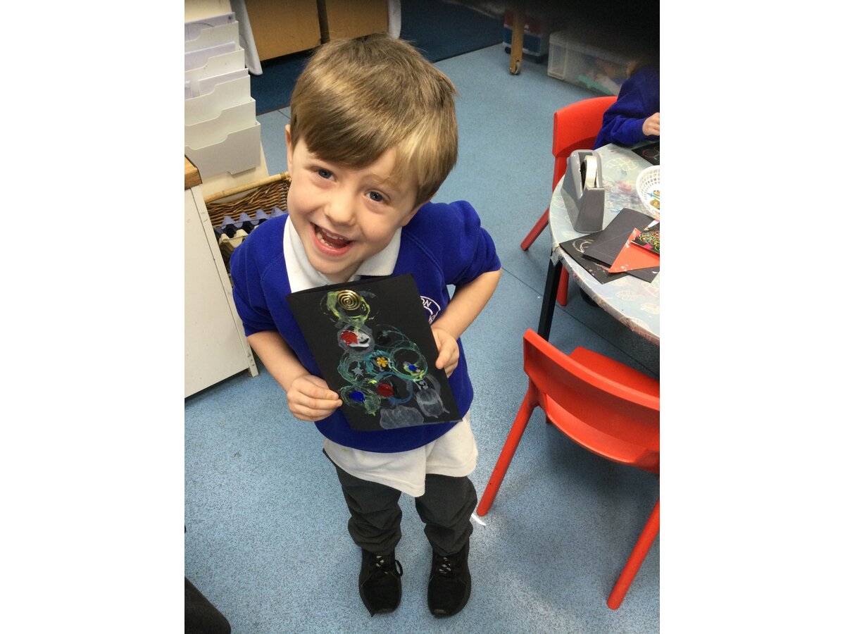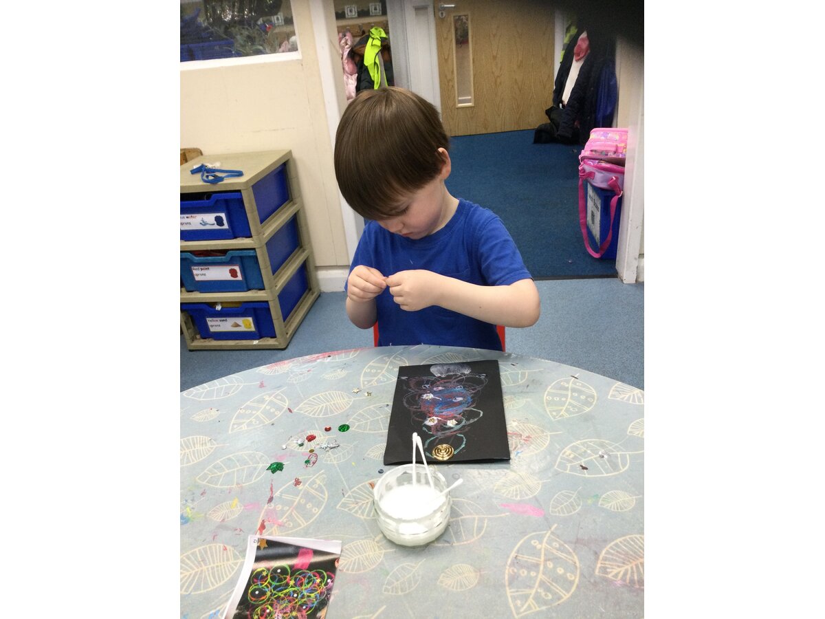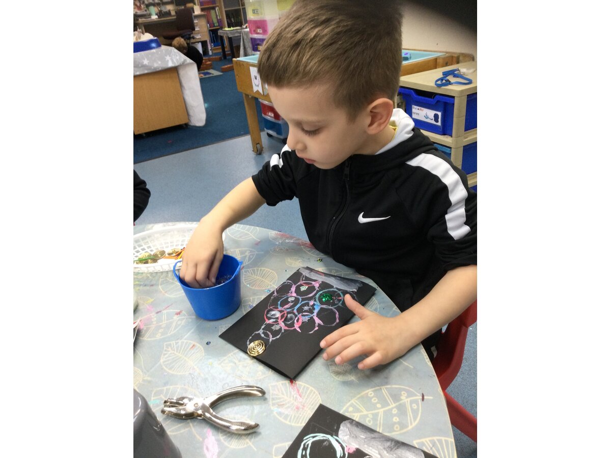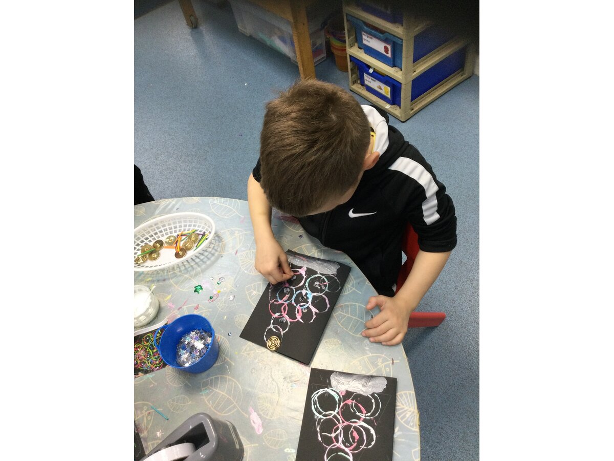 All the children worked so carefully using their printing skills to design and create their Christmas tree on the front of their card. The children then used cotton buds to carefully place glue dots to enable them to add decorations to their trees in their own unique design.