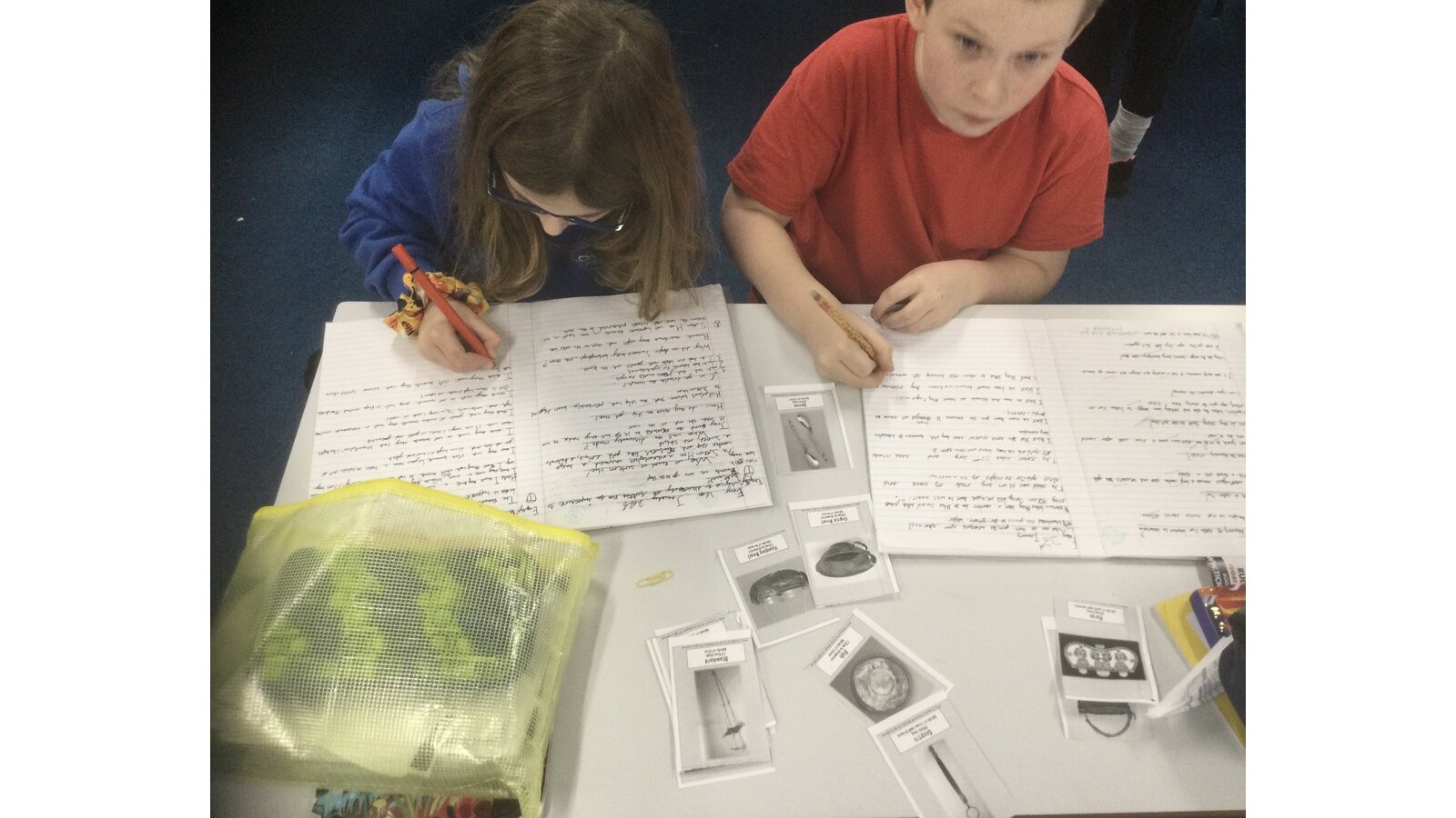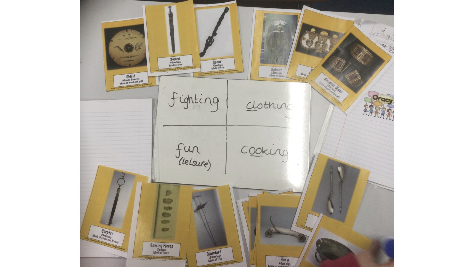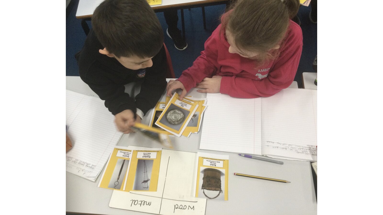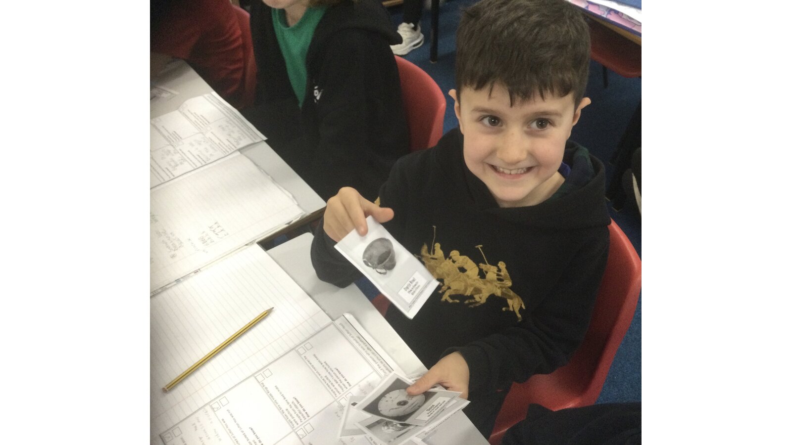 Last week we learnt about the Anglo Saxon boat that was discovered at Sutton Hoo in 1939. We read lots of information about it and discussed how it may have got there and how the condition of the soil preserved it so well, making it one of the most exciting hoards ever found. This afternoon we became the Historians by looking at photos of artefacts uncovered during the dig and piecing together the clues to try and build a better picture of who the person buried in the ship might have been. We came up with ideas such as ‘he was a male who was a brave warrior because he was buried with his sword and shield and only men would have gone to battle.’ We also believe the jewels on his helmet along with the gold coins in an intricately designed purse show he was a rich man.